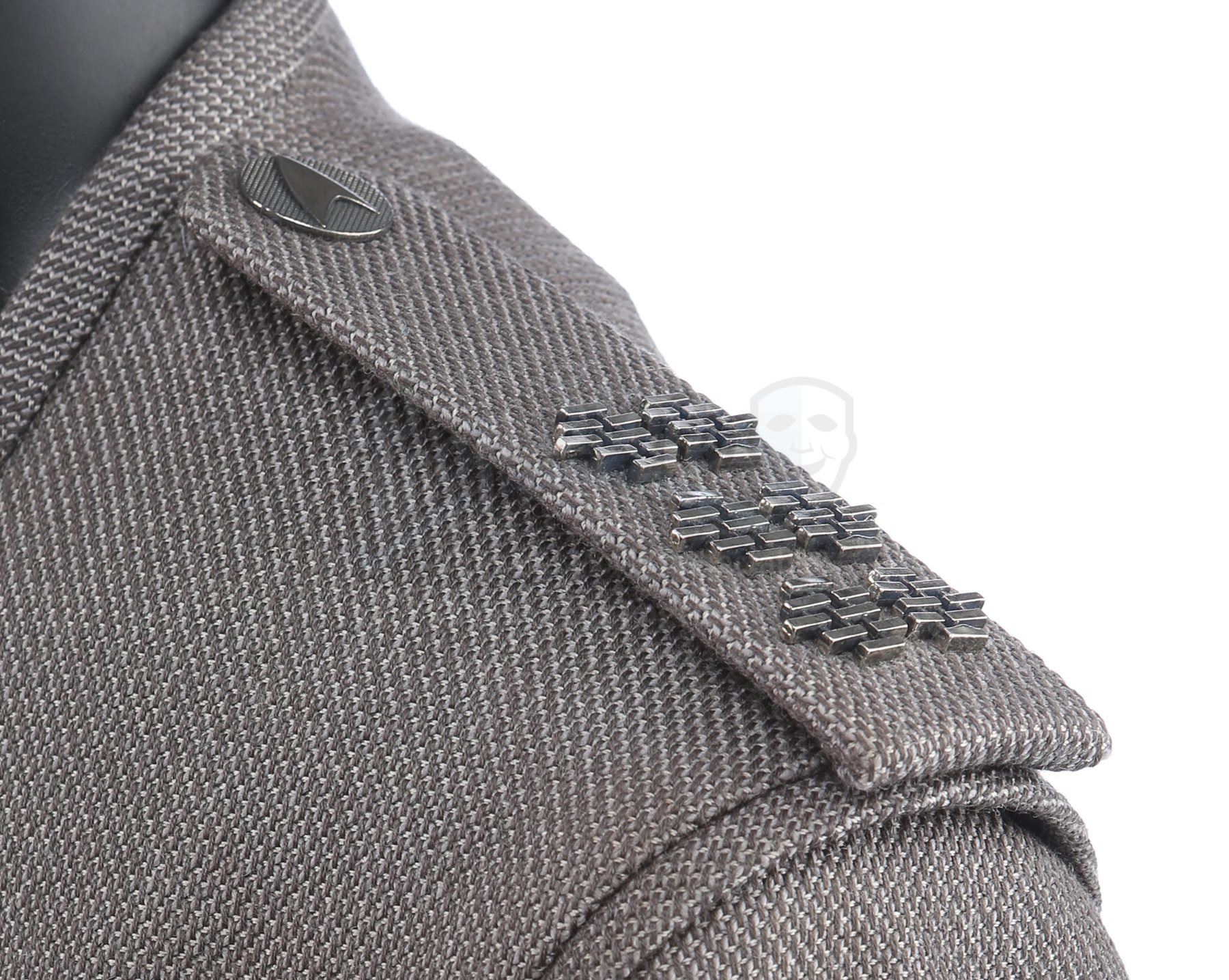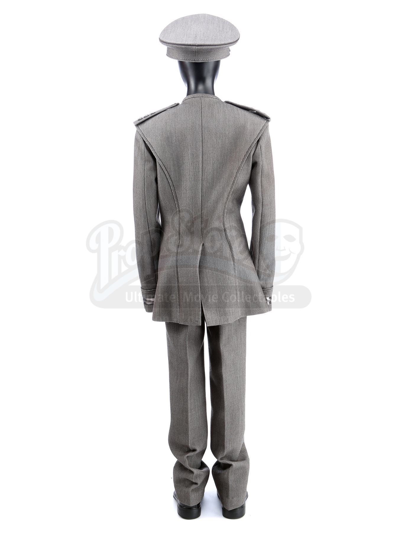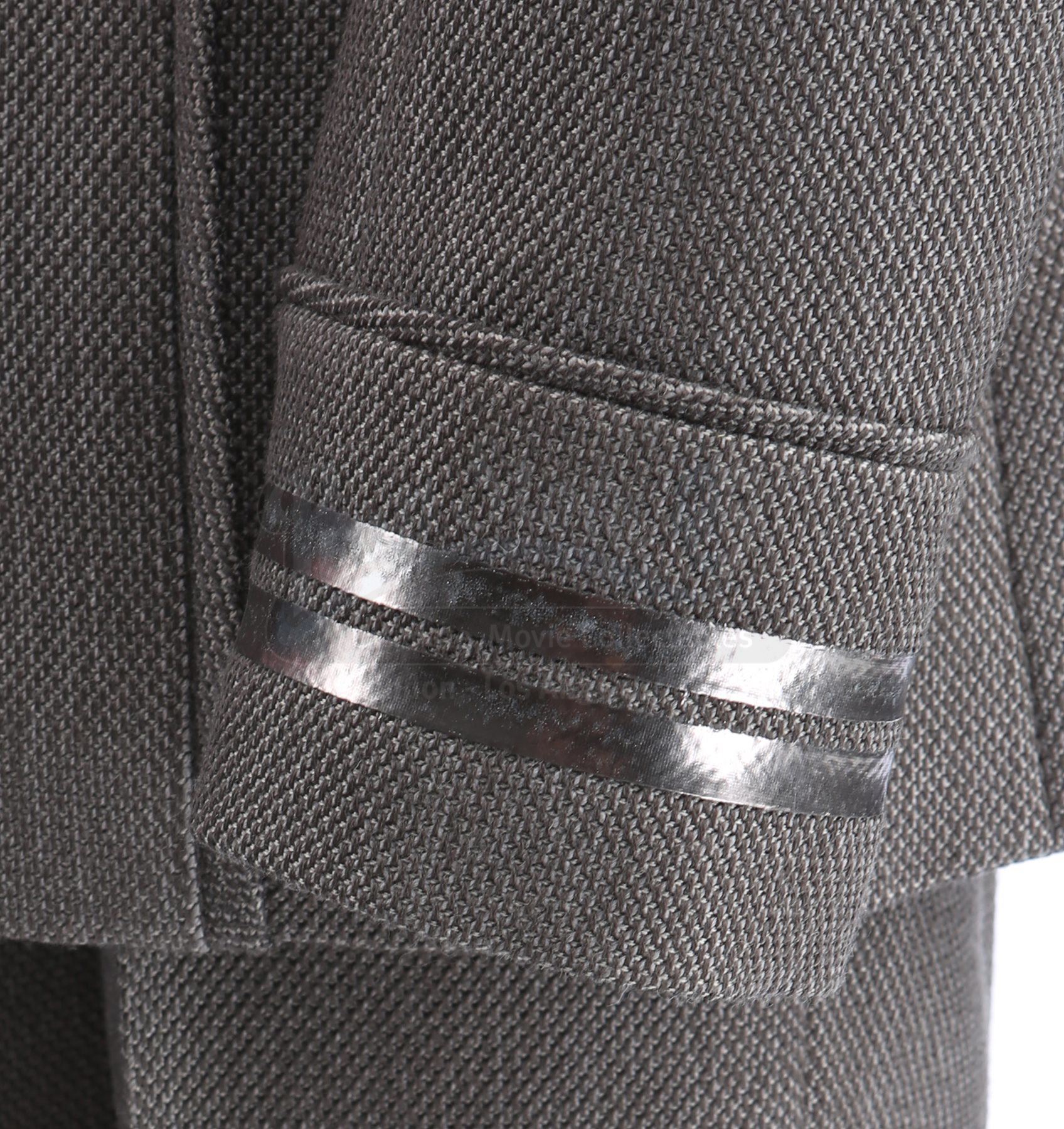 The grey jacket is made of bird's eye-patterned linen and features epaulets on each shoulder and two silver bands on the wrists. The undershirt consists of a black Spandex sport shirt. The grey pants are also made of bird's eye-patterned linen and include a pair of black elastic suspenders. The peaked-style cap is made of the same linen and features metal Starfleet pins attached to the front. Also included is a pair of black leather ankle boots with rubber soles. The boots are the proper type for the costume; they were used in the production but not specifically by this character.