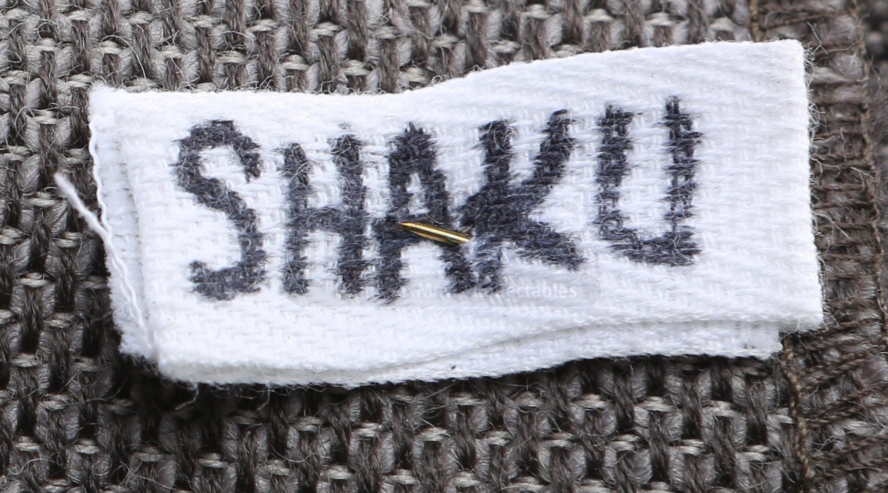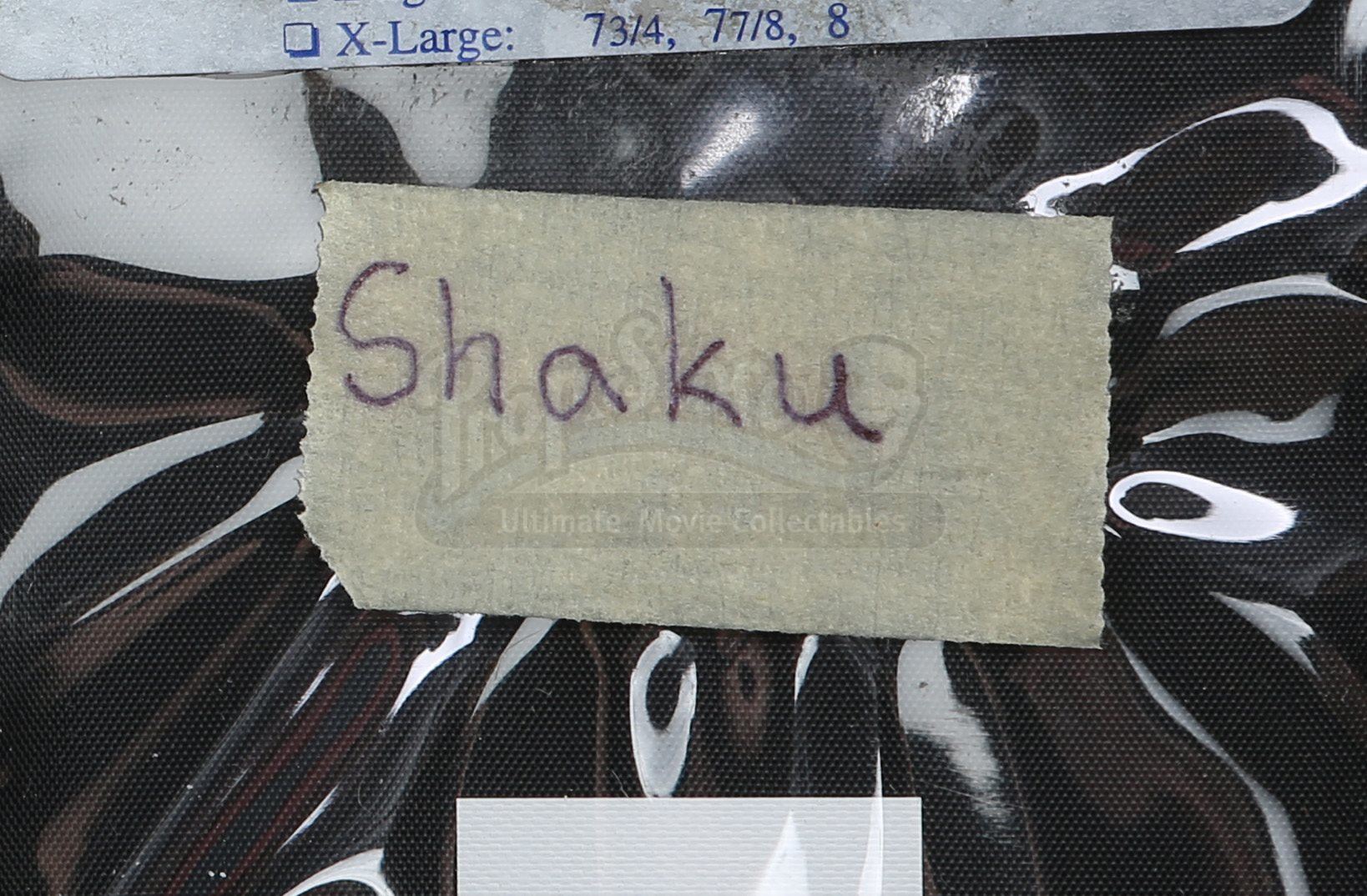 The costume features hand-written wardrobe labels with the jacket, pants, boots and cap marked as "Shaku". Also included are wardrobe tags with hand-written notes about the costume.