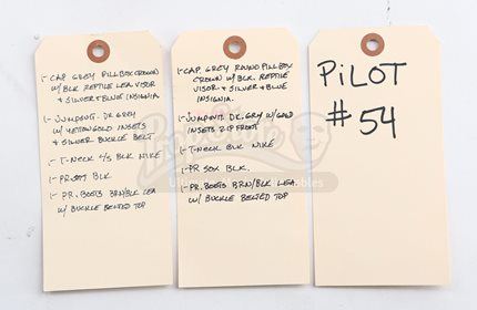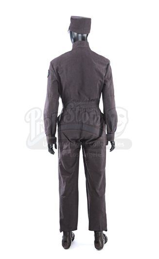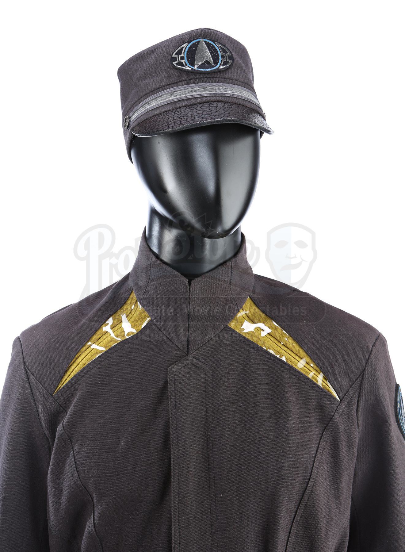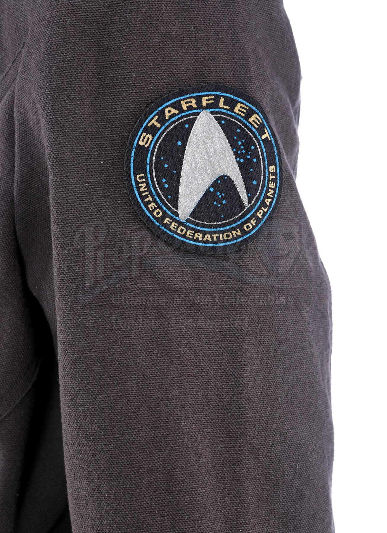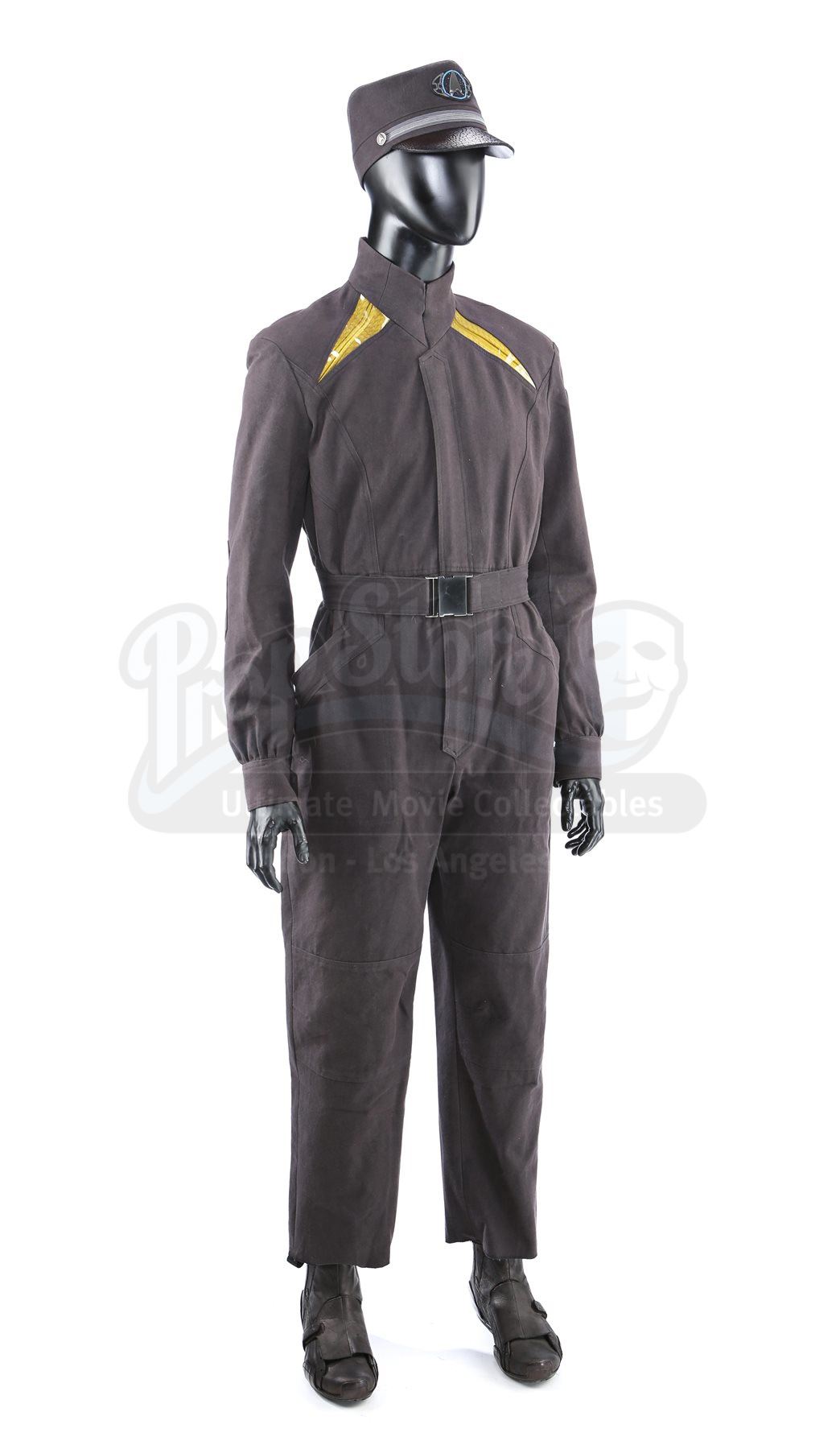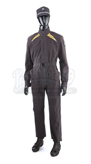 A shuttle pilot flight suit from Star Trek Into Darkness. A shuttle pilot wore his uniform when escorting the Enterprise crew to their ship. The costume includes a jumpsuit (marked size 40), an undershirt (medium), a hat, and a pair of leather shoes (marked U.S. size 10). The charcoal grey jumpsuit is made of heavy nylon and features two clear plastic windows on both front shoulders with gold-colored Spandex sewn on the inside to imitate a command tunic underneath. A foam Starfleet insignia patch is sewn onto the left shoulder and a chrome belt buckle is fastened to the waist. The undershirt consists of a black long-sleeved Spandex sport shirt. The pillbox hat is also made of charcoal grey nylon and features two Starfleet insignias, a Starfleet insignia patch and a scaled leather visor. Also included is a pair of black faux leather boots with rubber soles. Also included are wardrobe tags with hand-written notes about the costume.Estimate: $800 - 1000*Estimated sale price; sold without reserve.
