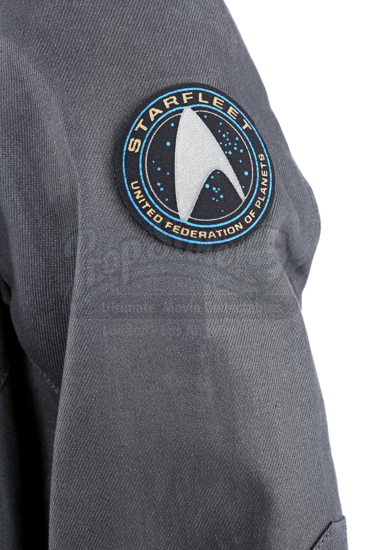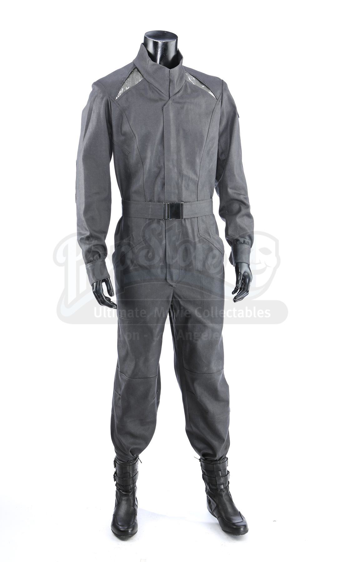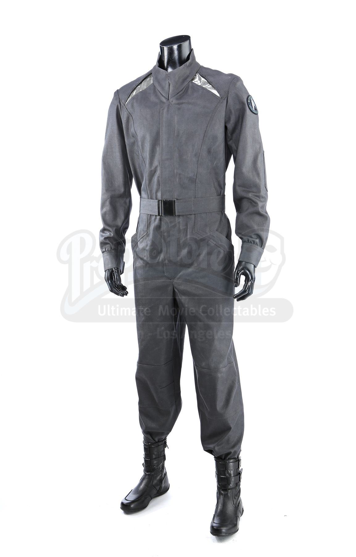 A Sprog alien's Starfleet Academy flight suit from Star Trek Into Darkness. The Starfleet flight suit was worn by background crewmembers before the Enterprise crew took off in their shuttle. The costume consists of a jumpsuit (approximate size medium) and a pair of boots (marked size U.S. size 8). The charcoal grey jumpsuit is made of heavy nylon and features a Starfleet insignia patch sewn onto the left shoulder. The costume features two clear plastic windows on both front shoulders with a silver synthetic material sewn on the inside. Fastened to the waist is a chrome belt buckle. Also included is a pair of black leather boots with rubber soles. The boots are the proper type for the costume; they were used in the production but not specifically by this character.The costume features a hand-written wardrobe label with the suit marked as "Sprog". Also included are wardrobe tags with hand-written notes about the costume.Estimate: $1000 - 1500*Estimated sale price; sold without reserve.