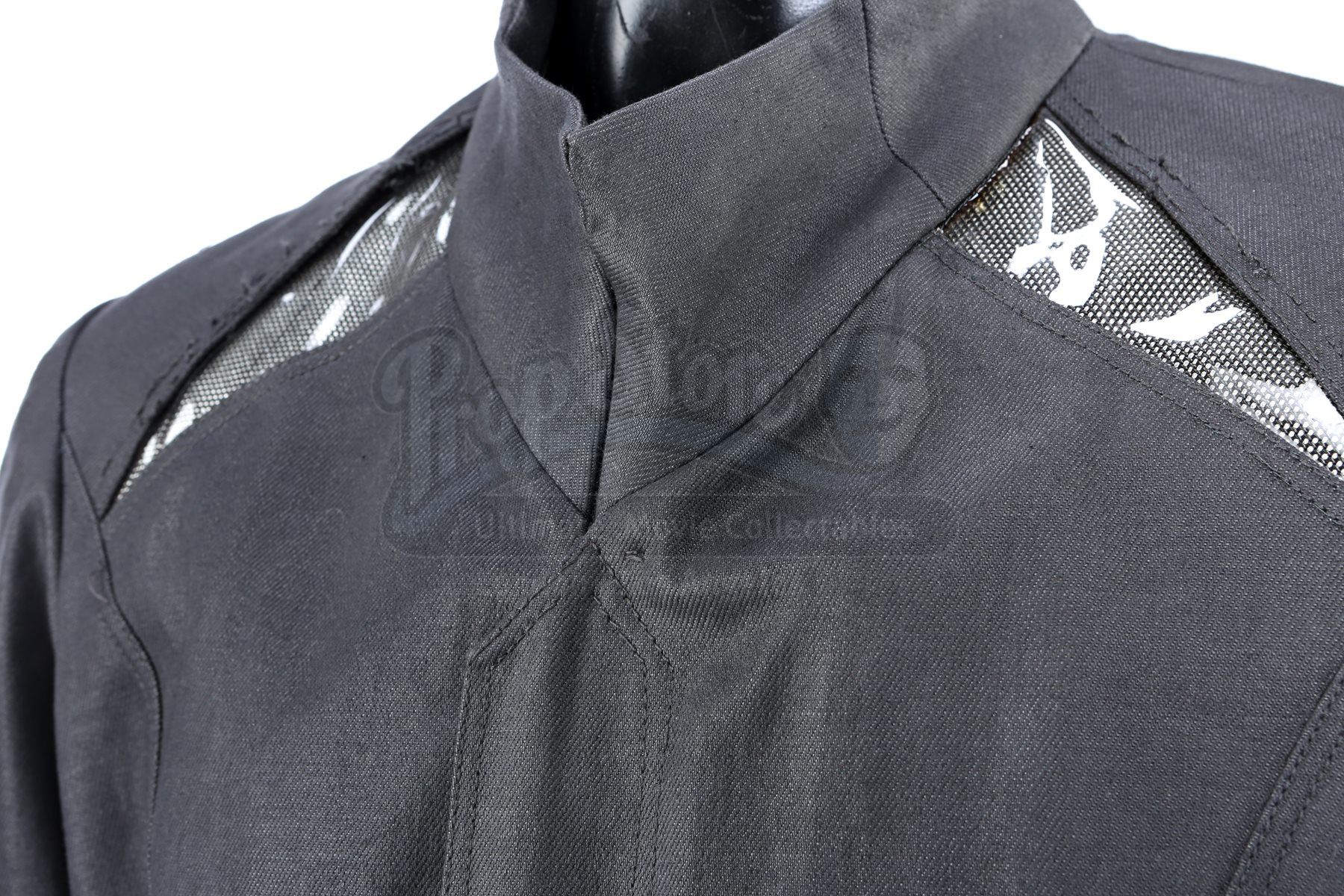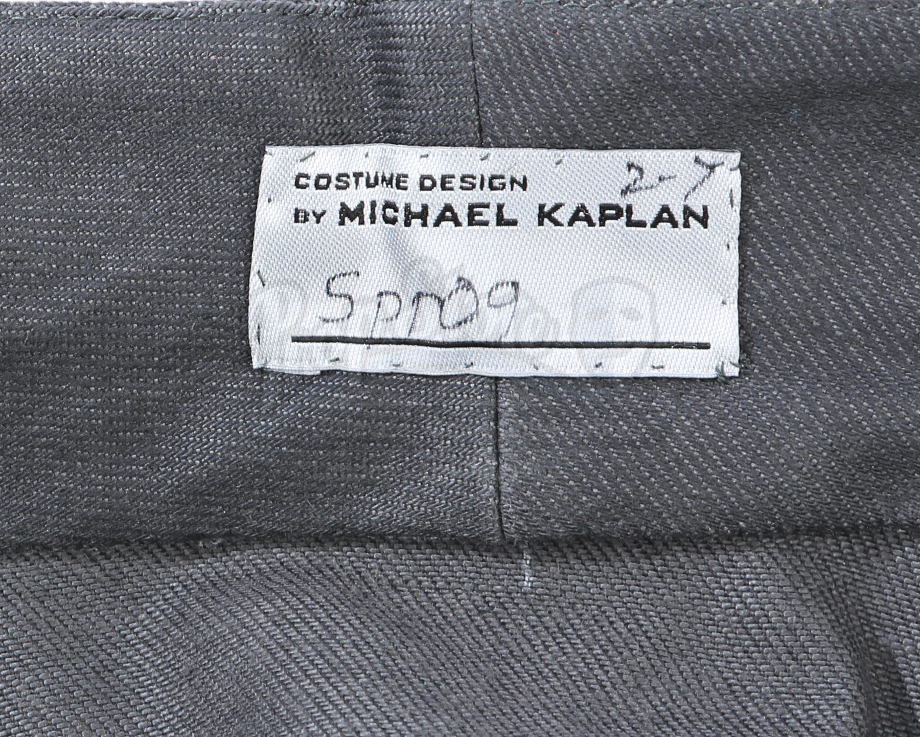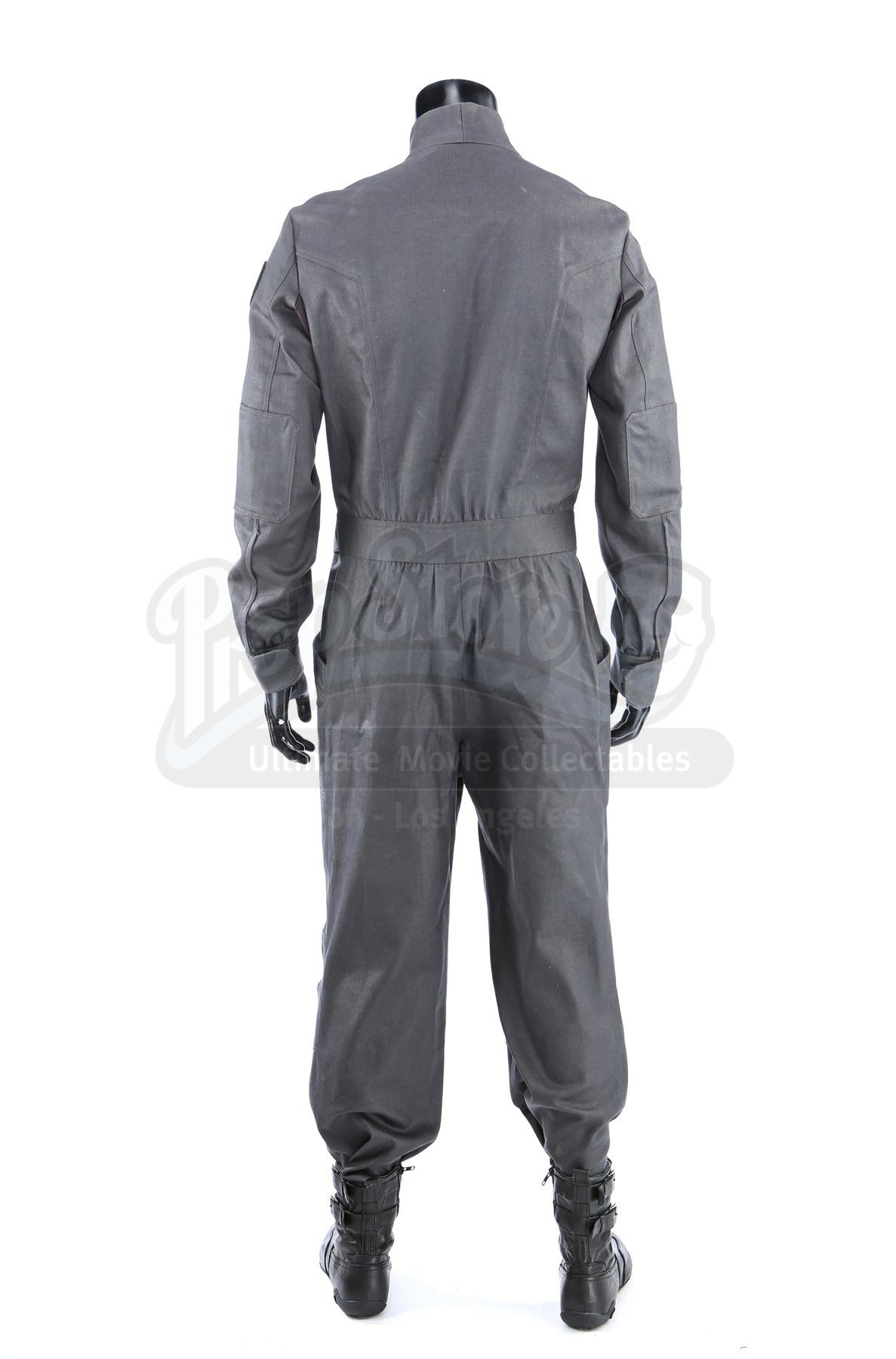 A Sprog alien's Starfleet Academy flight suit from Star Trek Into Darkness. The Starfleet flight suit was worn by background crewmembers before the Enterprise crew took off in their shuttle. The costume consists of a jumpsuit (approximate size medium) and a pair of boots (marked size U.S. size 8). The charcoal grey jumpsuit is made of heavy nylon and features a Starfleet insignia patch sewn onto the left shoulder. The costume features two clear plastic windows on both front shoulders with a silver synthetic material sewn on the inside. Fastened to the waist is a chrome belt buckle. Also included is a pair of black leather boots with rubber soles. The boots are the proper type for the costume; they were used in the production but not specifically by this character.The costume features a hand-written wardrobe label with the suit marked as "Sprog". Also included are wardrobe tags with hand-written notes about the costume.Estimate: $1000 - 1500*Estimated sale price; sold without reserve.