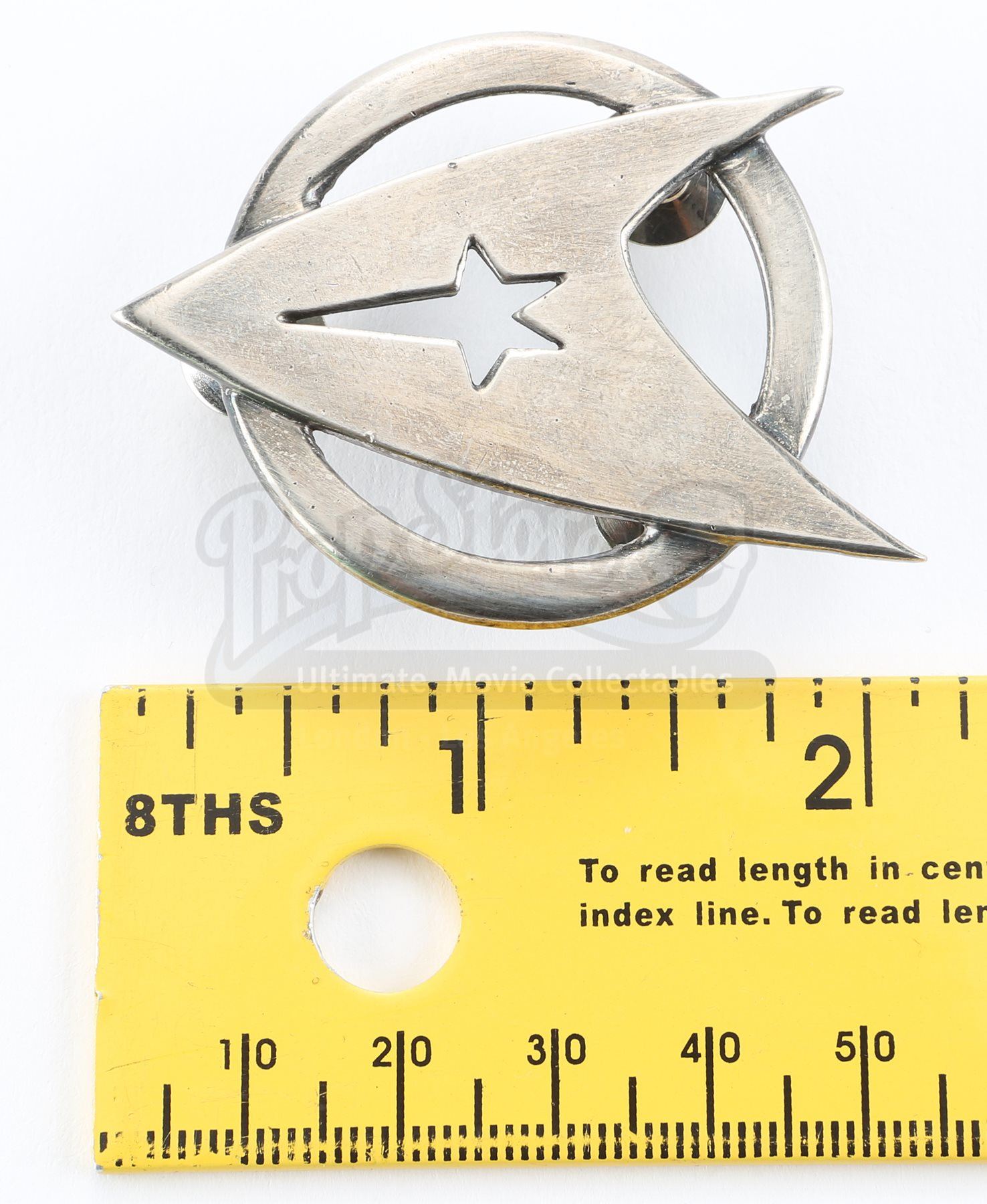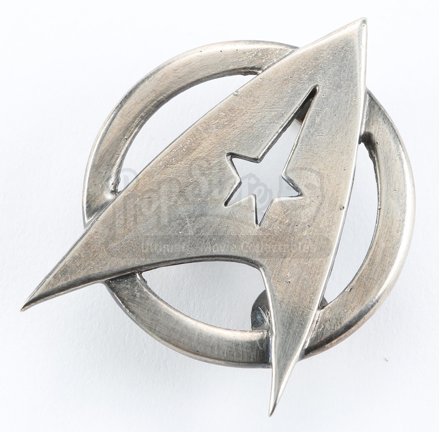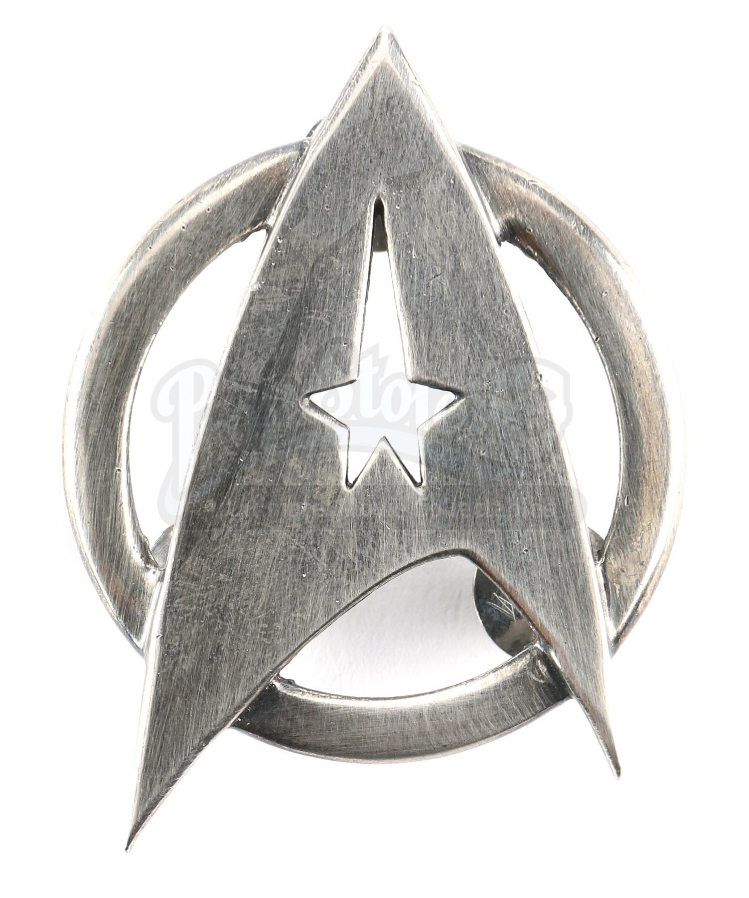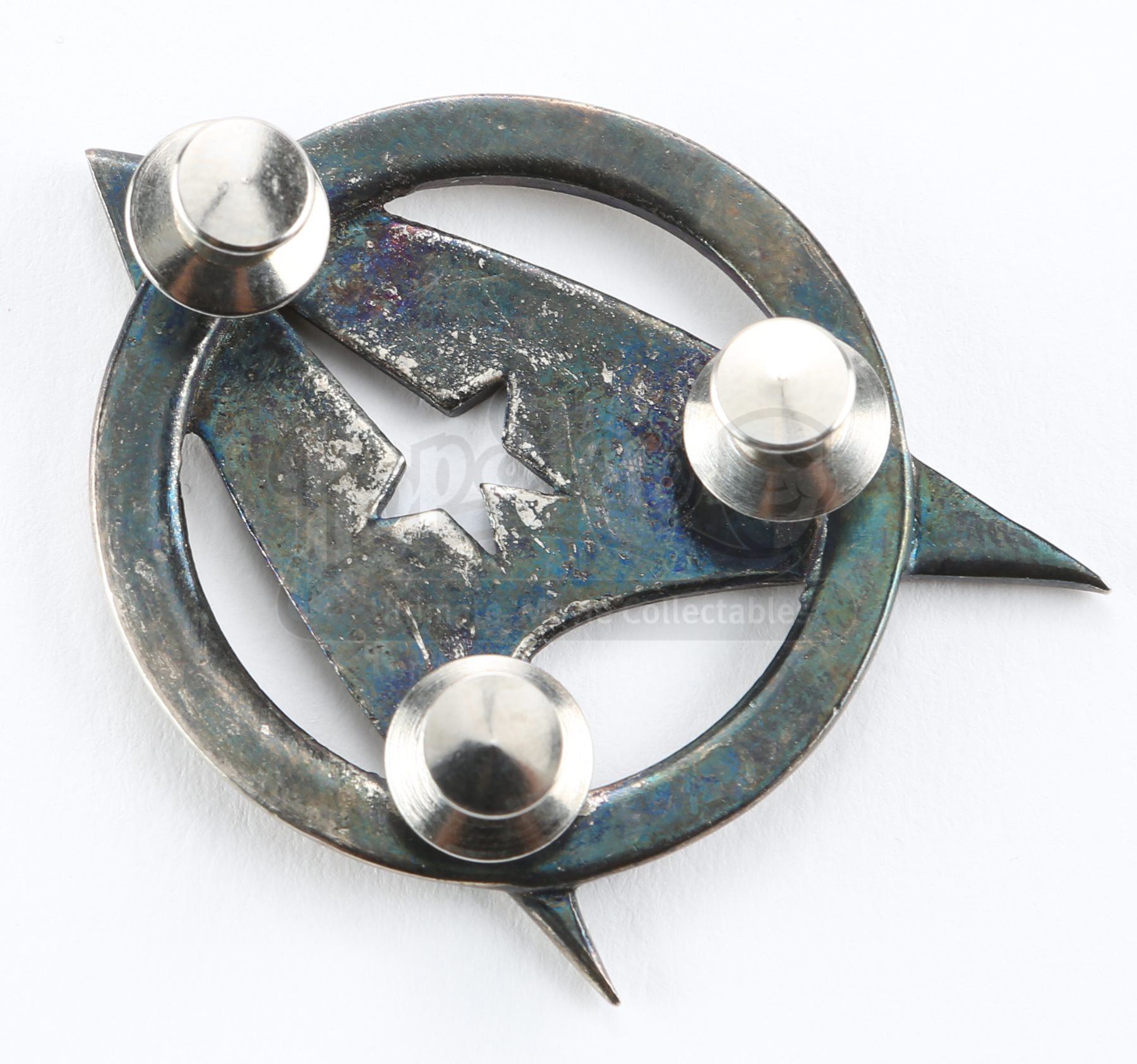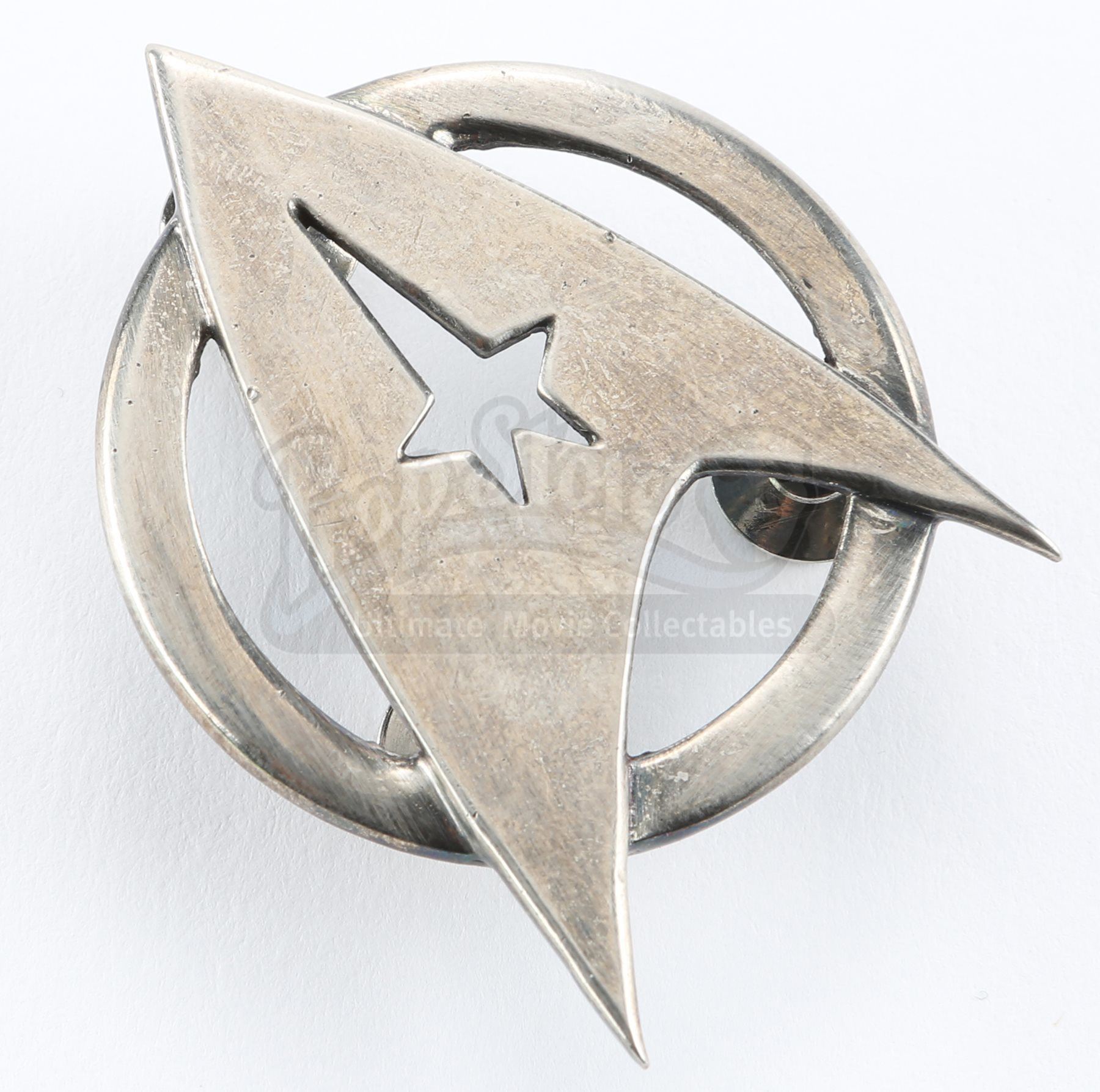A Starfleet captain's command division dress uniform insignia from Star Trek Into Darkness. Command uniform pins were attached to captain's dress uniforms within the command division, including that of Captain Kirk. The pin is made of metal and includes three pin backs for attaching to the wearer's clothing. The pin shows minor wear due to production use but remains in very fine condition. Dimensions: 1 ½" x 2 ¼" x ½" (4 cm x 6 cm x 1 cm)Estimate: $1000 - 1500*Estimated sale price; sold without reserve.