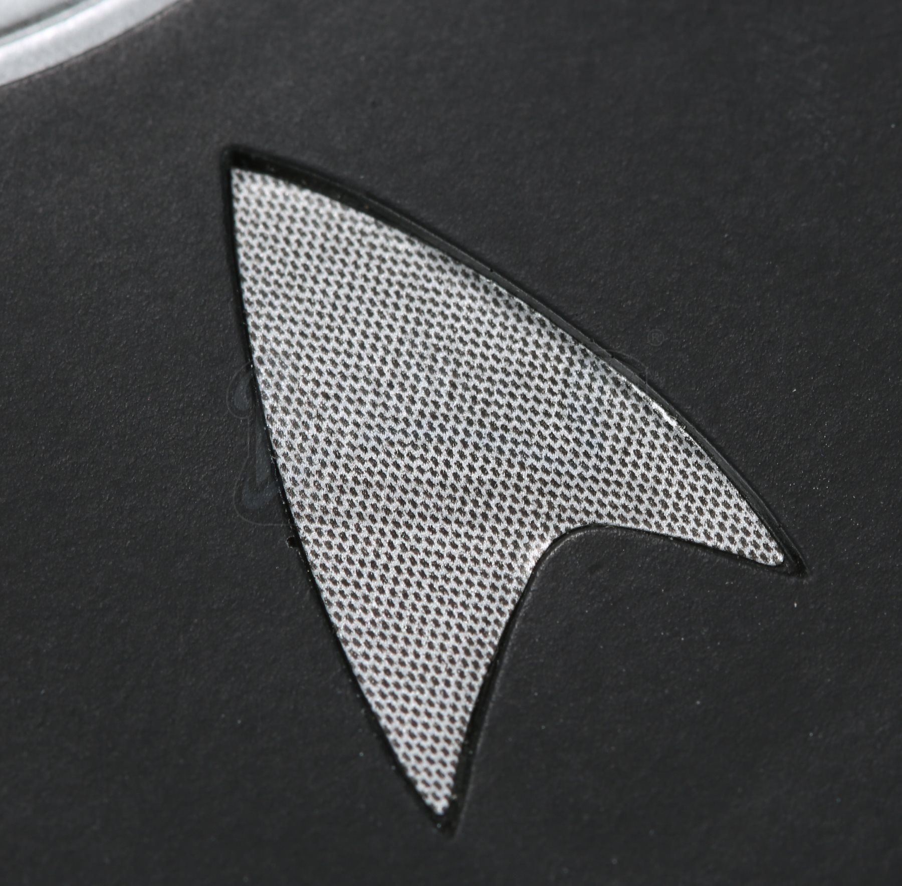 Made of dense foam, the static communicator is finished in black and silver and features a grey Starfleet insignia.