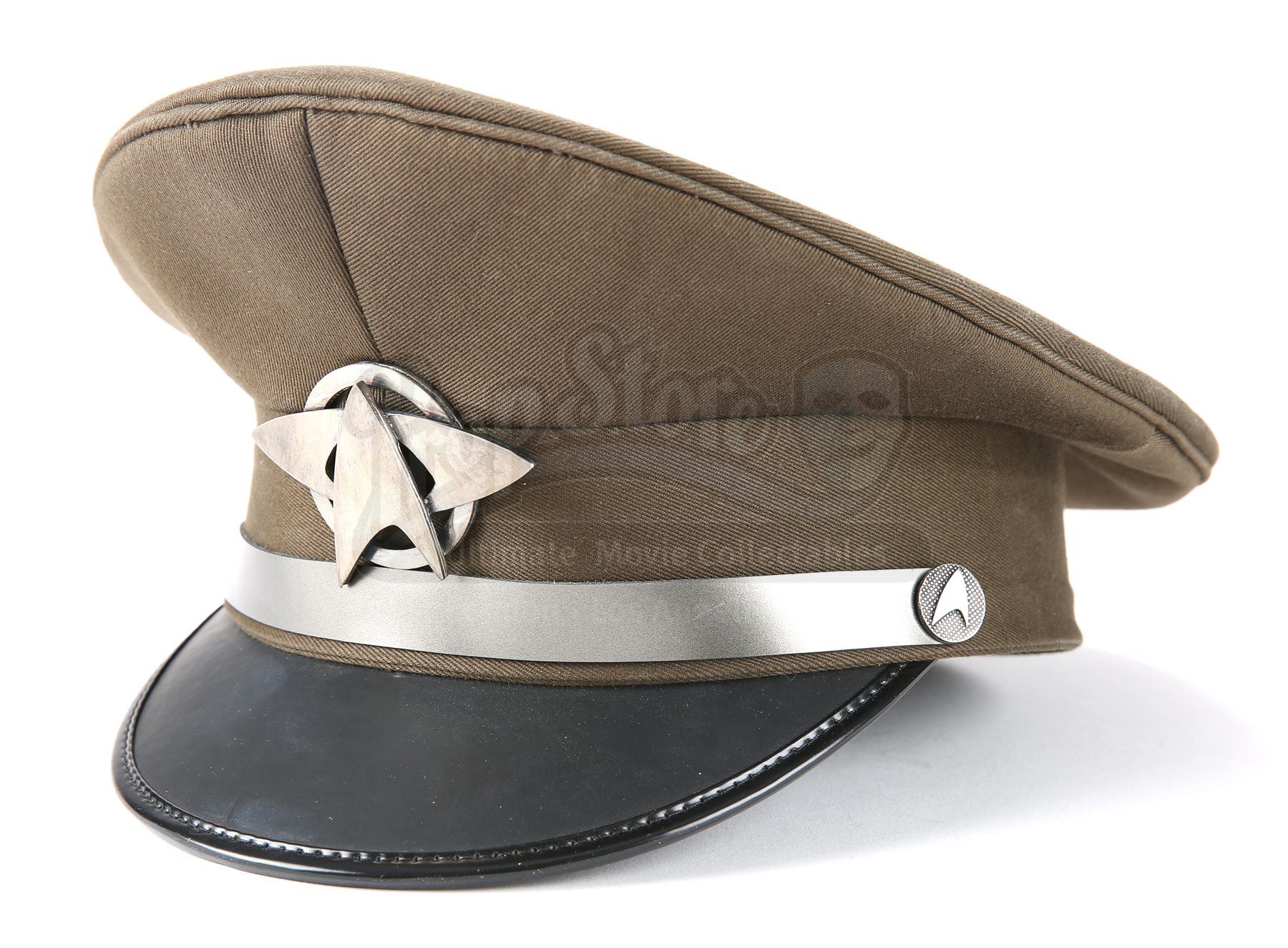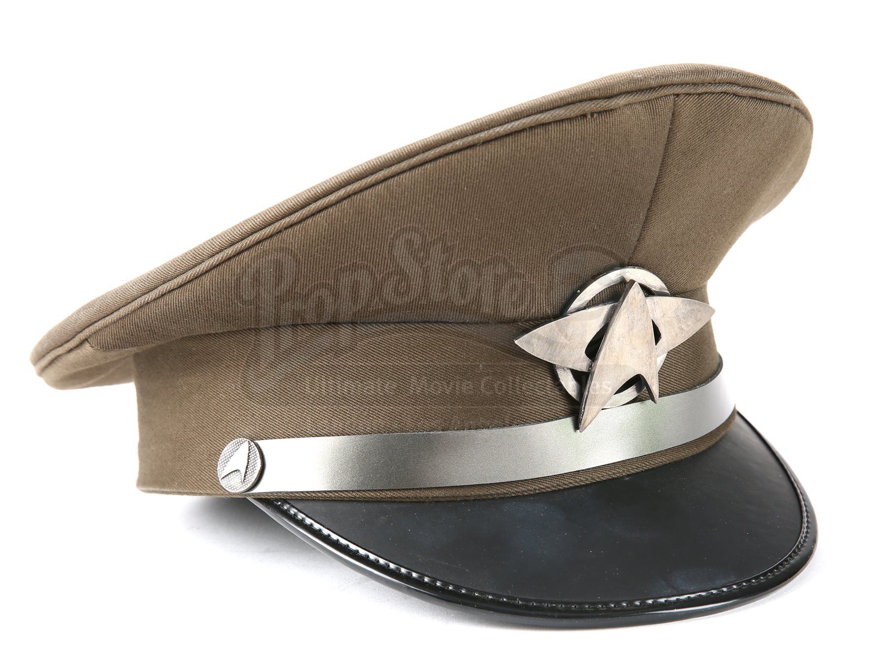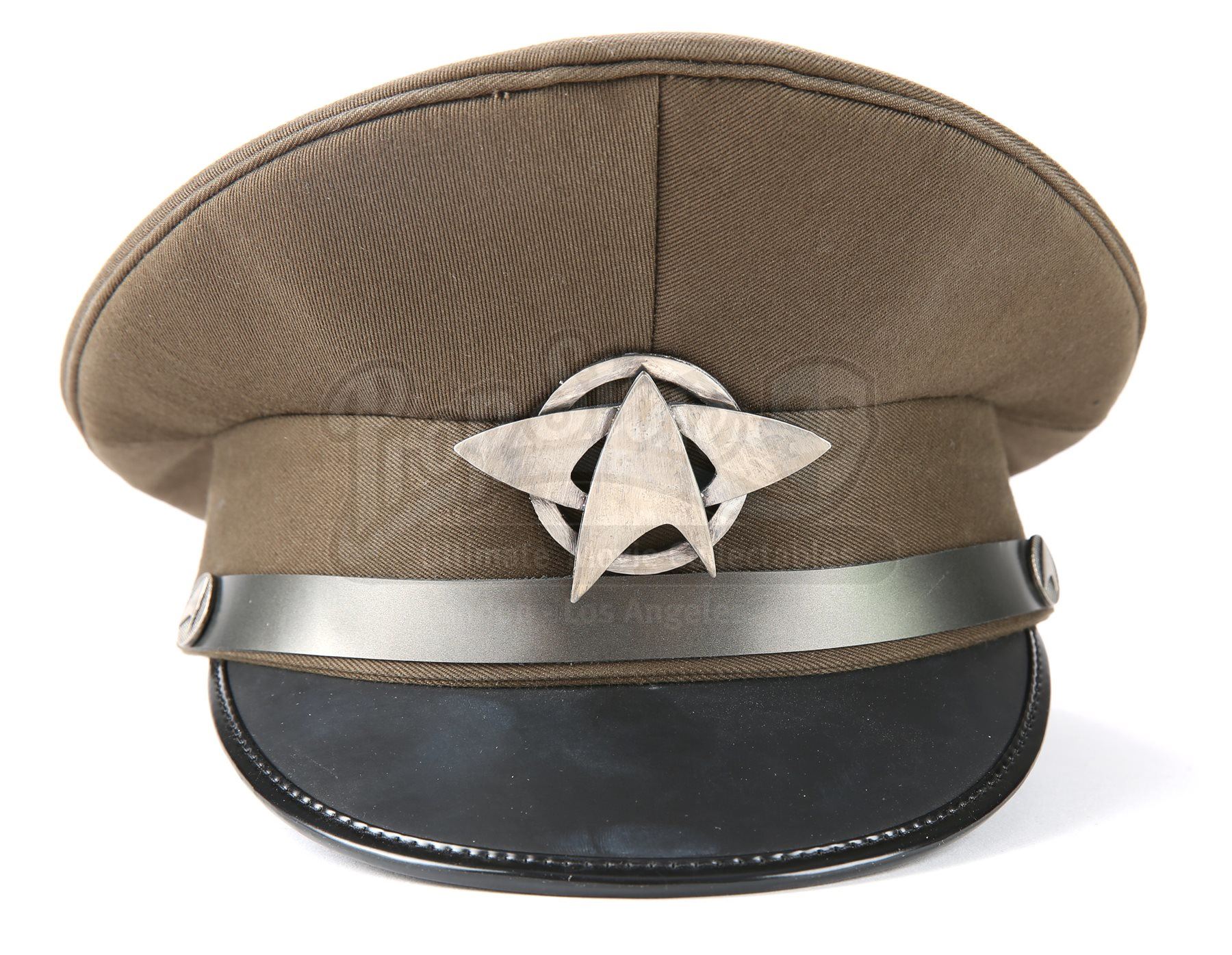 A Starfleet enlisted members' uniform cap from Star Trek Into Darkness. Enlisted members of Starfleet were seen at Starfleet headquarters in San Francisco. The military cap is made of olive colored cotton and nylon, with a leather brim and sweatband. Pinned to the front of the cap is a large metal Starfleet pin, with two smaller pins attached on the ends of the strap. Estimate: $300 - 500*Estimated sale price; sold without reserve.