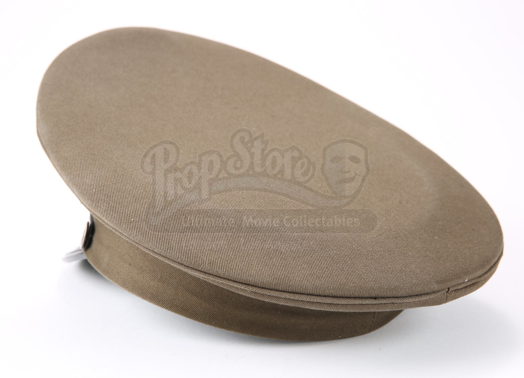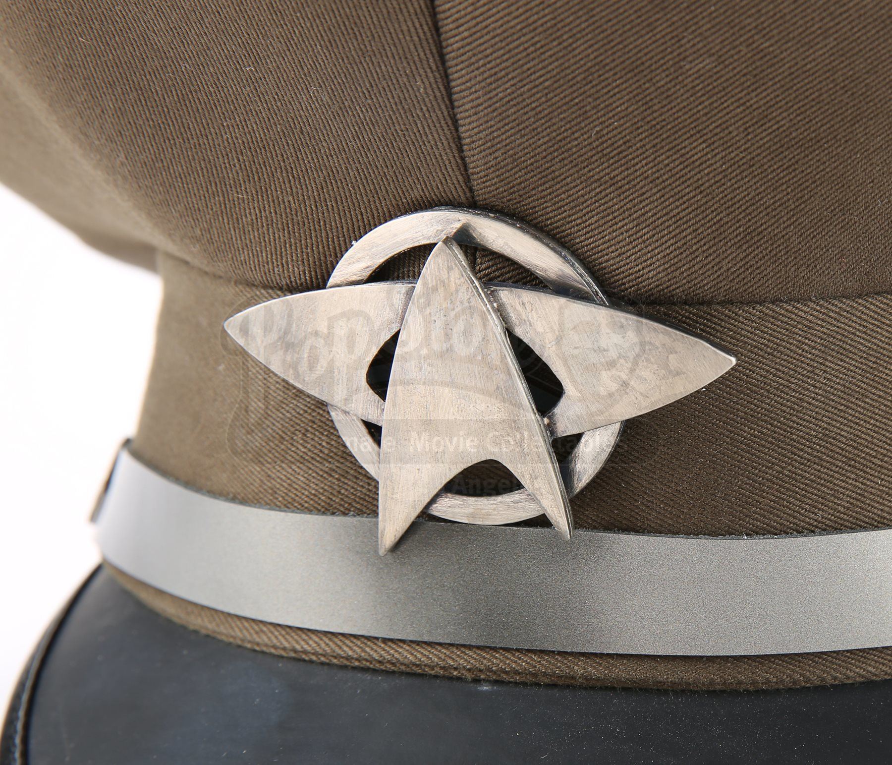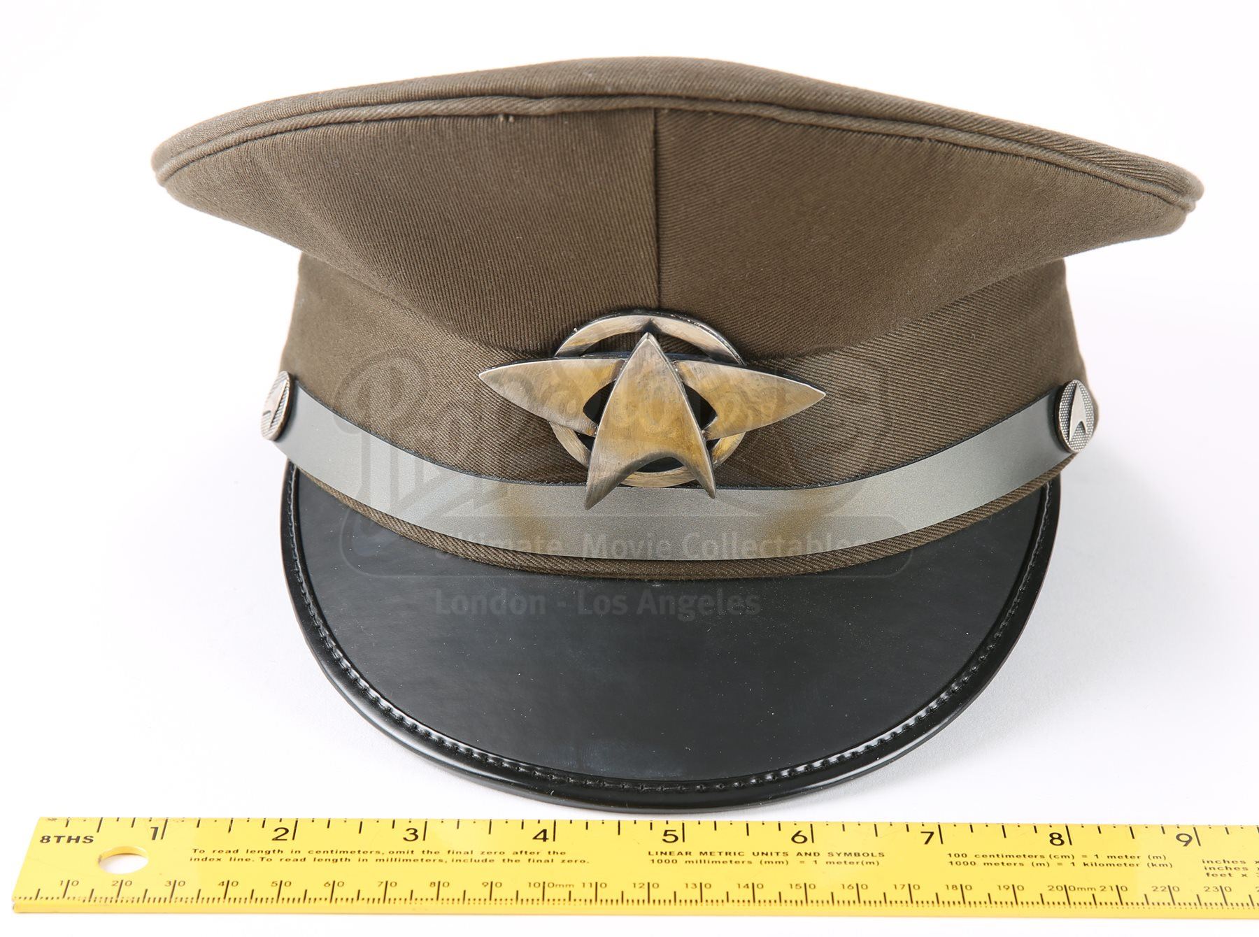 A Starfleet enlisted members' uniform cap from Star Trek Into Darkness. Enlisted members of Starfleet were seen at Starfleet headquarters in San Francisco. The military cap is made of olive colored cotton and nylon, with a leather brim and sweatband. Pinned to the front of the cap is a large metal Starfleet pin, with two smaller pins attached on the ends of the strap. Estimate: $300 - 500*Estimated sale price; sold without reserve.