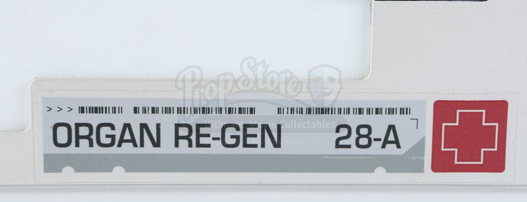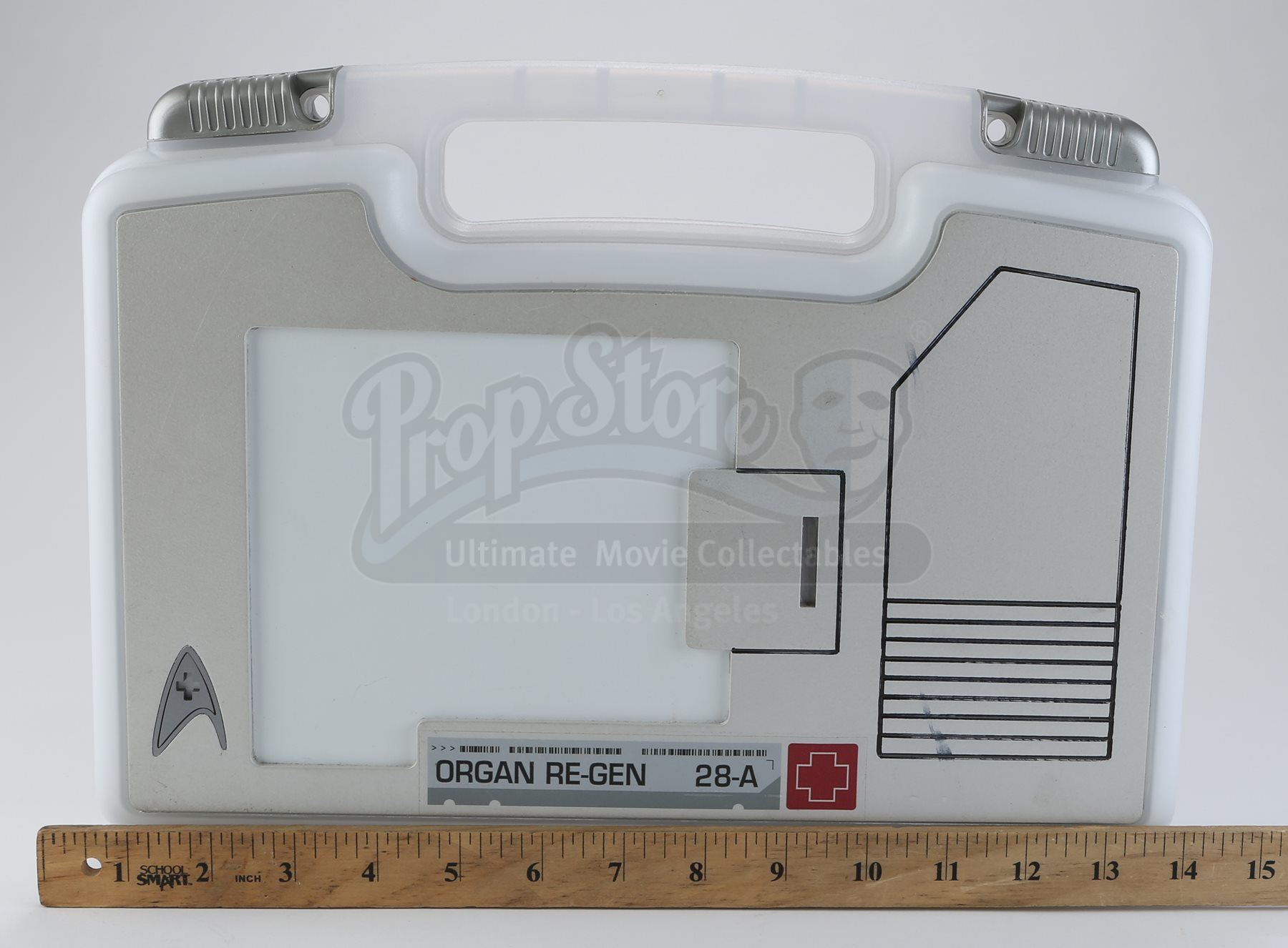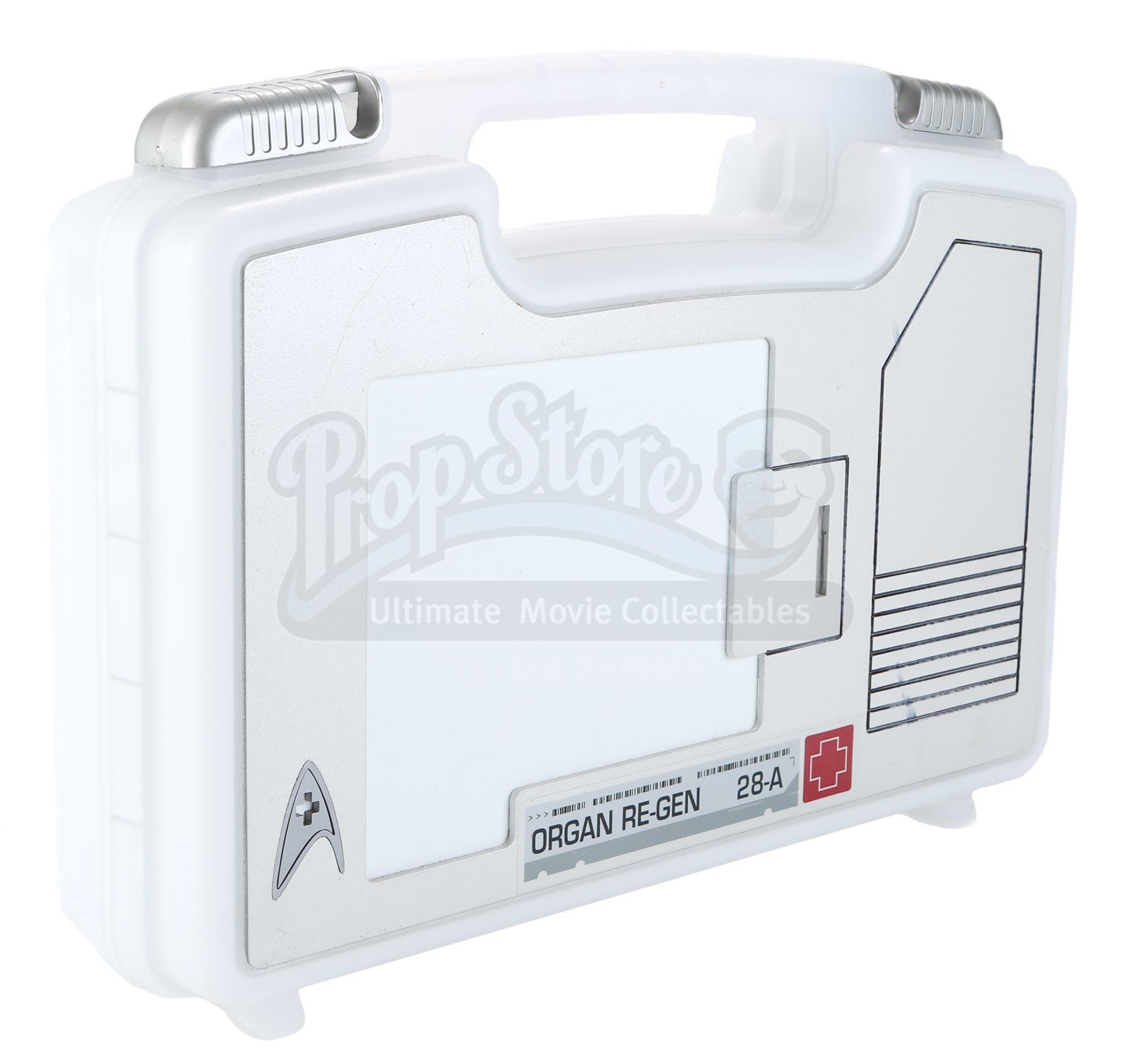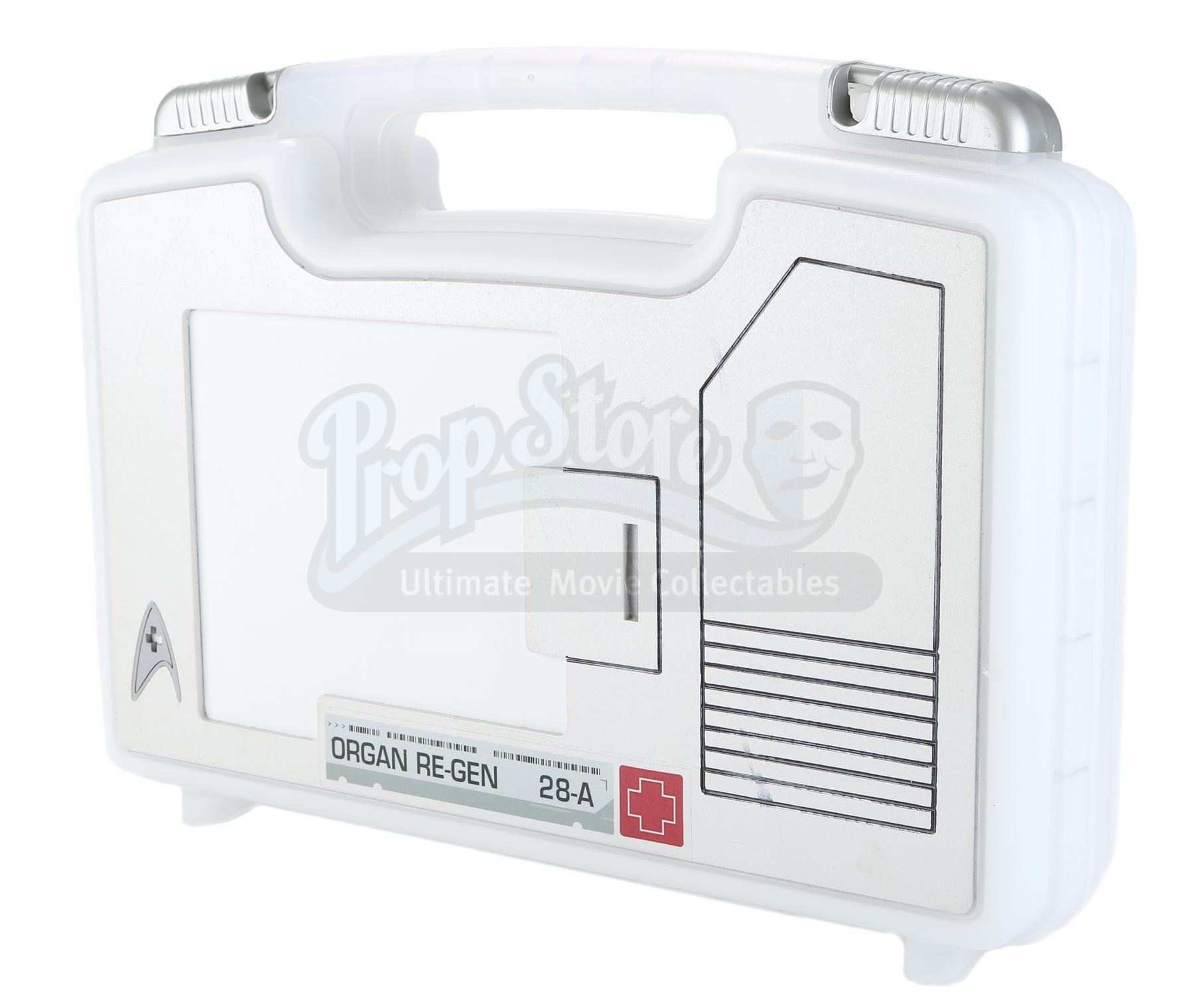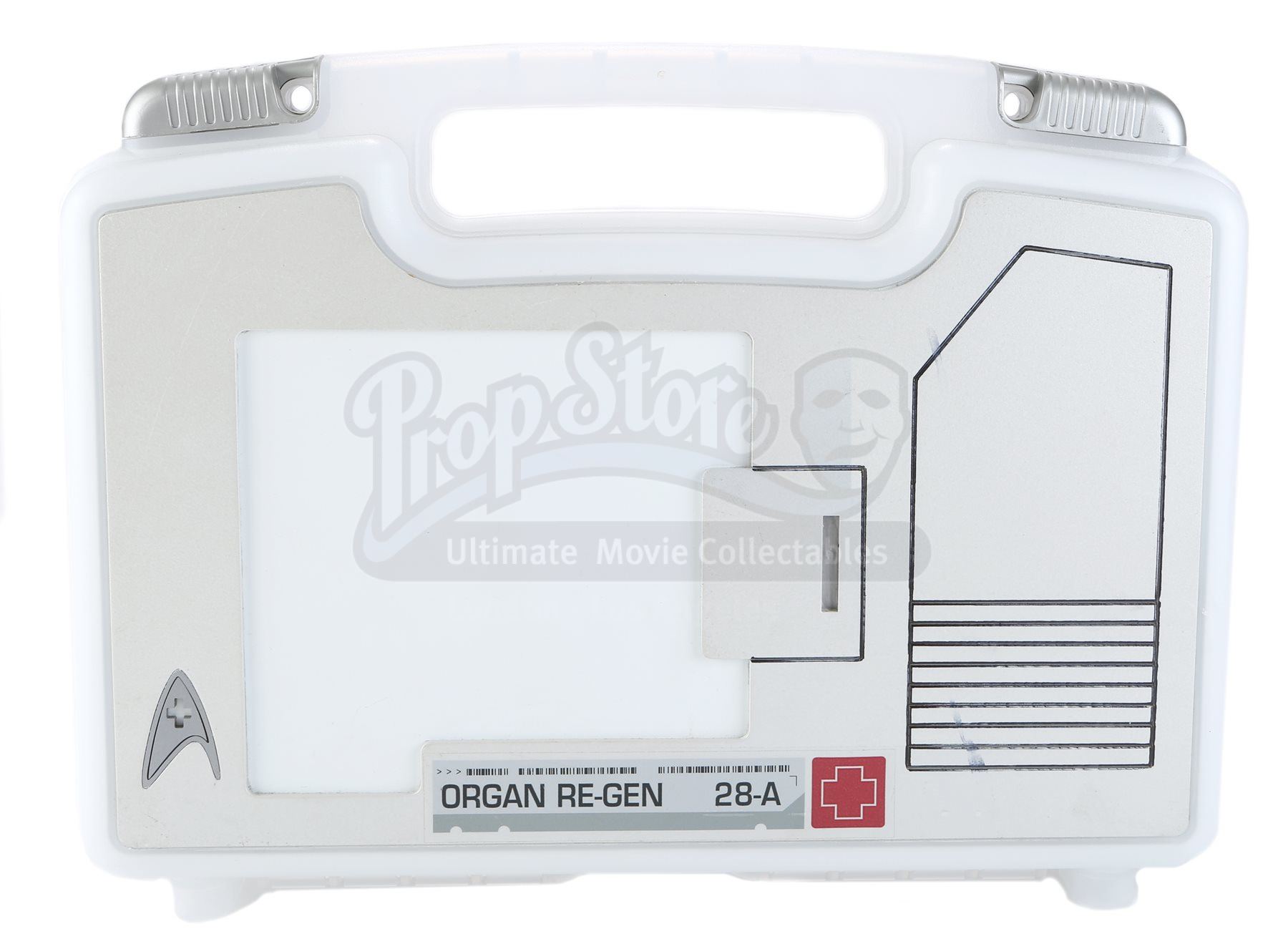 Made of a white and translucent polypropylene plastic, the case features a Starfleet medical insignia on the front left corner and grey sticker labeling reading "ORGAN RE-GEN 28-A". The case opens and closes with two sliding clasps at the top.