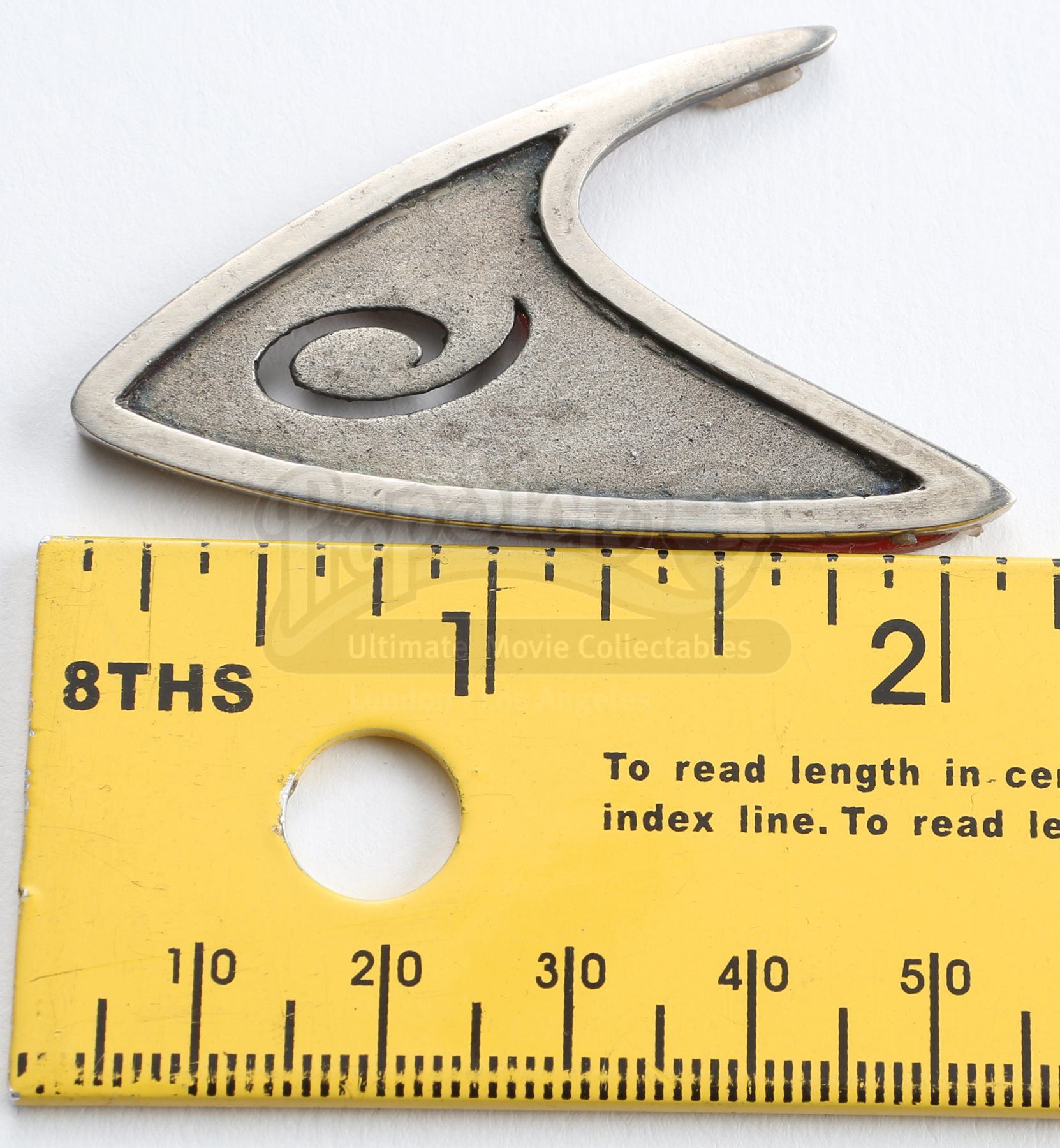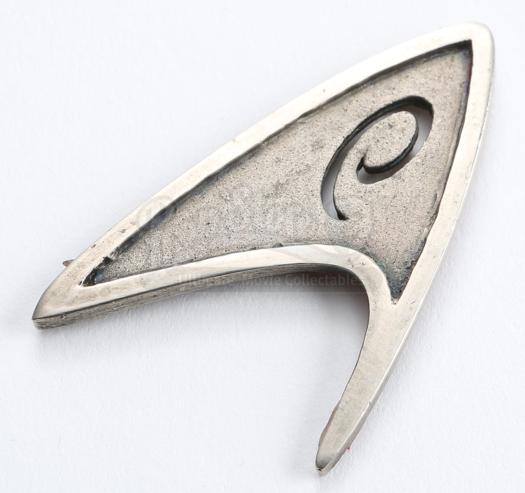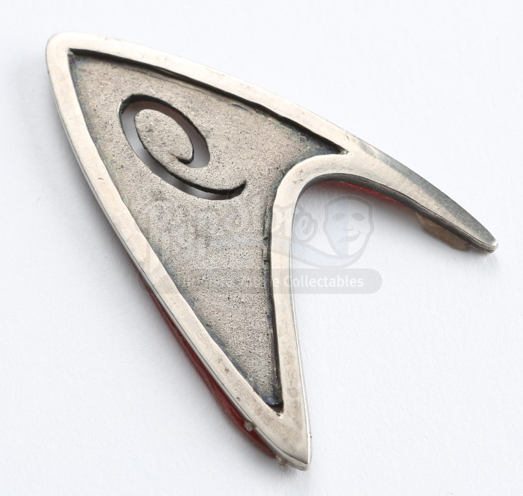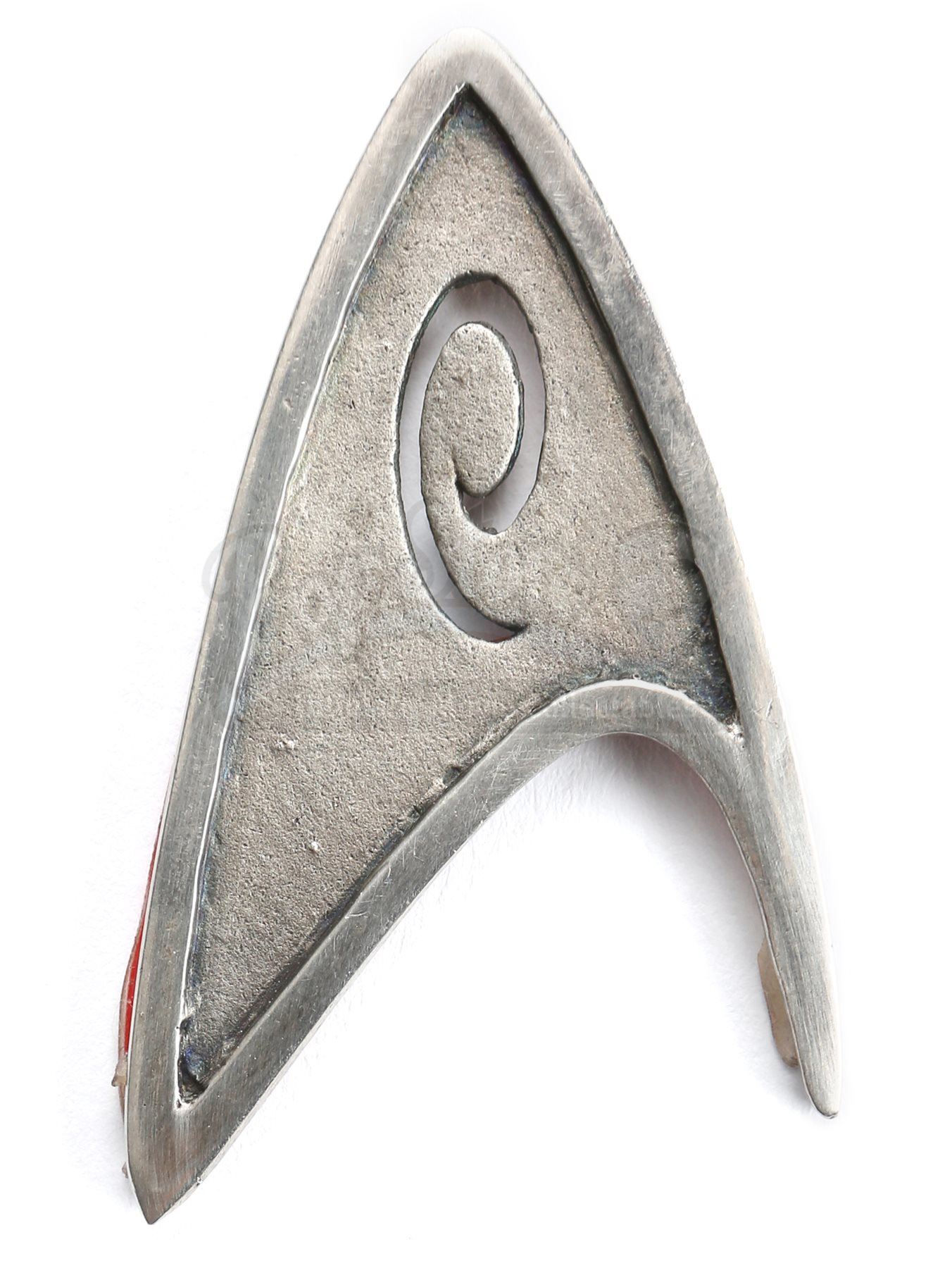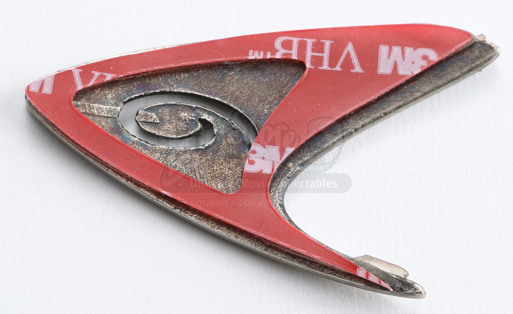 A Starfleet operations division insignia from Star Trek Into Darkness. Operations insignias were attached to members' uniforms within Starfleet operations, including that of Lt. Commander Scotty. The insignia is made of metal and includes a strip of double-sided tape for attaching to the wearer's clothing. The insignia shows minor wear due to production use but remains in very fine condition. Dimensions: 1 ¼" x 2" x ¼" (3 cm x 5 cm x 0.5 cm)Estimate: $1000 - 1500*Estimated sale price; sold without reserve.