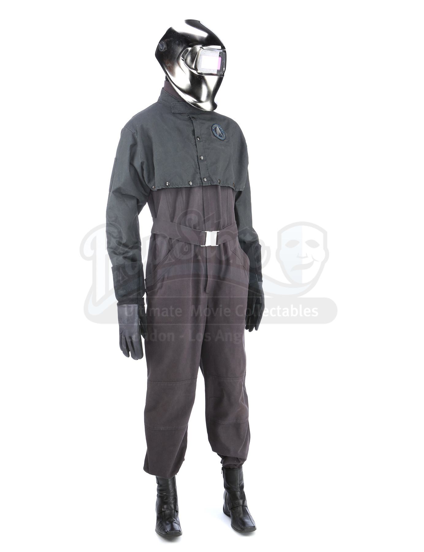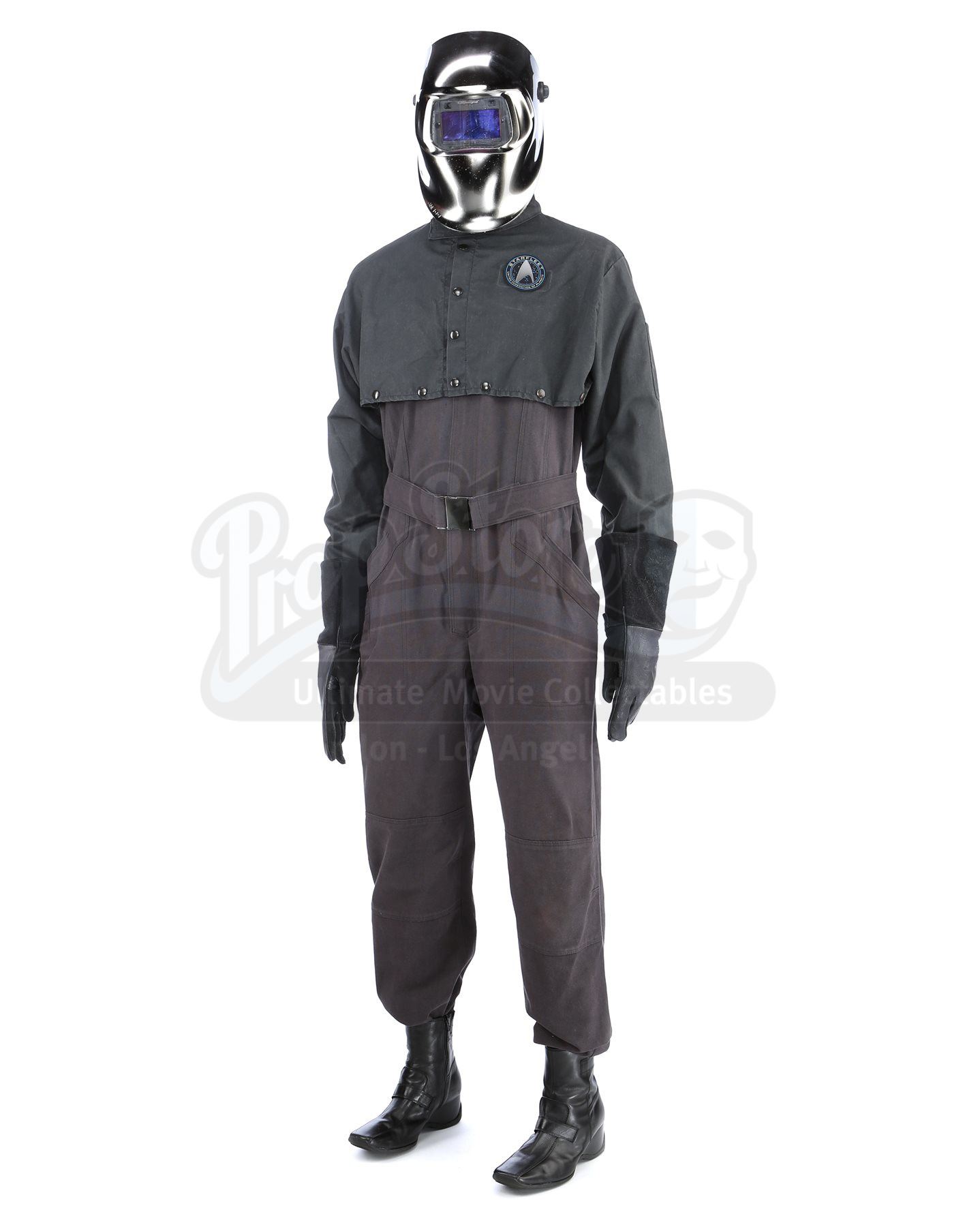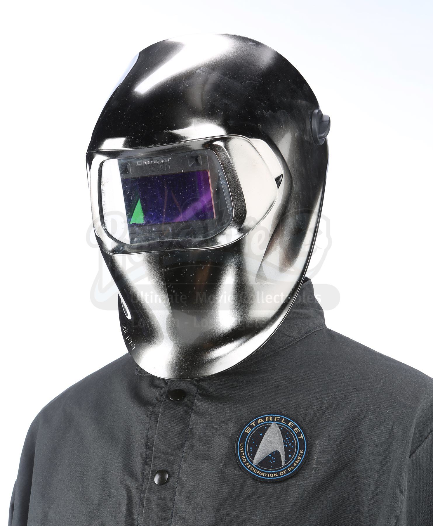 A Starfleet welder uniform from Star Trek Into Darkness. Welders worked in the Section 31 secret base that was located beneath the Kelvin Memorial Library before it was destroyed in a massive explosion. The costume consists of a chrome welding helmet, welding top (extra large), jumpsuit (approximate size large), a protective hood (approximate size large), a pair of gloves, and a pair of boots (marked U.S. size 10M).The chrome-plated welding helmet is made of plastic with auto-darkening filter lenses and includes a sizing band that fits around the head. The cropped welding top is made of flame-resistant material and covers the arms and upper torso and features a Starfleet patch sewn onto the left breast. The custom-made jumpsuit is made of heavy nylon and has a front zipper. The black protective hood is made of carbon. Both the gloves and boots are made of leather.The costume features hand-written wardrobe labels in the helmet, welding top, jumpsuit and gloves marked with the actor's name. The boots also have hand-written wardrobe labels marked with the name of another background actor. The jumpsuit is the incorrect color for the welders; it was used in the production by a Starfleet loader, but is included as it is similar in style.Estimate: $600 - 800*Estimated sale price; sold without reserve.