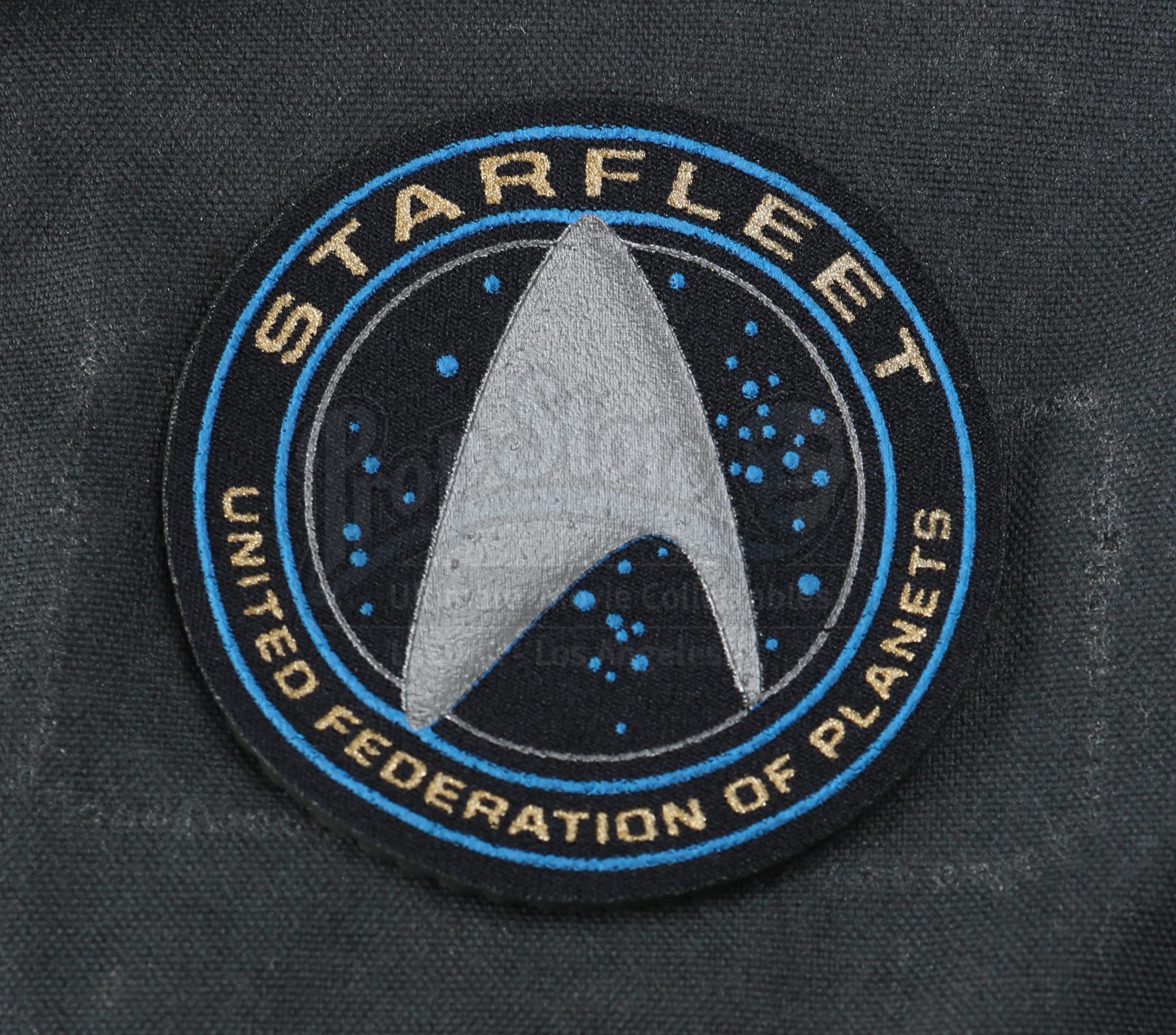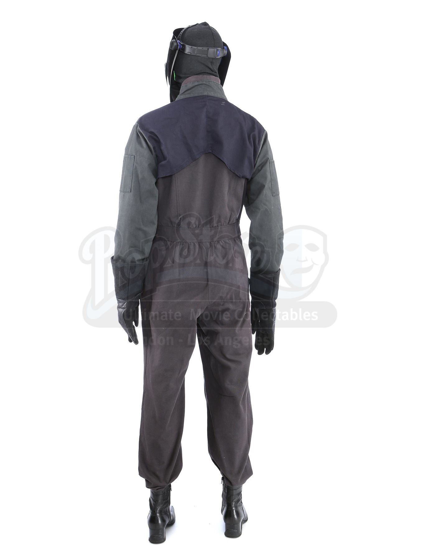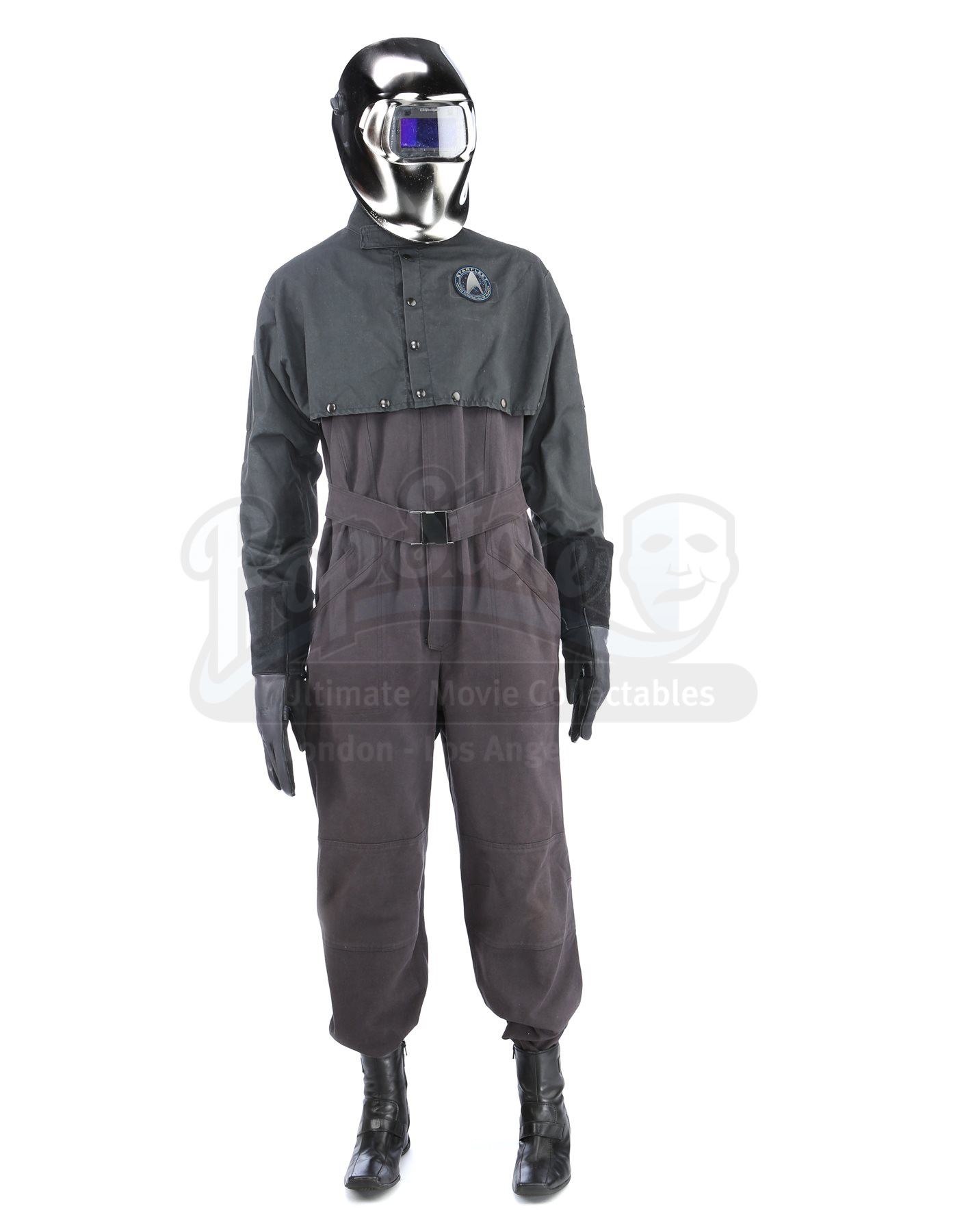 A Starfleet welder uniform from Star Trek Into Darkness. Welders worked in the Section 31 secret base that was located beneath the Kelvin Memorial Library before it was destroyed in a massive explosion. The costume consists of a chrome welding helmet, welding top (extra large), jumpsuit (approximate size large), a protective hood (approximate size large), a pair of gloves, and a pair of boots (marked U.S. size 10M).The chrome-plated welding helmet is made of plastic with auto-darkening filter lenses and includes a sizing band that fits around the head. The cropped welding top is made of flame-resistant material and covers the arms and upper torso and features a Starfleet patch sewn onto the left breast. The custom-made jumpsuit is made of heavy nylon and has a front zipper. The black protective hood is made of carbon. Both the gloves and boots are made of leather.The costume features hand-written wardrobe labels in the helmet, welding top, jumpsuit and gloves marked with the actor's name. The boots also have hand-written wardrobe labels marked with the name of another background actor. The jumpsuit is the incorrect color for the welders; it was used in the production by a Starfleet loader, but is included as it is similar in style.Estimate: $600 - 800*Estimated sale price; sold without reserve.
