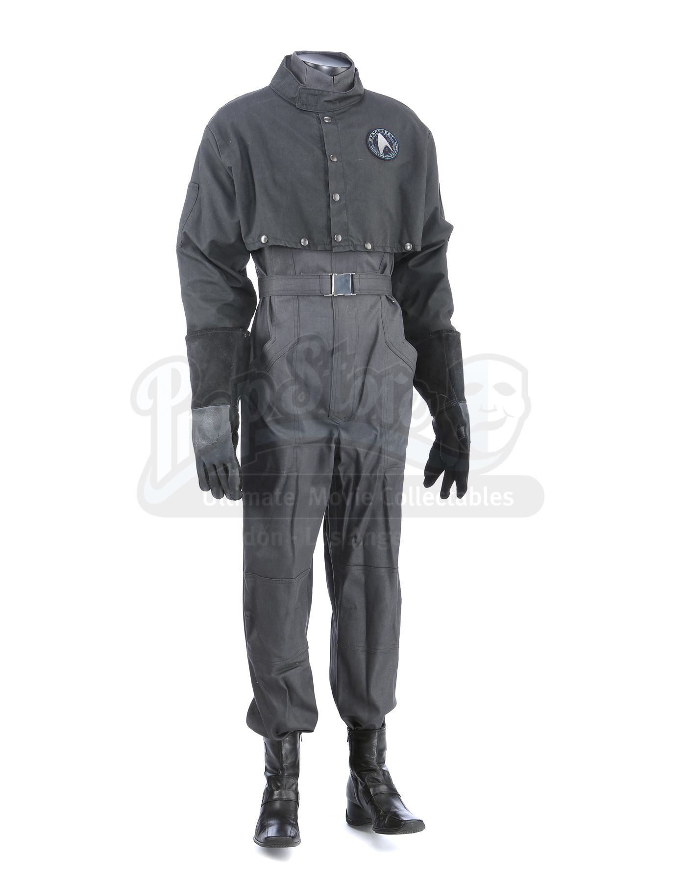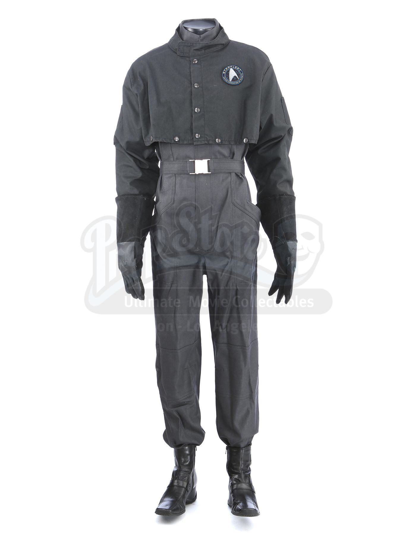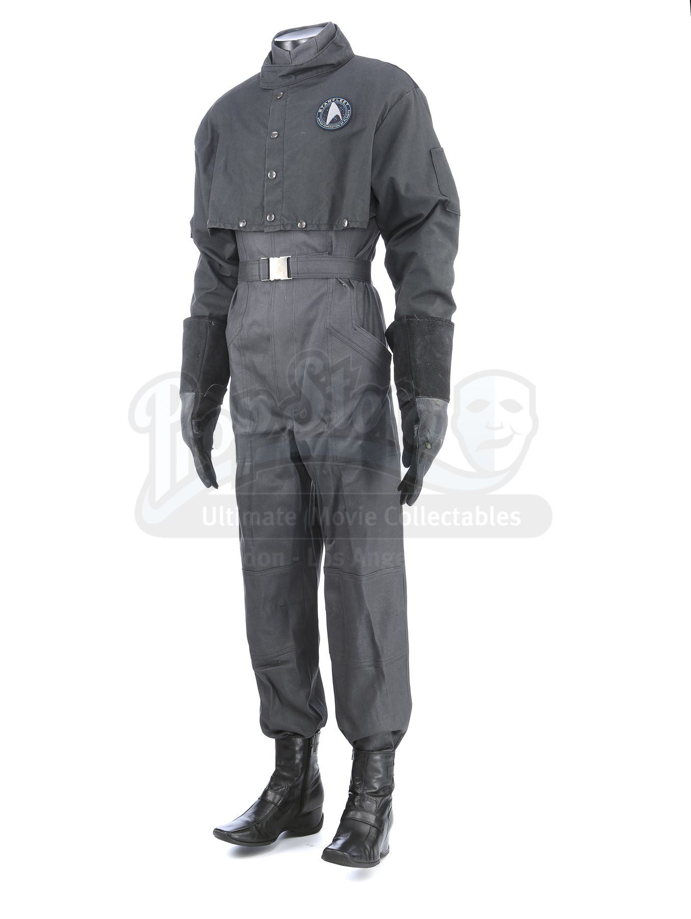 A Starfleet welder uniform from Star Trek Into Darkness. Welders worked in the Section 31 secret base that was located beneath the Kelvin Memorial Library before it was destroyed in a massive explosion. The lot includes a welder's cotton head cover, cropped welding top (large), loader jumpsuit (size 36), leather gloves (large), and a pair of boots (10M).The cropped welding top is made of flame-resistant material and covers the arms and upper torso. It features a foam Starfleet patch sewn onto the left breast. The custom-made jumpsuit is made of heavy nylon with a front zipper and also includes a foam patch on the left shoulder. The black protective hood is made of carbon. Both the gloves and boots are made of leather. The jumpsuit is the incorrect color for the costume; it was used in the production by a Starfleet loader, but is included as it is similar in style.Estimate: $400 - 600*Estimated sale price; sold without reserve.