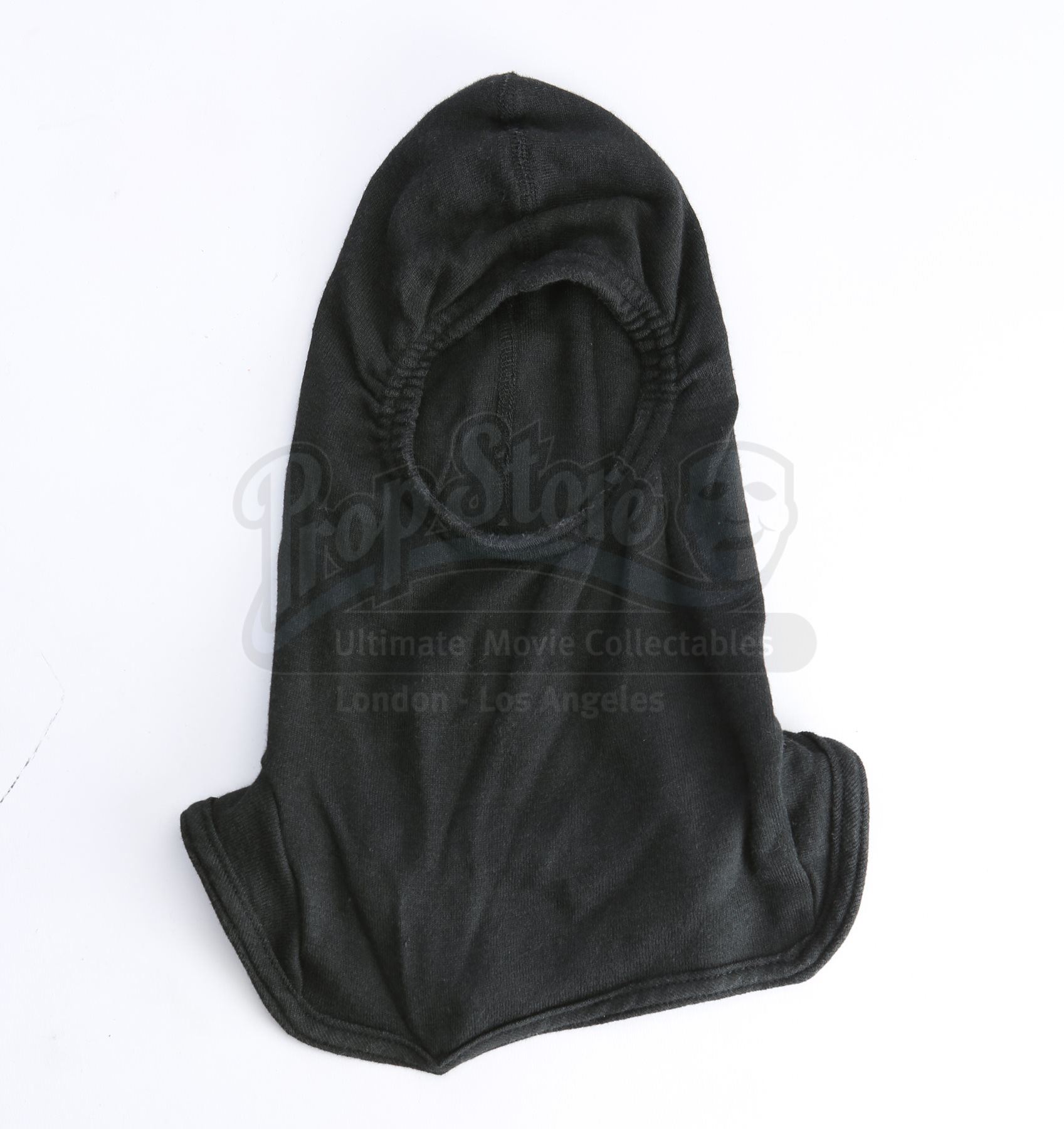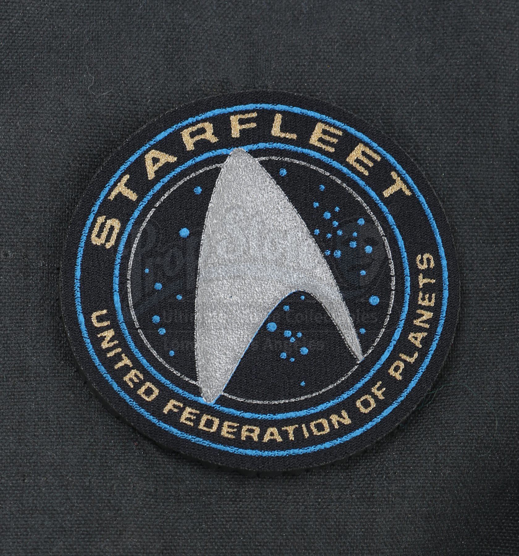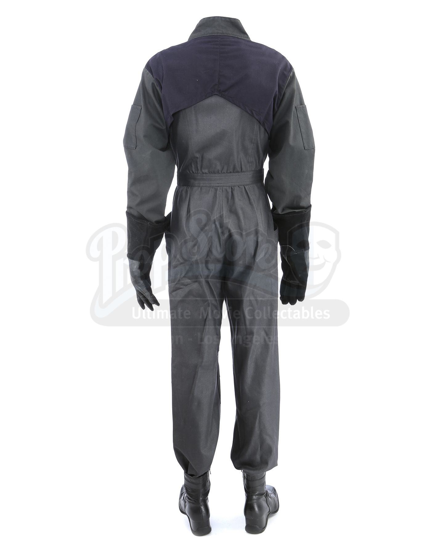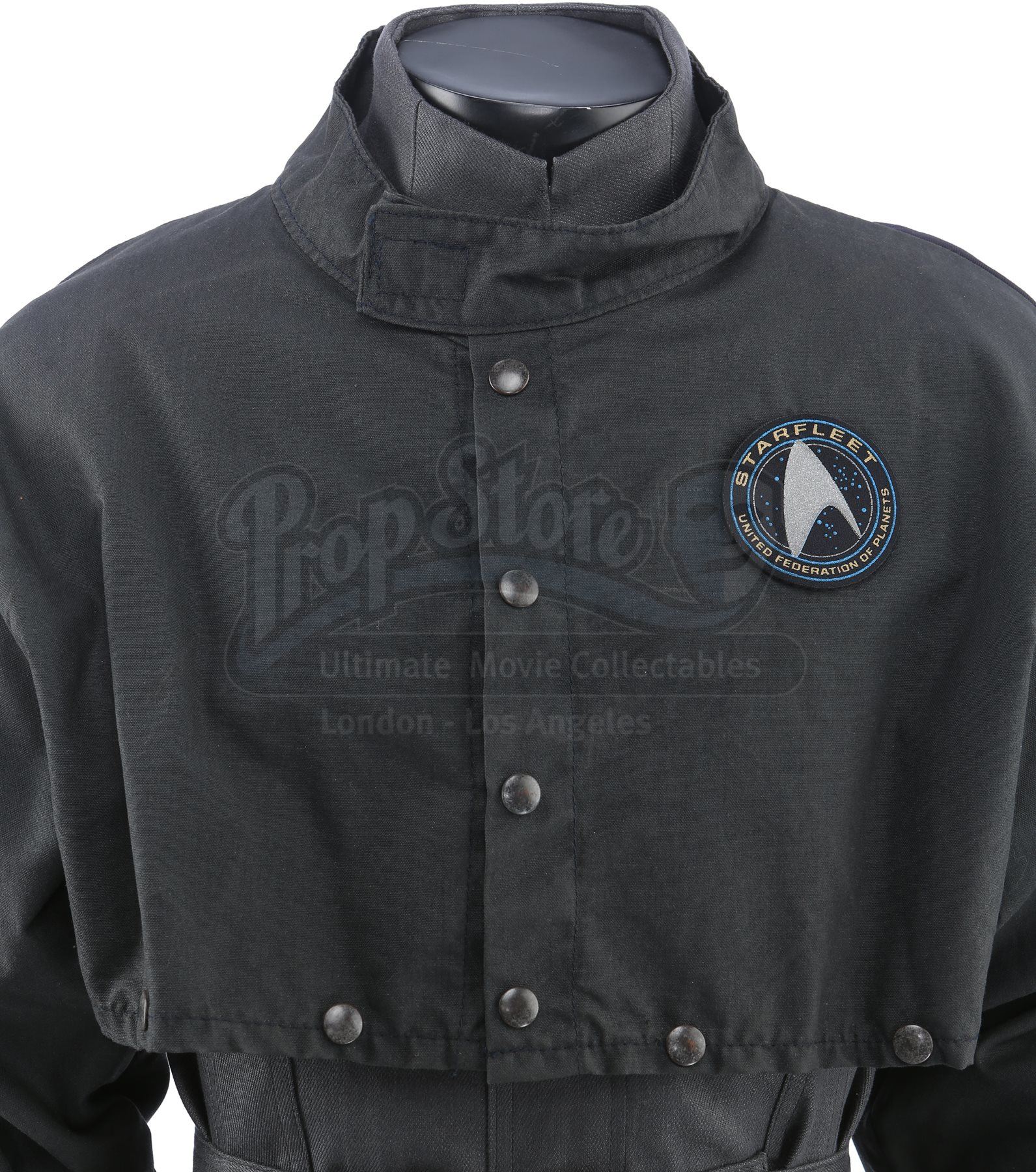 A Starfleet welder uniform from Star Trek Into Darkness. Welders worked in the Section 31 secret base that was located beneath the Kelvin Memorial Library before it was destroyed in a massive explosion. The lot includes a welder's cotton head cover, cropped welding top (large), loader jumpsuit (size 36), leather gloves (large), and a pair of boots (10M).The cropped welding top is made of flame-resistant material and covers the arms and upper torso. It features a foam Starfleet patch sewn onto the left breast. The custom-made jumpsuit is made of heavy nylon with a front zipper and also includes a foam patch on the left shoulder. The black protective hood is made of carbon. Both the gloves and boots are made of leather. The jumpsuit is the incorrect color for the costume; it was used in the production by a Starfleet loader, but is included as it is similar in style.Estimate: $400 - 600*Estimated sale price; sold without reserve.