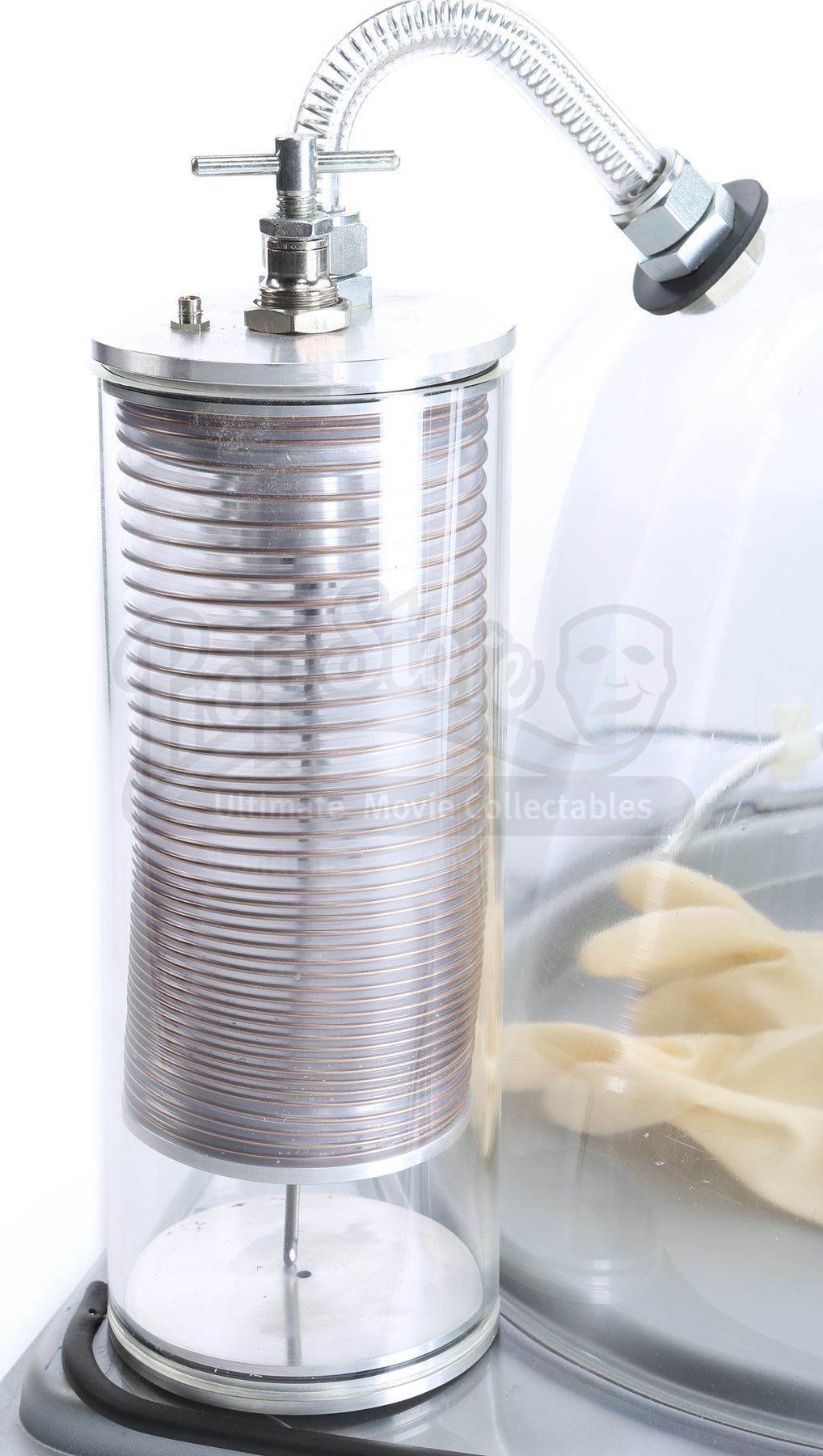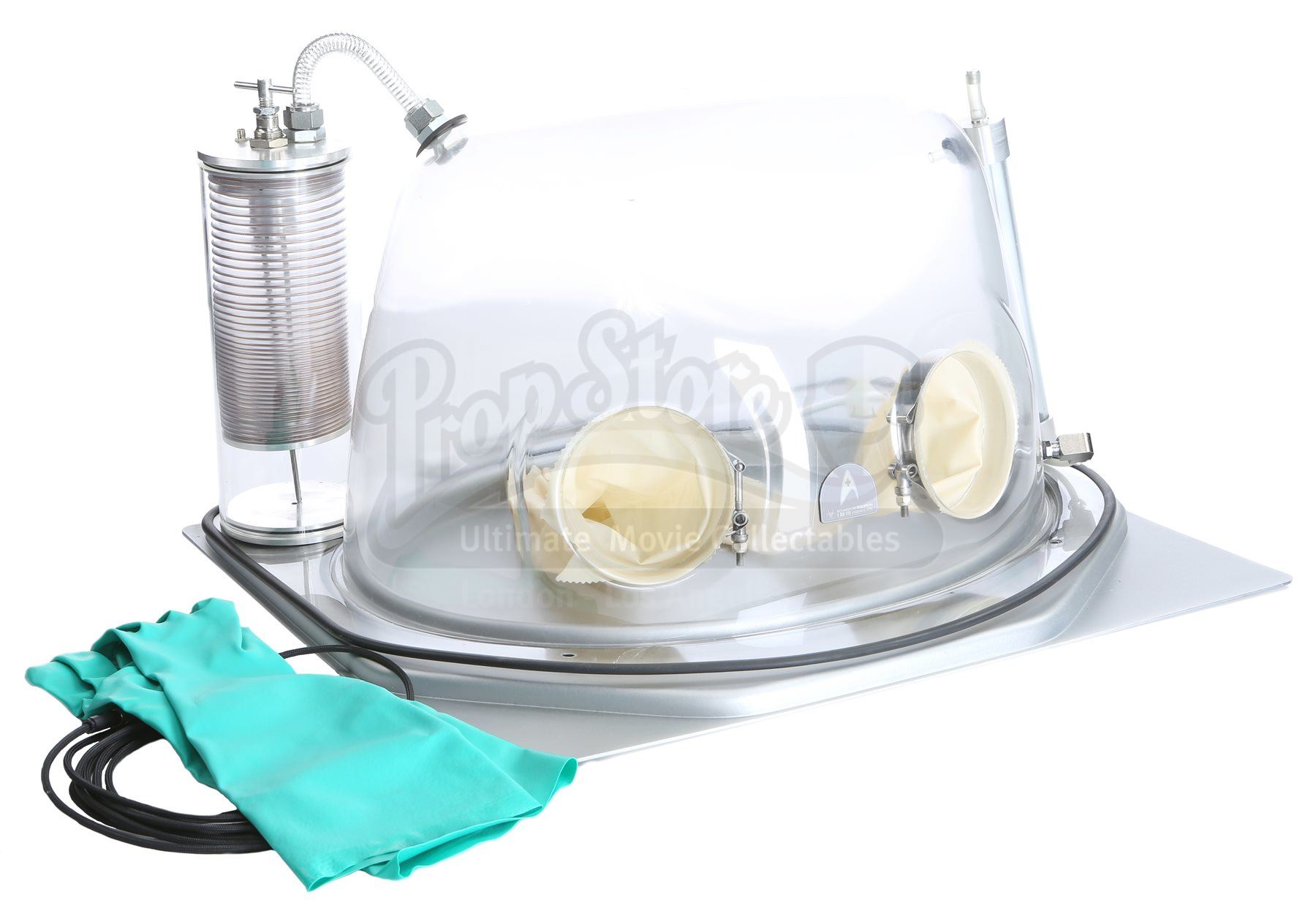 Consisting of a clear polycarbonate casing, the lot features a set of rubber gloves fitted between the inside and outside of the box and a base made of resin and painted silver. The lot also includes tubes, metal coils, an extra pair of rubber gloves, and various electronic pieces including power supply, an air pump, and various wiring. Dimensions: 28" x 24" x 16" (71 cm x 61 cm x 41 cm)
