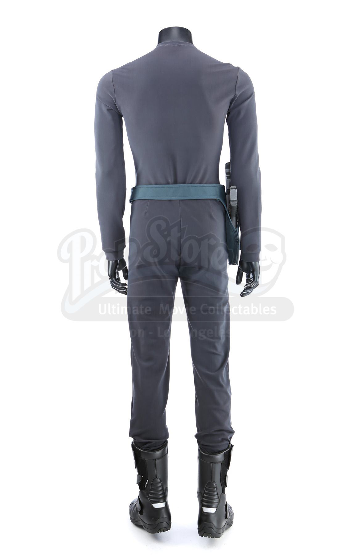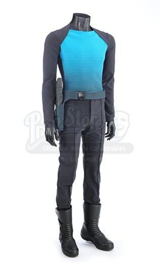 A Vengeance crew member uniform, phaser and holster belt from Star Trek Into Darkness. Various male background characters wore the uniform while aboard the USS Vengeance toward the end of the film. The costume consists of a tunic (approximate size small), undershirt (large), pants (approximate size 30), a phaser, holster belt, and a pair of boots (marked U.S. size 11.5).