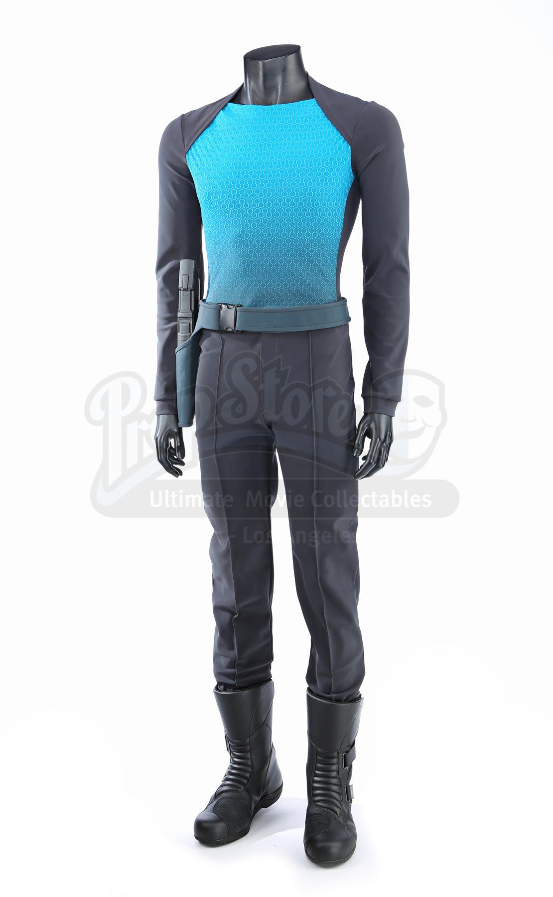 The black long-sleeved tunic is made of Spandex and features an aqua front panel with a rubber honeycomb pattern. The undershirt consists of a black Spandex sport shirt with shoulder pads. The dark blue pocket-free pants are made of Spandex. The static phaser is made of dense urethane, is painted in shades of matte black and blue, and rests in a teal nylon holster belt. Also included is a pair of black leather boots with rubber soles.