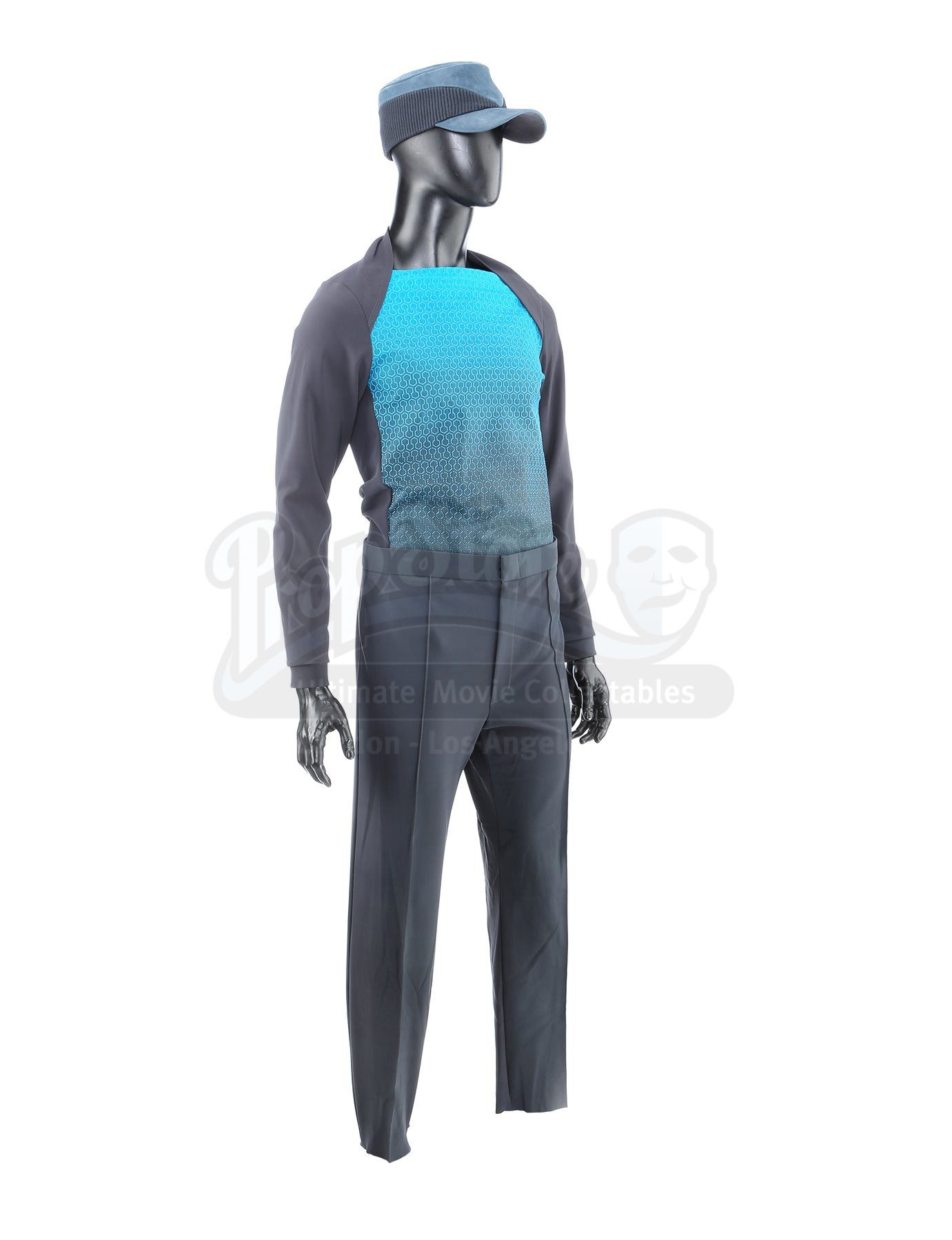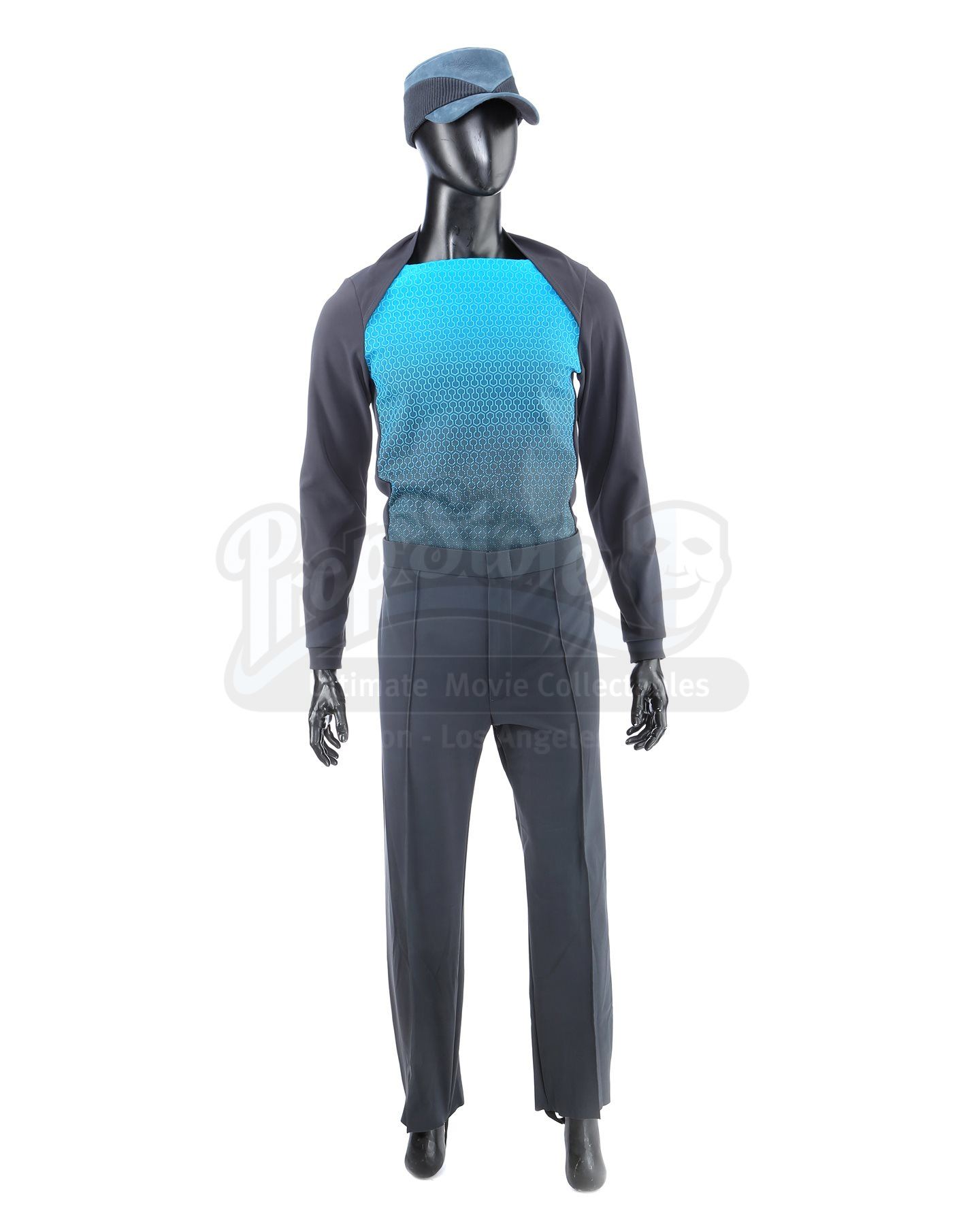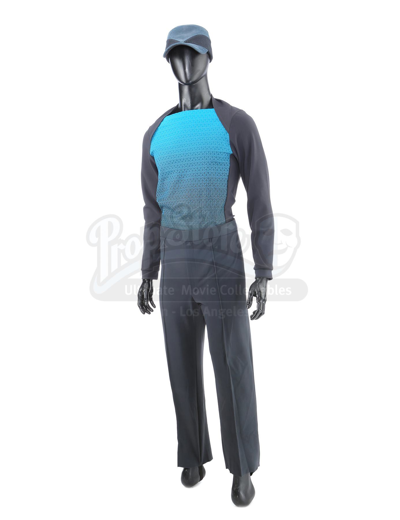 A Vengeance crew member uniform from Star Trek Into Darkness. The crew of the USS Vengeance wore their uniforms while onboard the secret vessel. The costume consists of a tunic (approximate size large), undershirt (large), pants (approximate size large), and a cap. The black tunic is made of Spandex and features an aqua front panel with a rubber honeycomb pattern. The undershirt consists of a black Spandex sport shirt with shoulder pads. The dark blue pocket-free pants are made of Spandex. The cap is made of deep blue leather with a corduroy band.The costume features sewn-in wardrobe labels in the undershirt and pants with the name of the actor. Estimate: $1000 - 1500*Estimated sale price; sold without reserve.