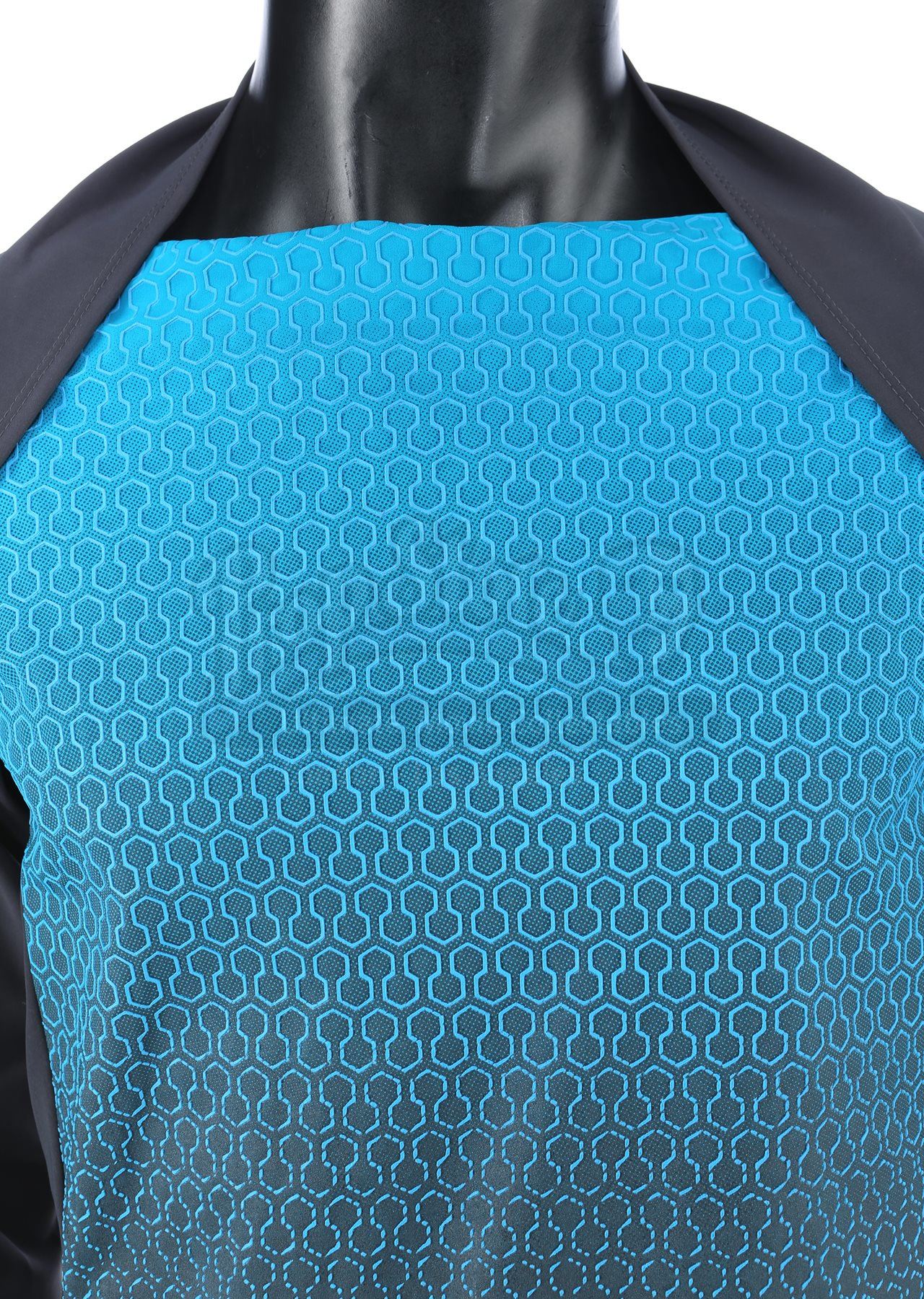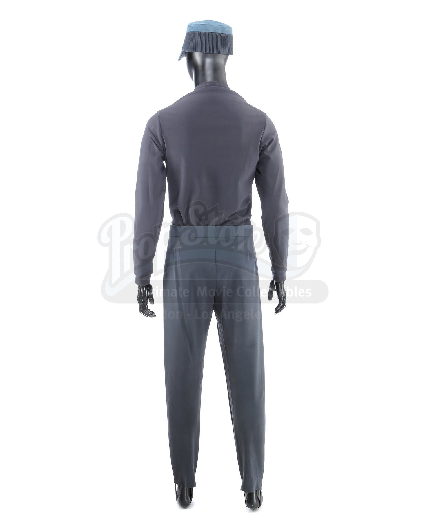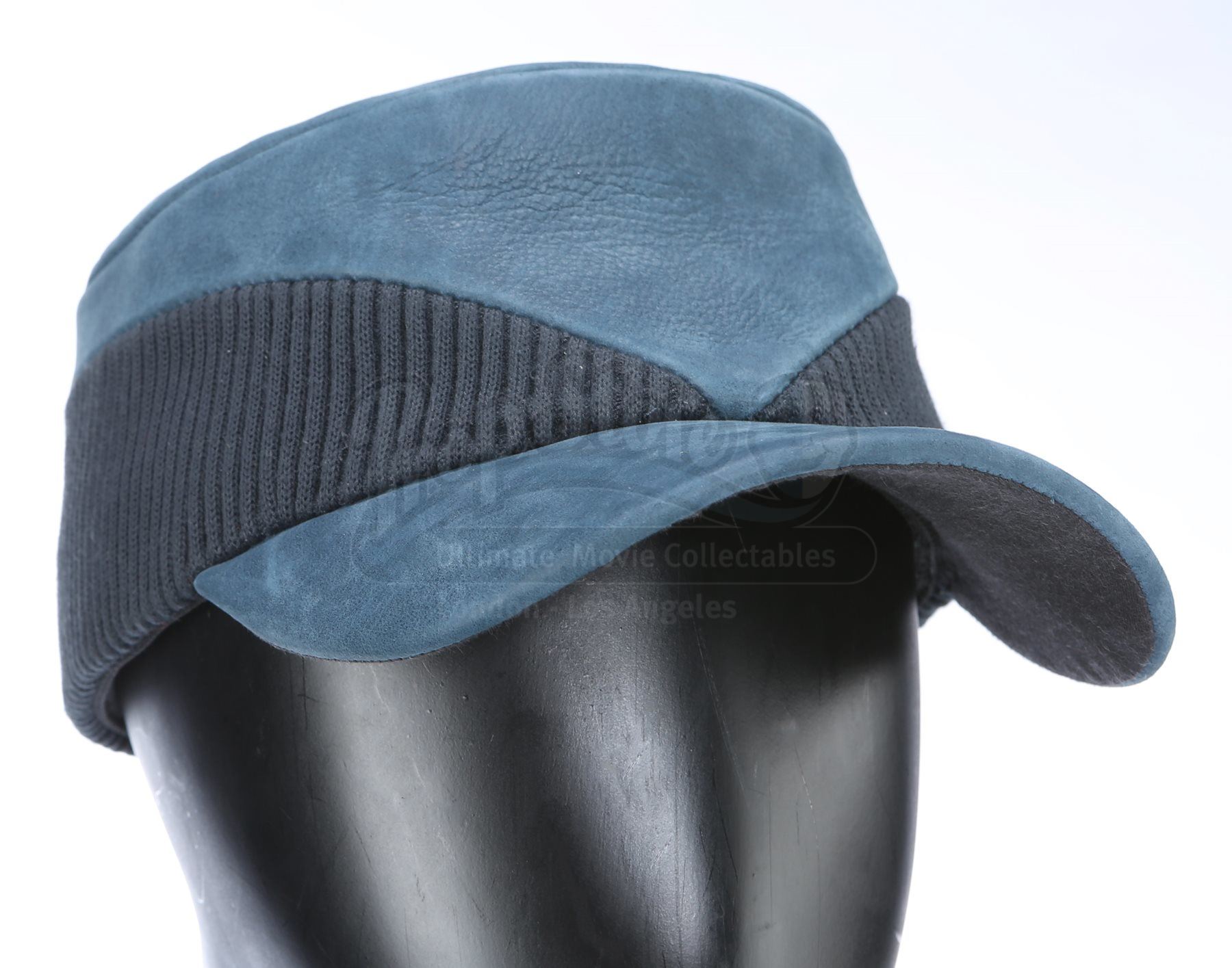 A Vengeance crew member uniform from Star Trek Into Darkness. The crew of the USS Vengeance wore their uniforms while onboard the secret vessel. The costume consists of a tunic (approximate size large), undershirt (large), pants (approximate size large), and a cap. The black tunic is made of Spandex and features an aqua front panel with a rubber honeycomb pattern. The undershirt consists of a black Spandex sport shirt with shoulder pads. The dark blue pocket-free pants are made of Spandex. The cap is made of deep blue leather with a corduroy band.The costume features sewn-in wardrobe labels in the undershirt and pants with the name of the actor. Estimate: $1000 - 1500*Estimated sale price; sold without reserve.