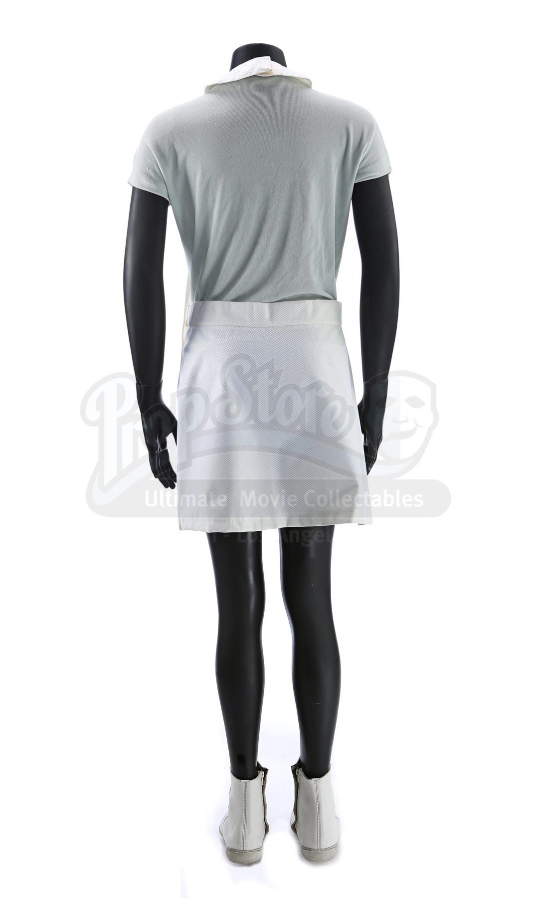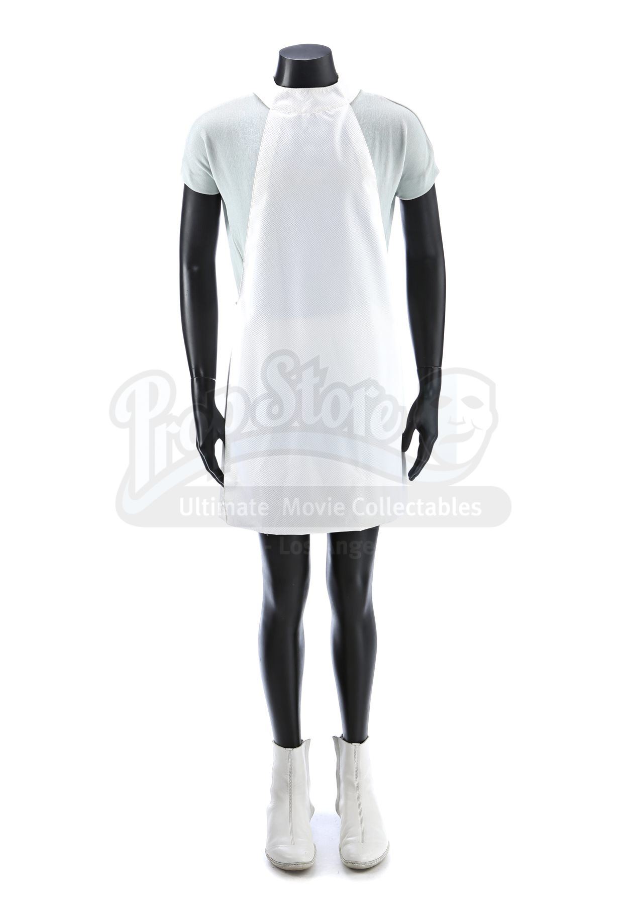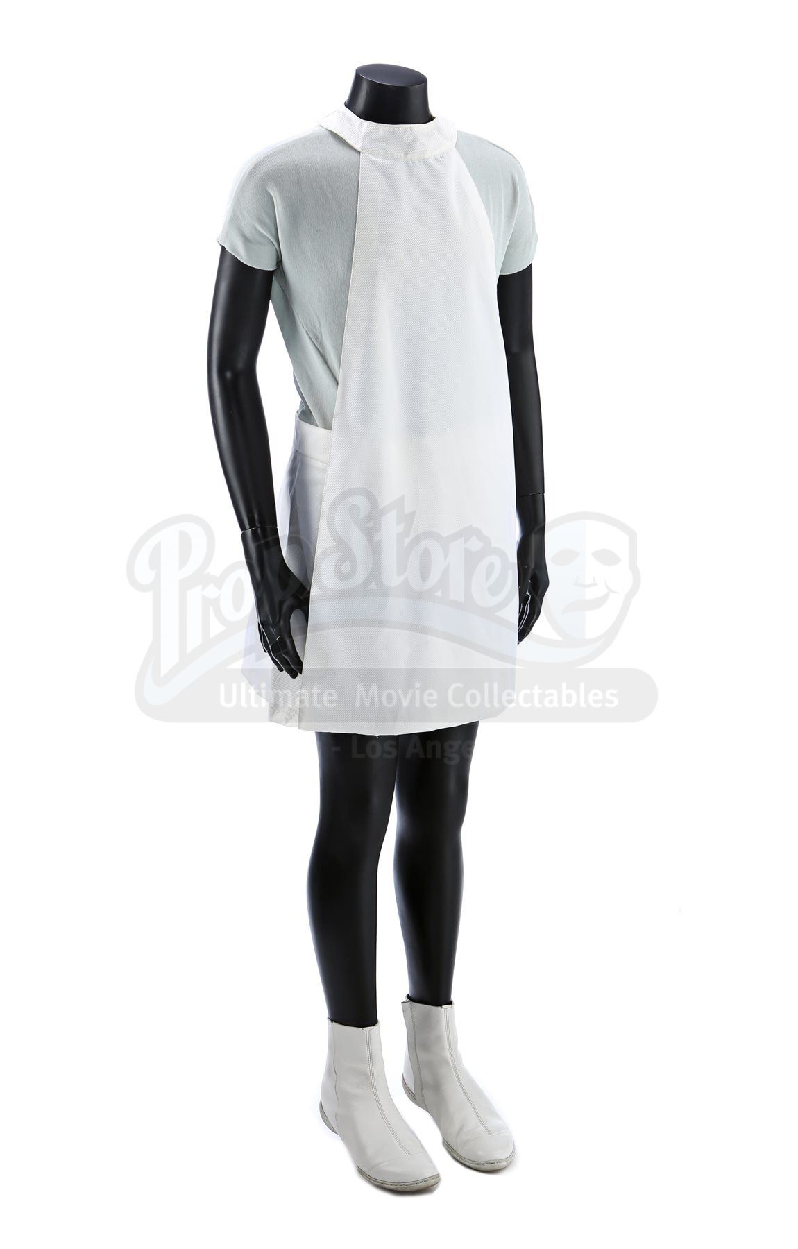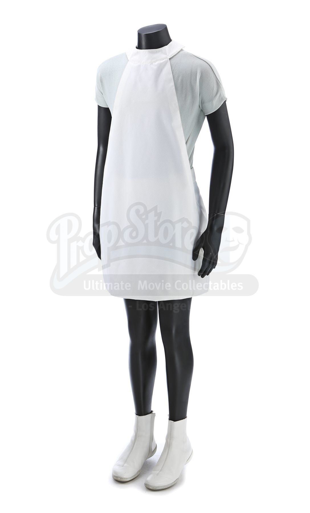 A women's Enterprise medical uniform from Star Trek Into Darkness. Enterprise staff in the medical division wore their white uniforms in the medical quarters. The costume consists of a white medical smock skirt (approximate size small), an undershirt (approximate size extra small) and a pair of boots (marked U.S. size 6.5). The hospital smock is made of a synthetic blend. The undershirt consists of a light blue leotard made of a synthetic blend. The white boots are made of leather.