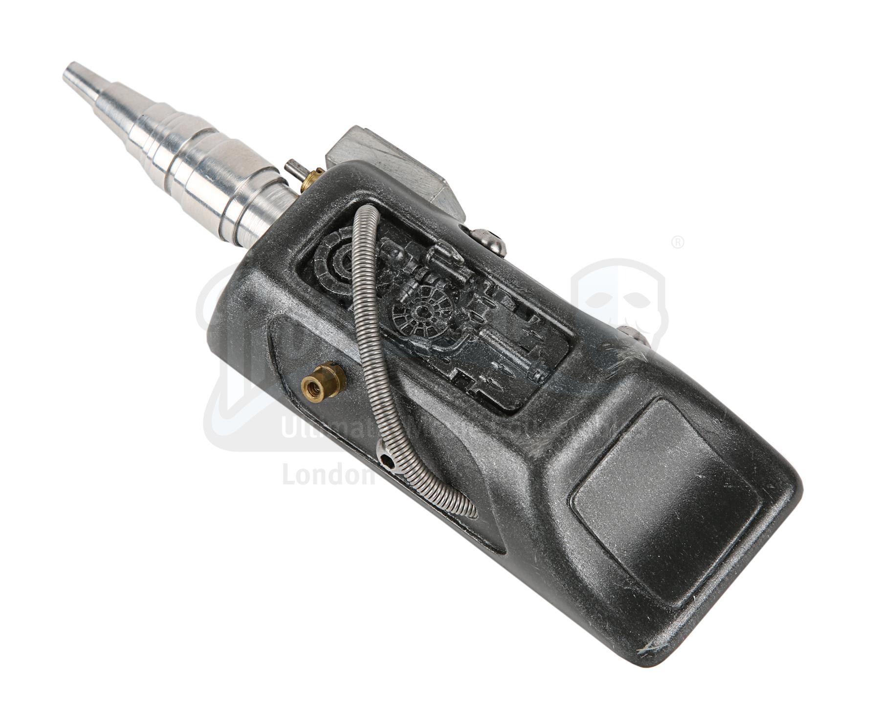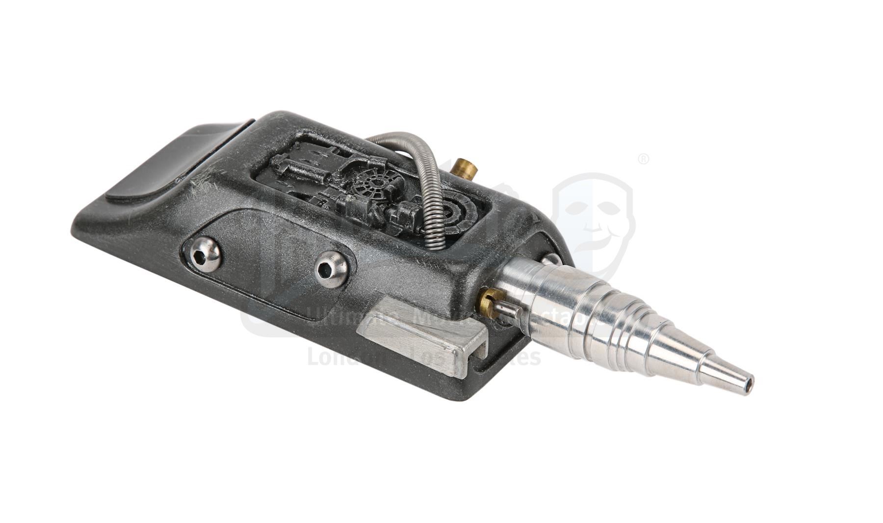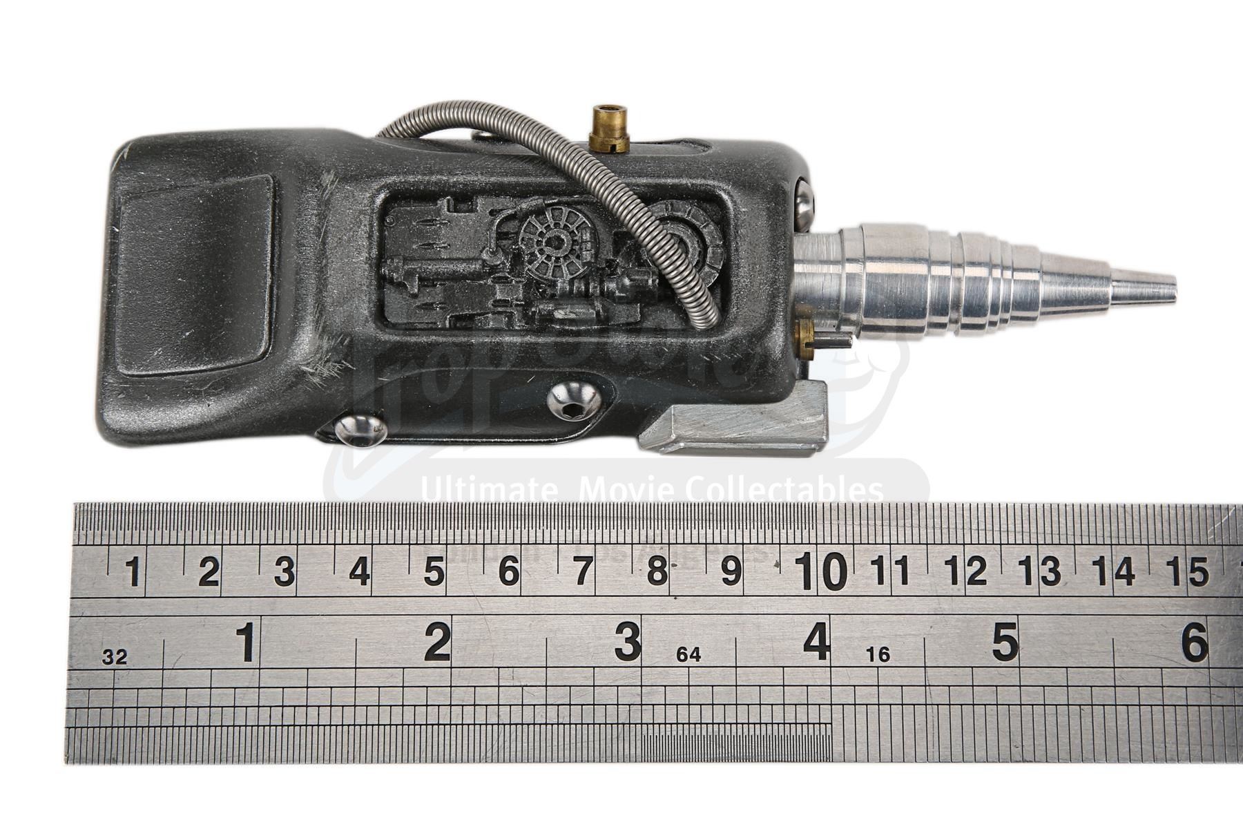 The phaser is made of resin and is painted gunmetal grey. It features a metal tip and has a metal spring running from the top to the side of the phaser. It has metal attachments and mechanical detailing to provide a technical feel, and features Velcro on the underside so it could easily attach to the wearer. The phaser features minor wear from production use, including scuffs and scratches. Dimensions: 14.5 cm x 4.5 cm x 3.5 cm (5 3/4" x 1 3/4" x 1 1/2")