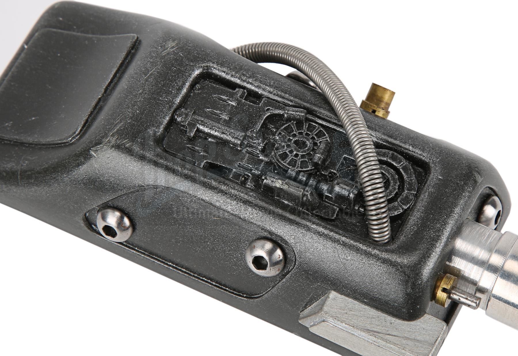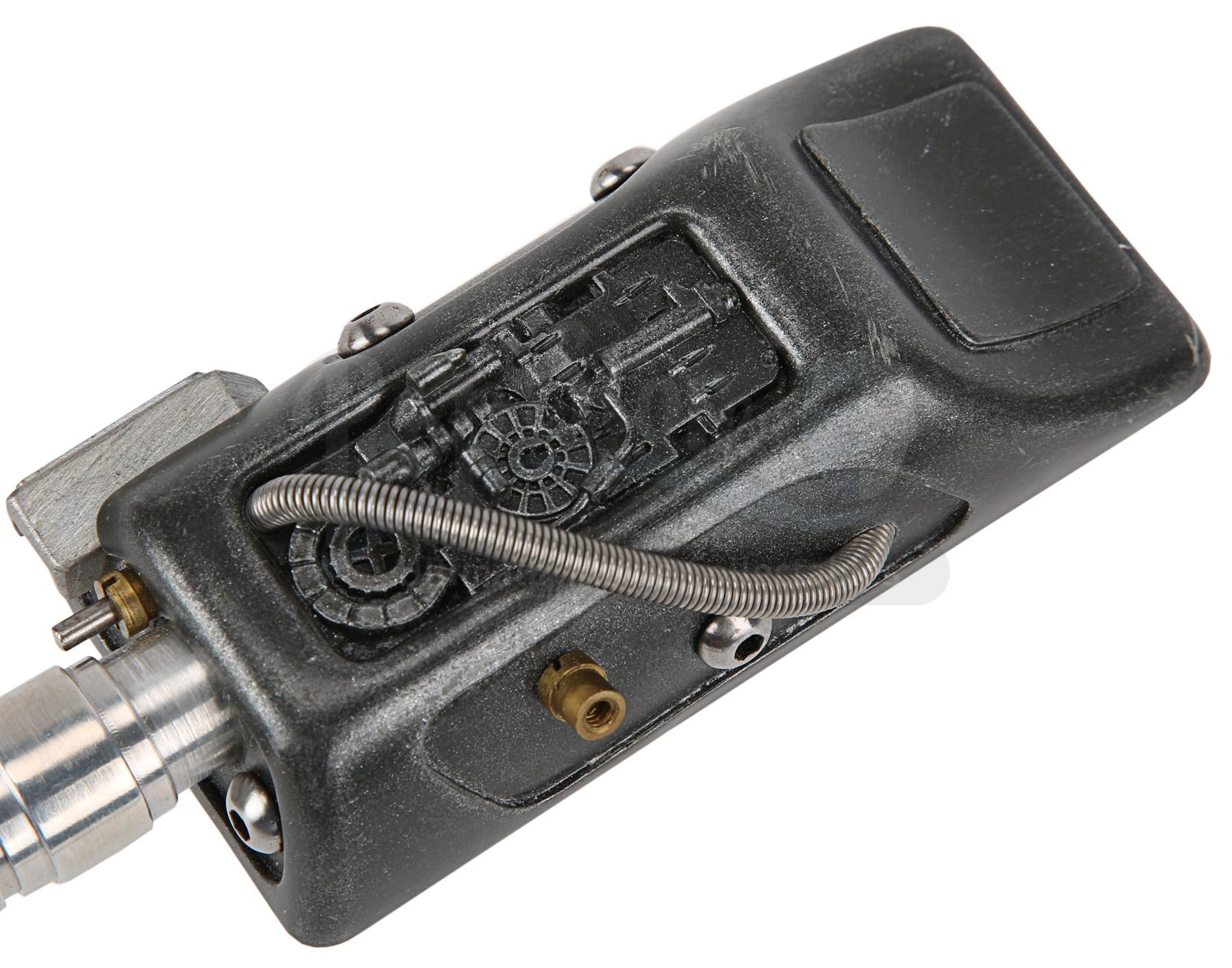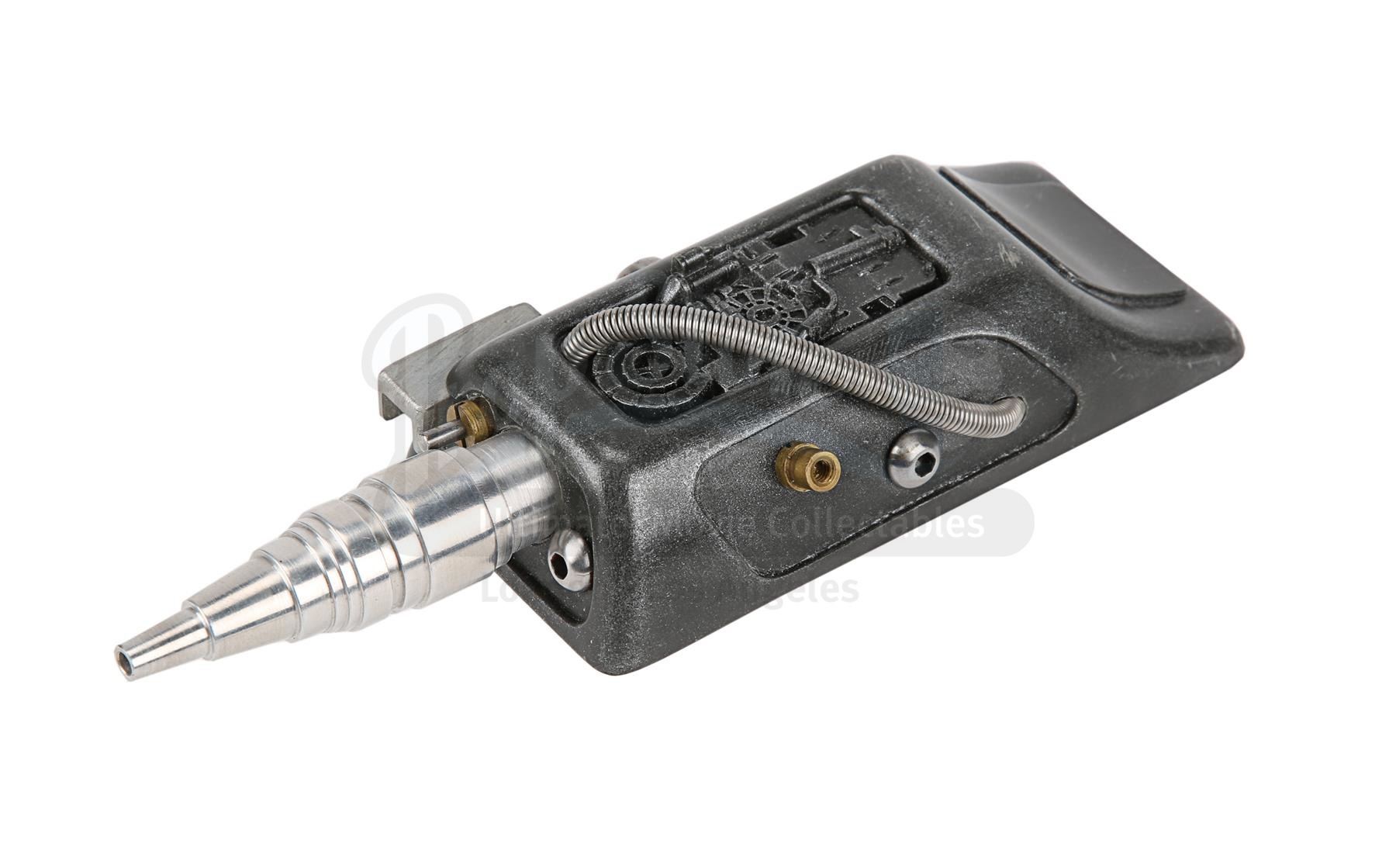 The phaser is made of resin and is painted gunmetal grey. It features a metal tip and has a metal spring running from the top to the side of the phaser. It has metal attachments and mechanical detailing to provide a technical feel, and features Velcro on the underside so it could easily attach to the wearer. The phaser features minor wear from production use, including scuffs and scratches. Dimensions: 14.5 cm x 4.5 cm x 3.5 cm (5 3/4" x 1 3/4" x 1 1/2")