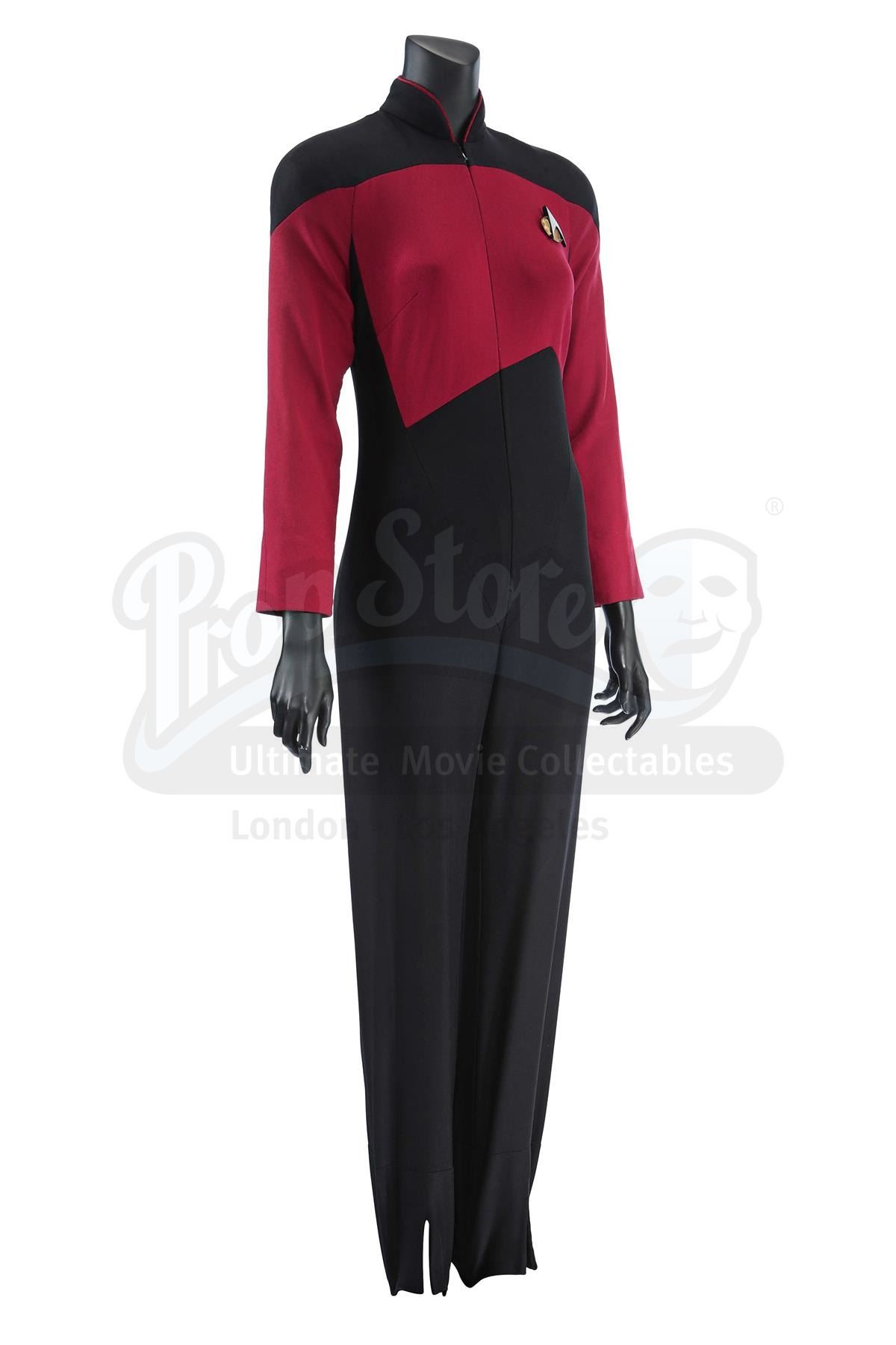A maroon command uniform from Gene Roddenberry's sci-fi television series Star Trek: The Next Generation. Updated Starfleet uniforms were worn from Season 3 onwards by high-ranking crew members of the USS Enterprise, as well as various other Federation members.