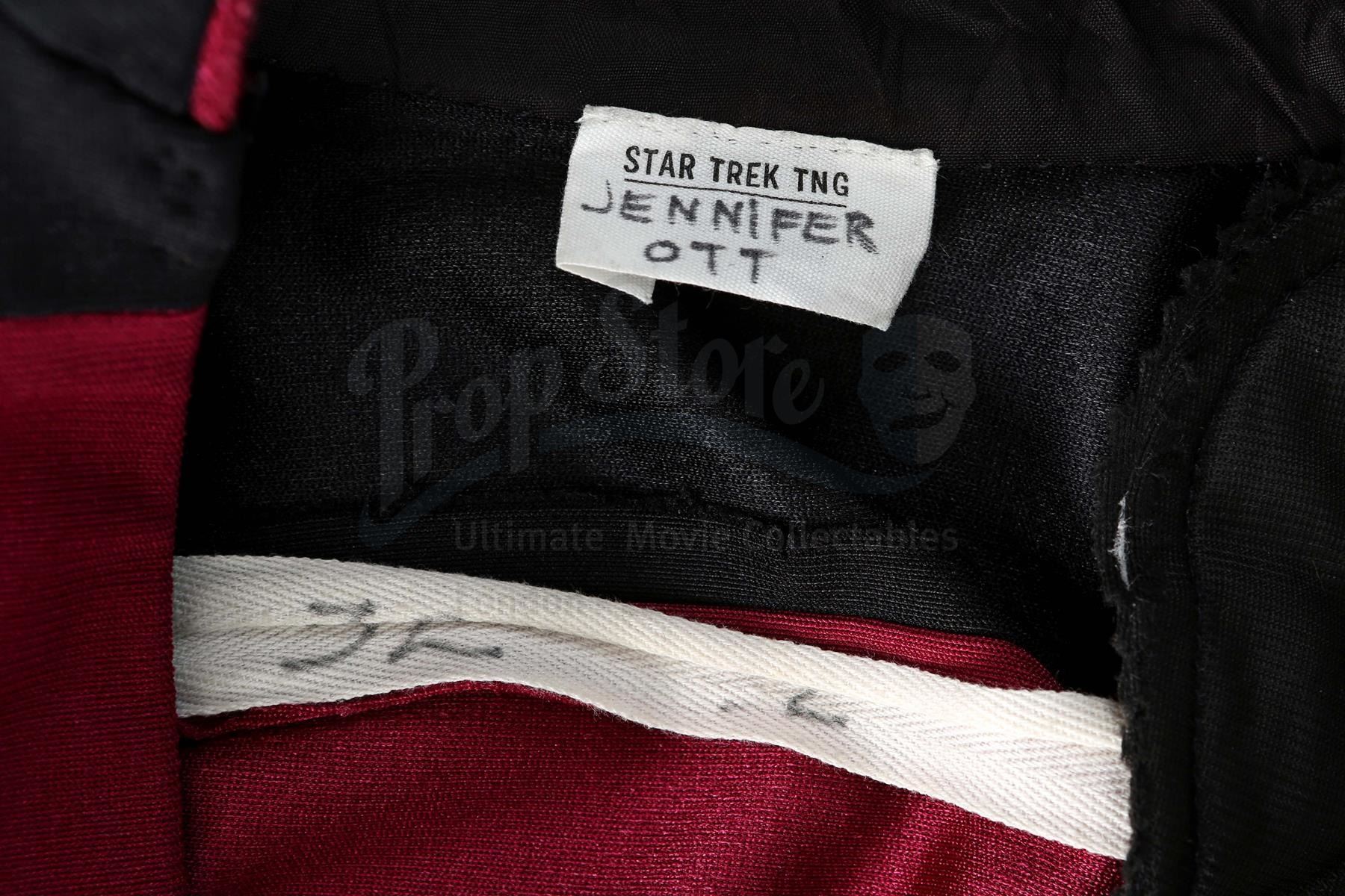This black-and-maroon command division Starfleet uniform is made of Spandex, cotton and polyester. It is marked as size 32 and labelled "Jennifer Ott" for a background actor, and features shoulder pad inserts, a zipper closure on the collar and a faux-gold-and-silver-painted resin communicator badge affixed to the front with Velcro. The uniform exhibits minor signs of wear throughout.