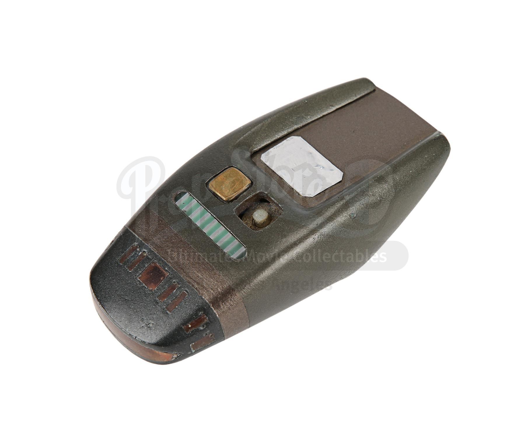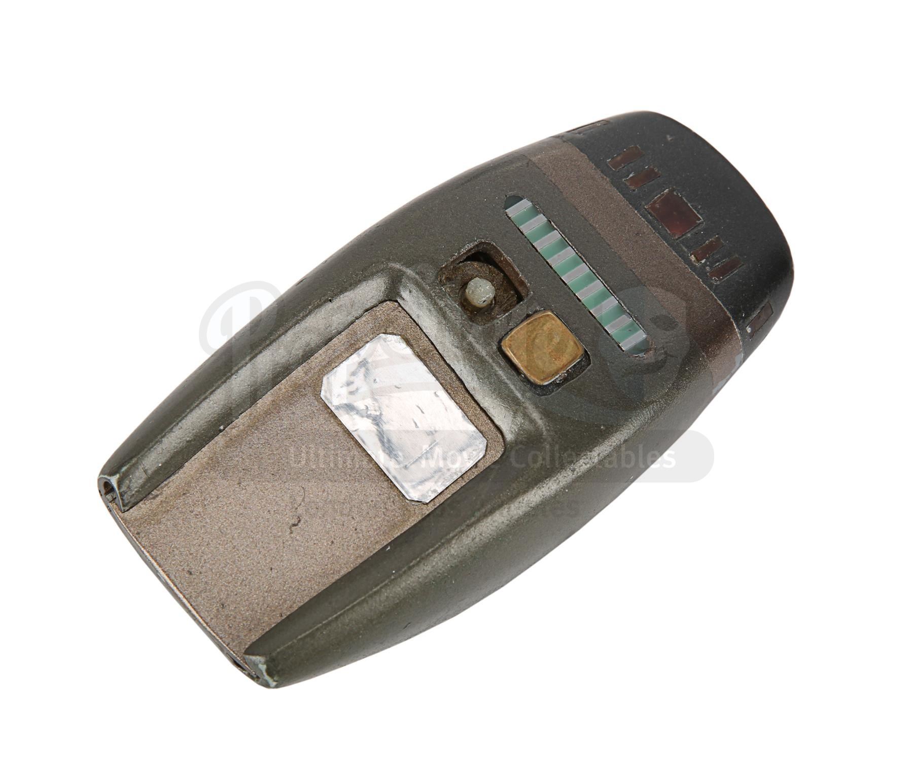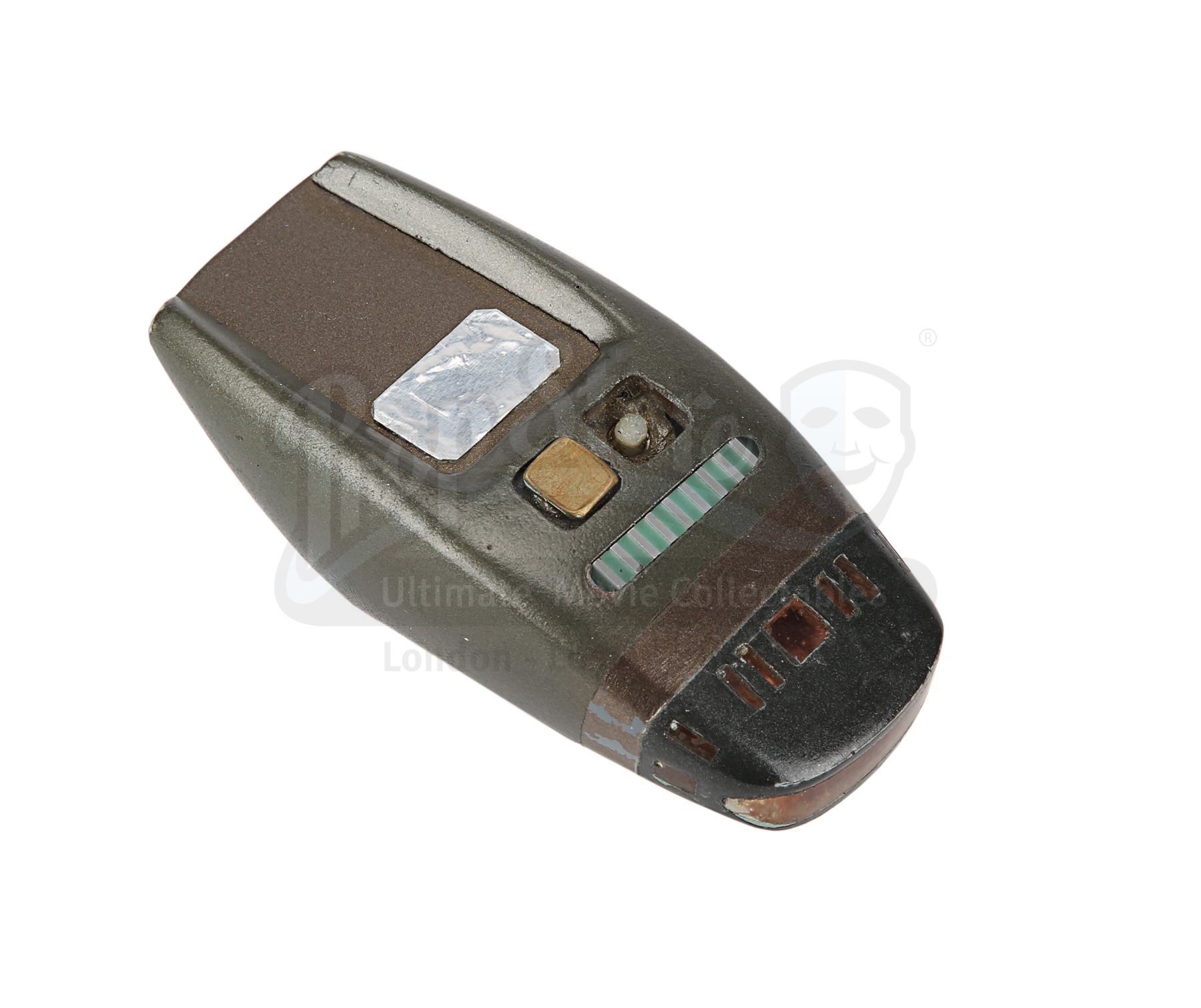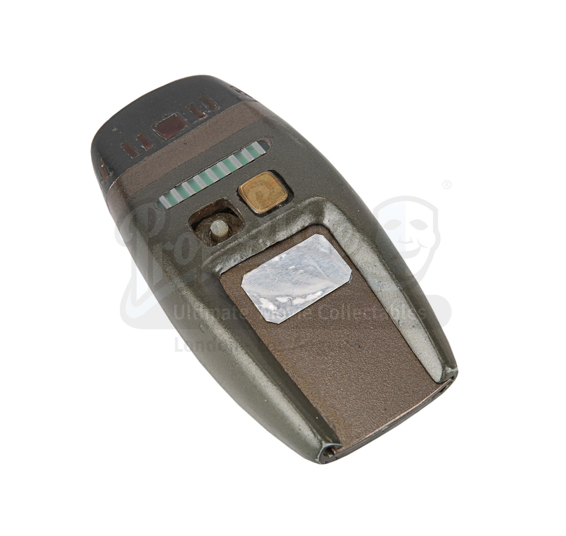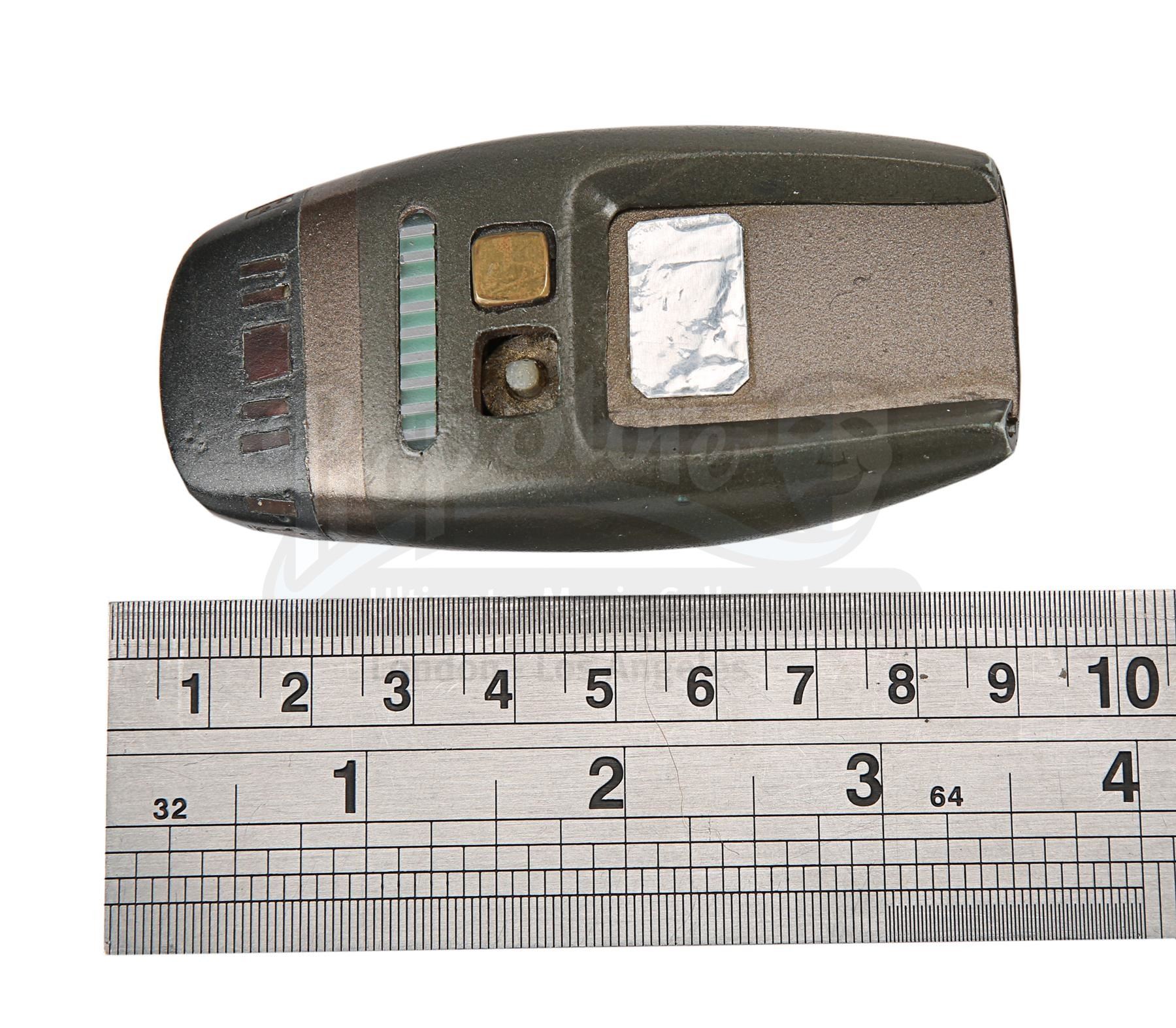 Dubbed the "cricket" by production and fans alike, the phaser is made predominantly of resin, metal and plastic. It has two buttons on the top and a transparent red acrylic front, from which the beam emanates on screen. The top of the phaser slides back, revealing wiring inside, which suggests that the phaser lit up during production. The piece exhibits some wear from production use and age. It has some scuffing and scratches where the grey resin underneath can be seen. One of the two buttons on the top is now missing. Dimensions: 8.5 cm x 4 cm x 3 cm (3 1/4" x 1 1/2" x 1 1/4")