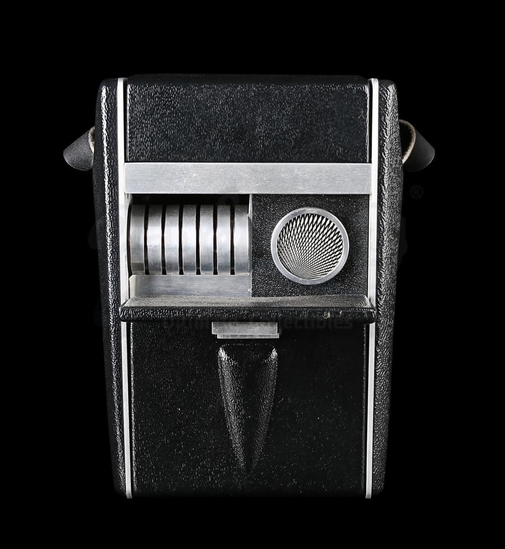 A light-up replica tricorder made by Roadhouse. It is made from milled aluminium parts with a black vacuum-formed body. When powered by a battery the top compartment can be opened, activating the lights and classic tricorder sound. The tricorder has a strap so it can be worn over the shoulder.