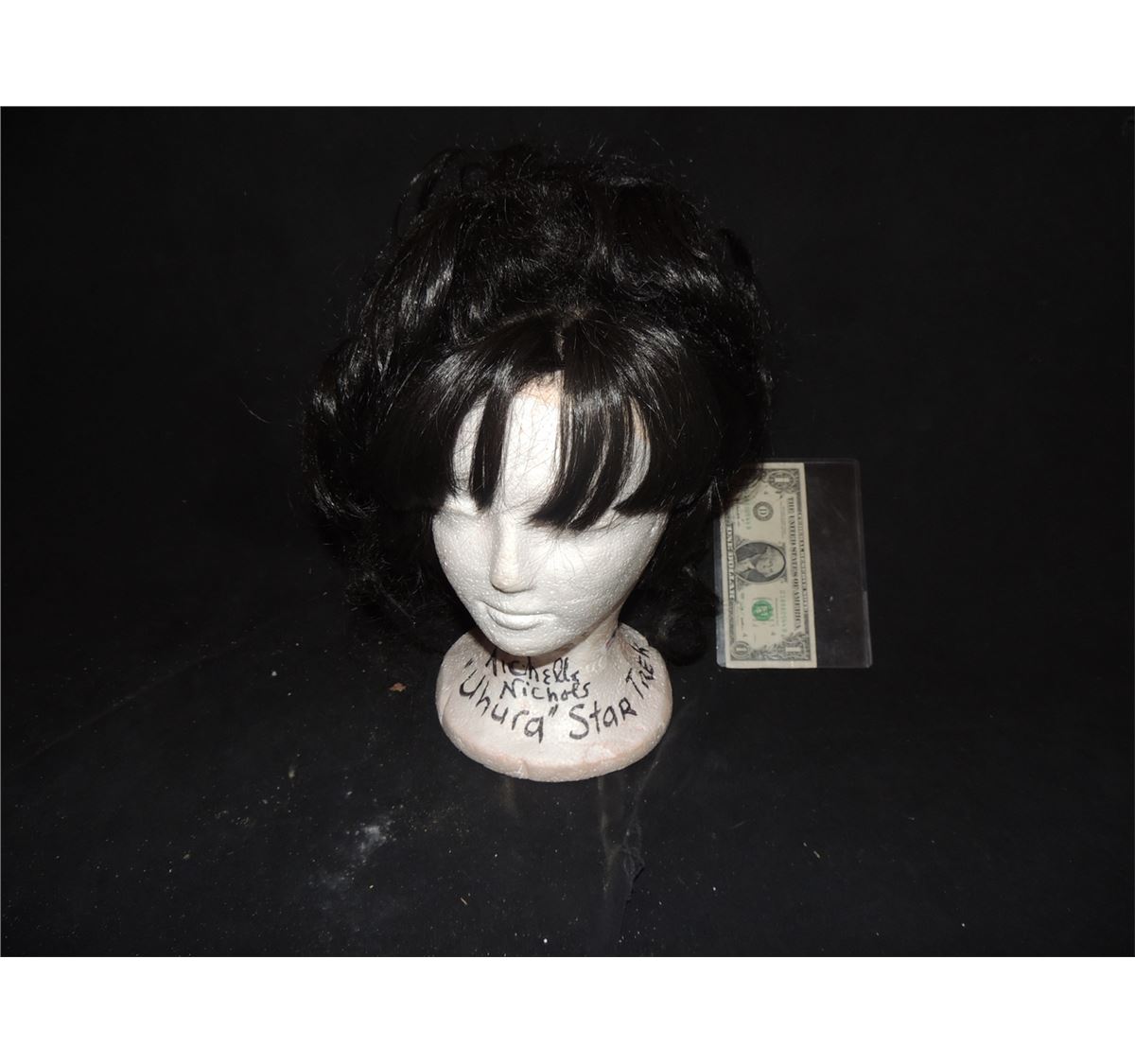 This is the wig Nichele Nichols wears as LT Uhura in the pilot episode of STAR TREK The Original series. Her hair was not long enough for the pilot, and they were afraid dust or sparks would get in so she wore this wig.
