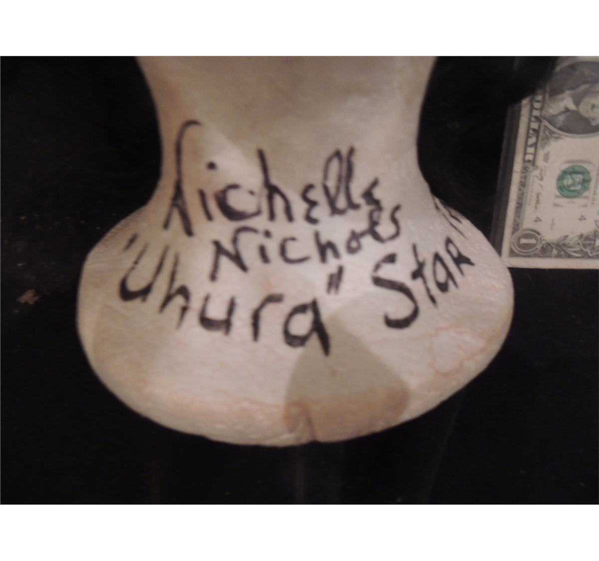This is the wig Nichele Nichols wears as LT Uhura in the pilot episode of STAR TREK The Original series. Her hair was not long enough for the pilot, and they were afraid dust or sparks would get in so she wore this wig.