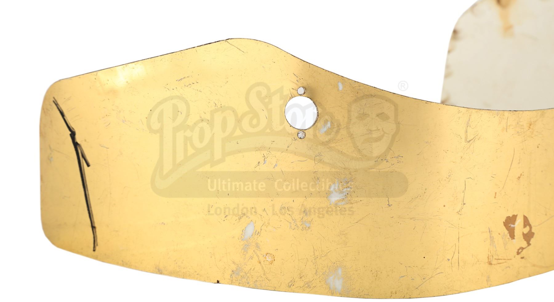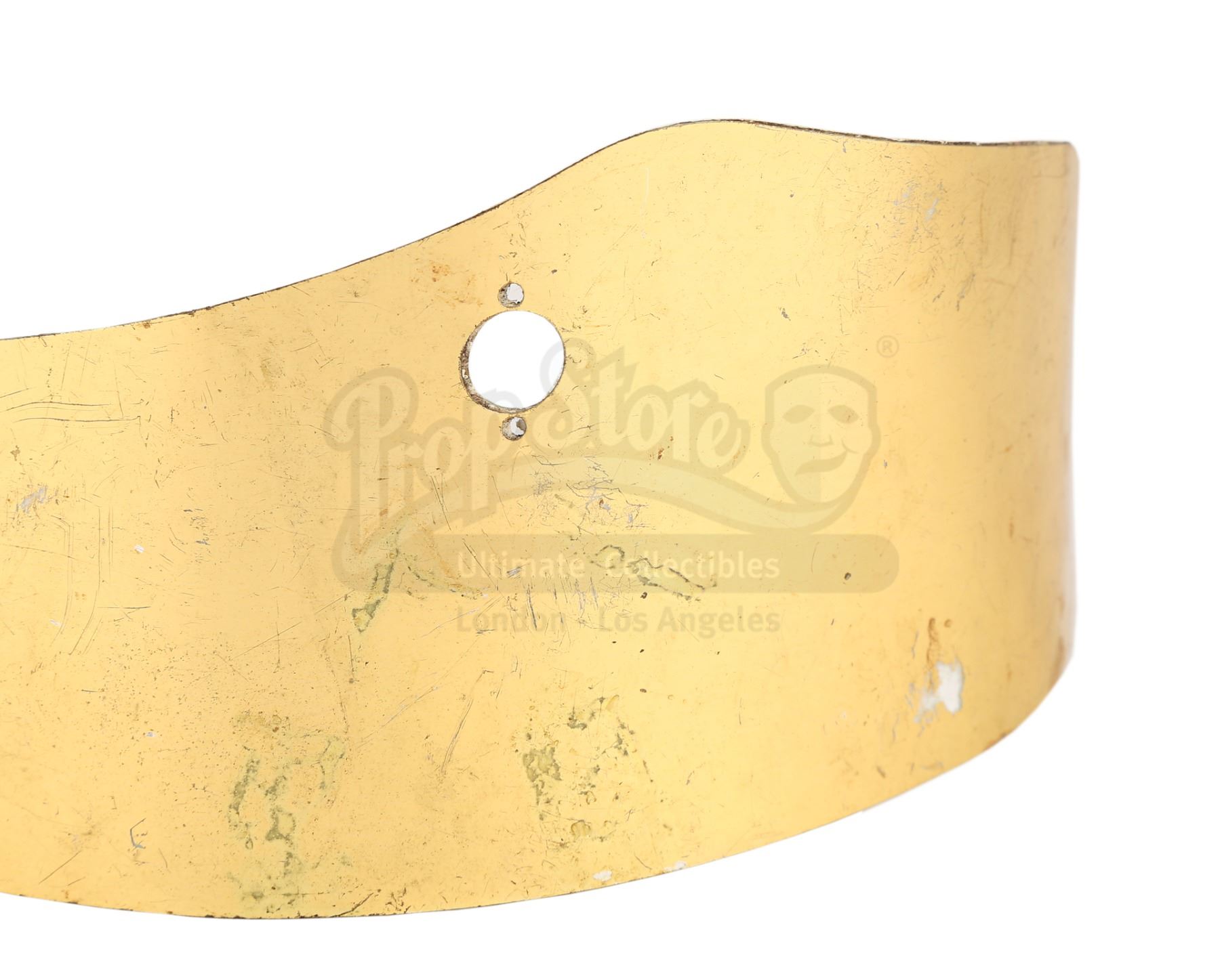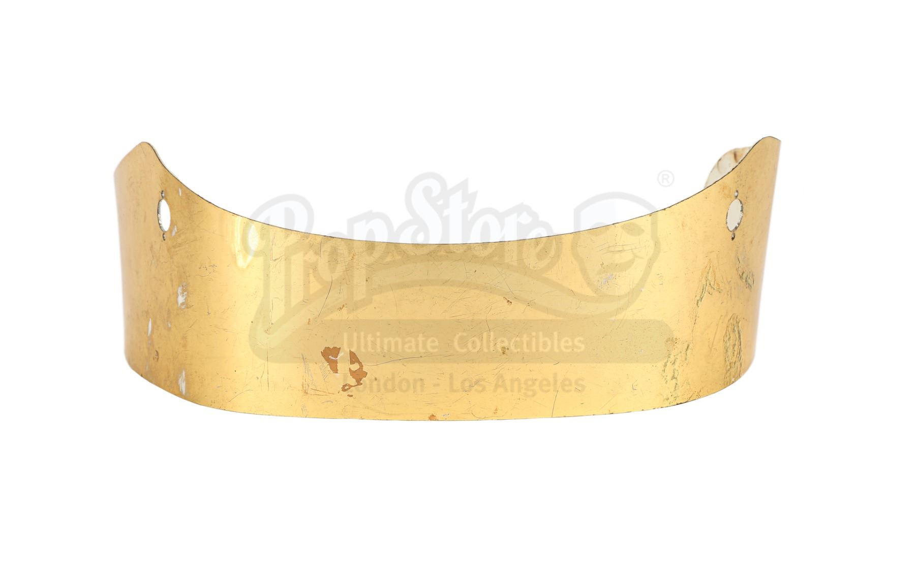 The neck plate consists of a curved piece of plastic with two holes present along the top edge, the outer side displaying a faux-gold-plated finish. Pins were threaded through the holes into a bayonet fitting located on the neck bolts of the mask, locking the head section of the costume in place. Burn marks are present on the interior where heat was used to create the curved shape, and a line in black marker pen is present on the right side of the exterior. The neck plate displays signs of wear from production use, including scratches, scuffs to the plated finish, and remnants of glue. Dimensions: 15 cm x 20 cm x 7.5 cm (6" x 8" x 3")
