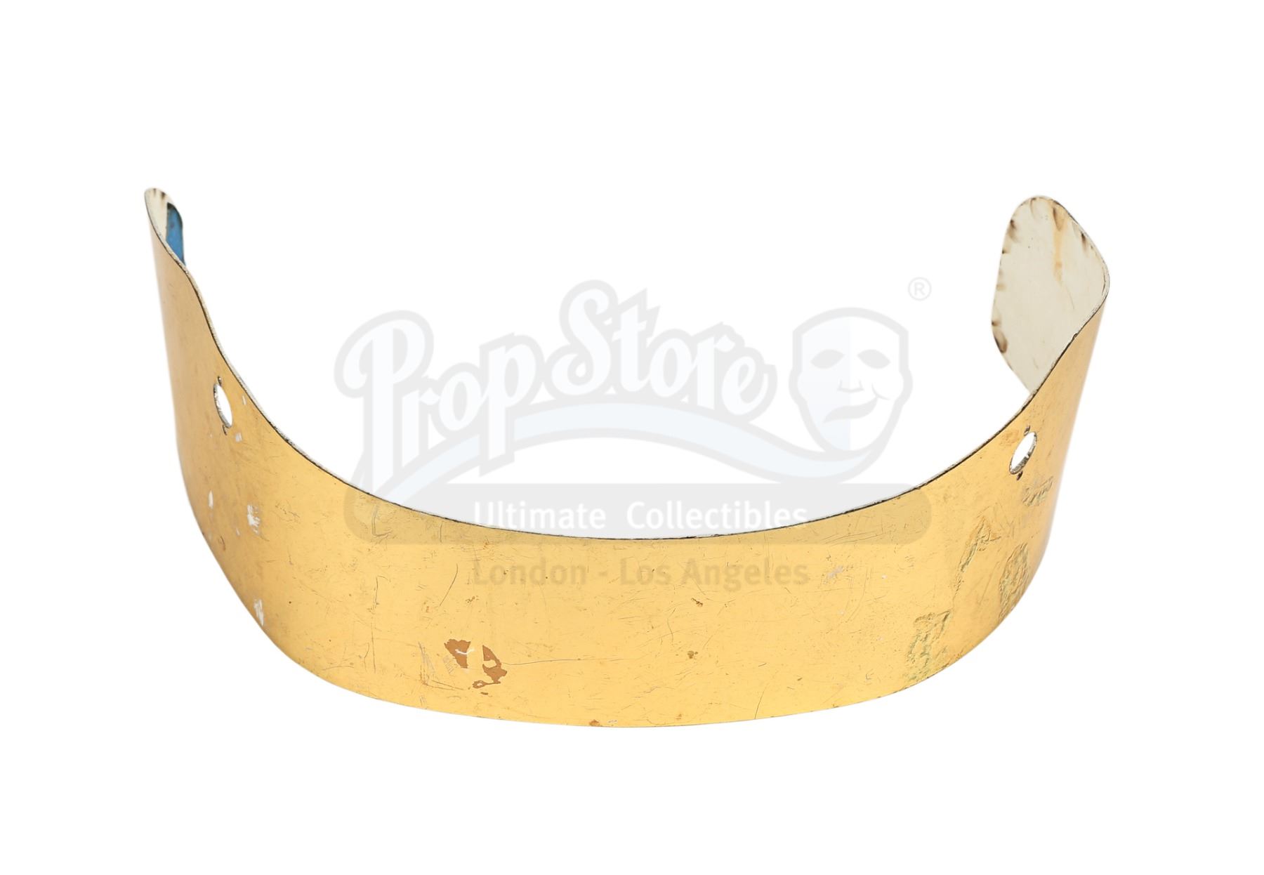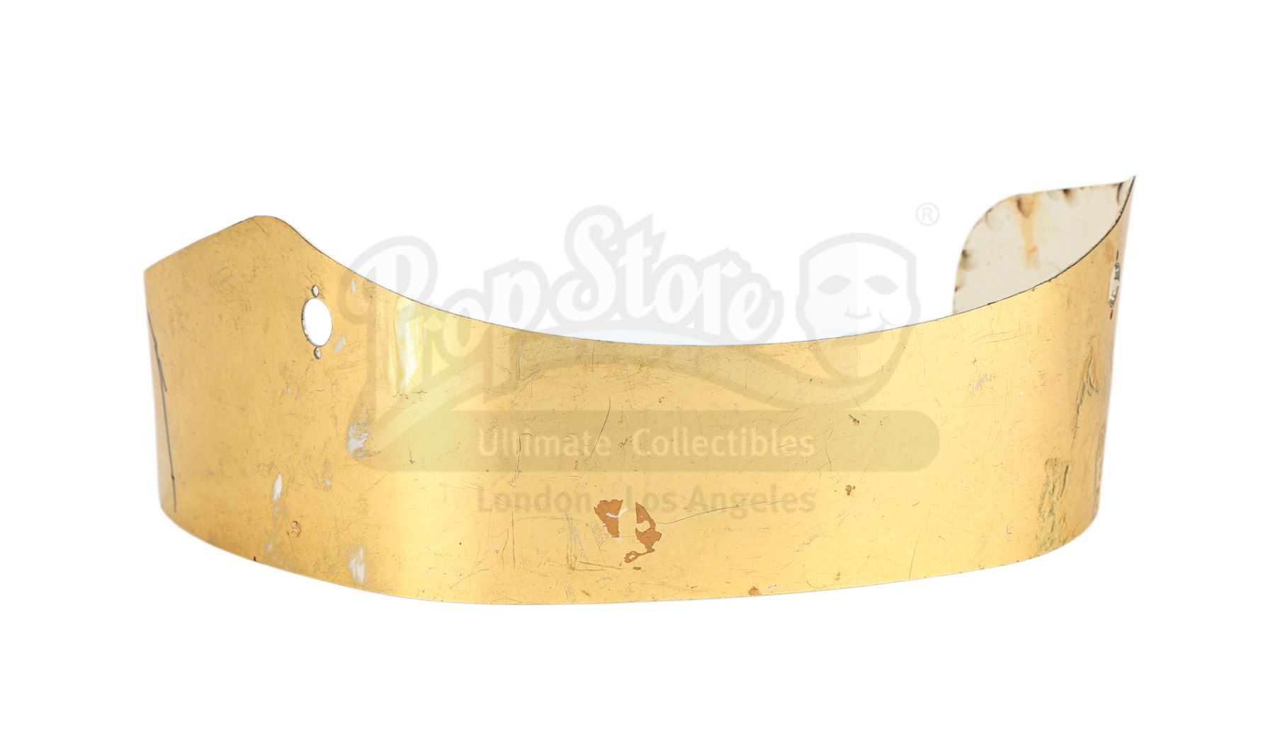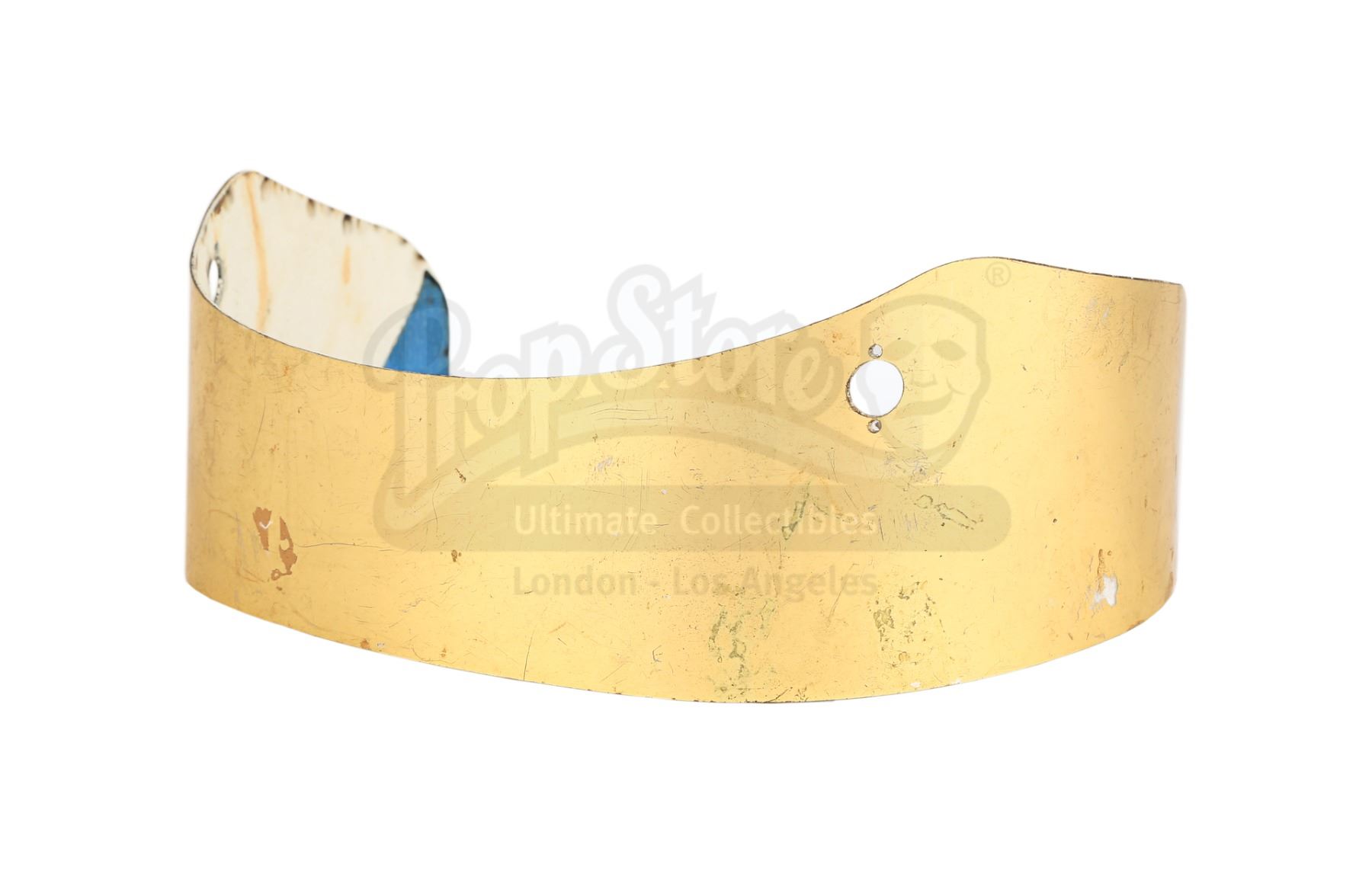 The neck plate consists of a curved piece of plastic with two holes present along the top edge, the outer side displaying a faux-gold-plated finish. Pins were threaded through the holes into a bayonet fitting located on the neck bolts of the mask, locking the head section of the costume in place. Burn marks are present on the interior where heat was used to create the curved shape, and a line in black marker pen is present on the right side of the exterior. The neck plate displays signs of wear from production use, including scratches, scuffs to the plated finish, and remnants of glue. Dimensions: 15 cm x 20 cm x 7.5 cm (6" x 8" x 3")