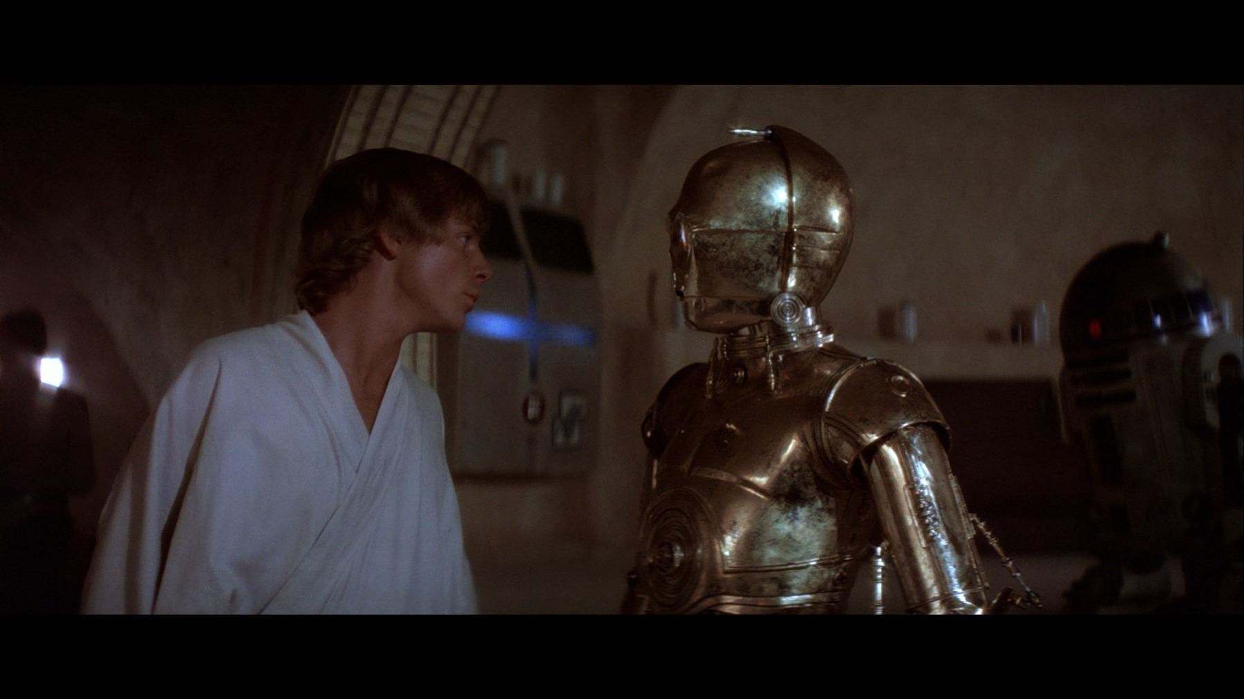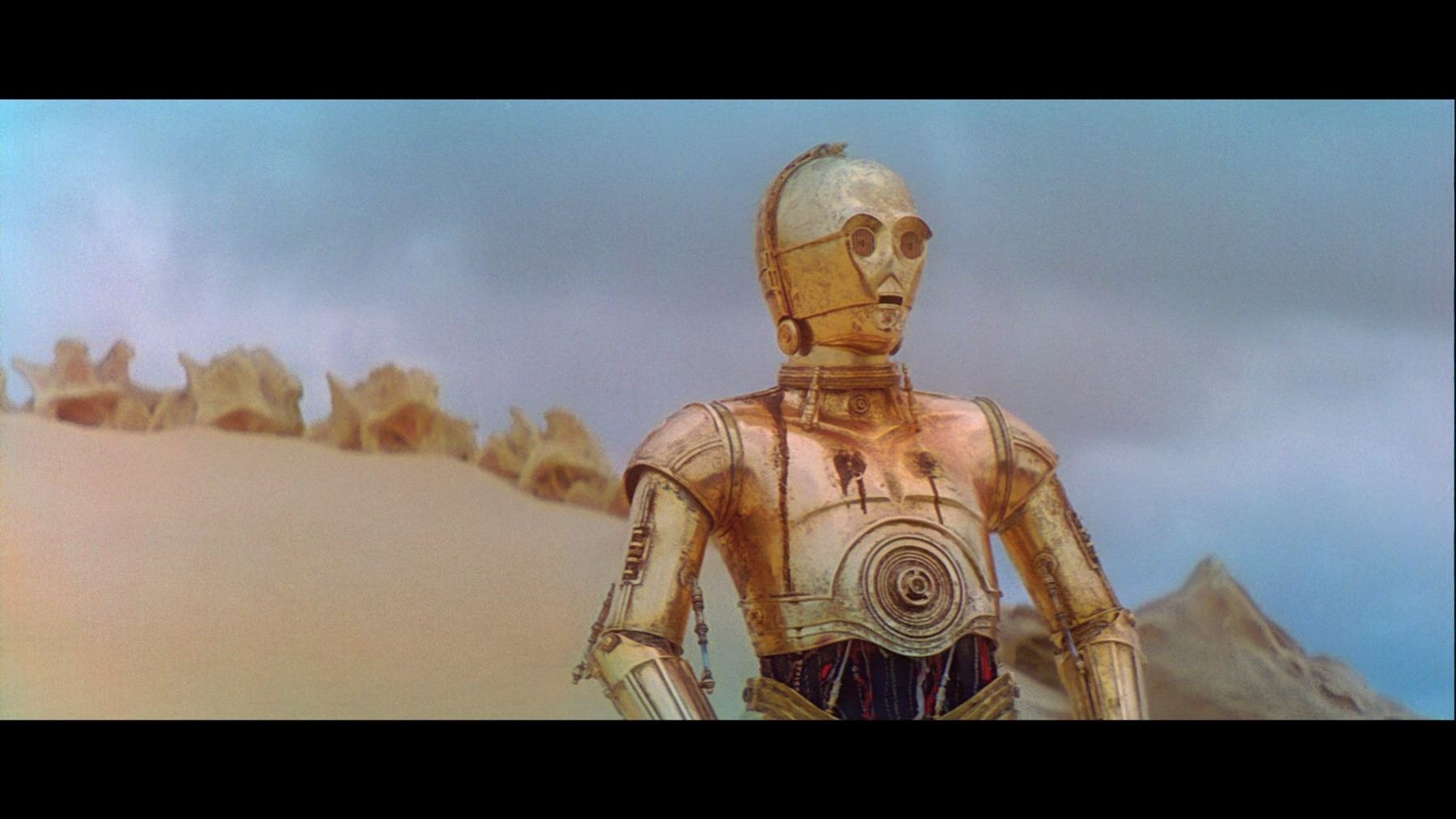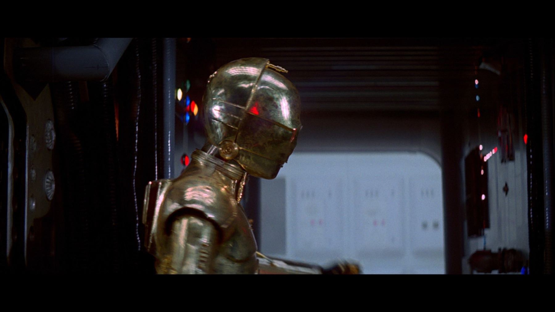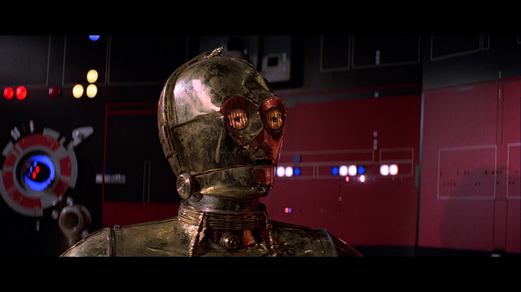 A C-3PO (Anthony Daniels) neck plate from George Lucas' Star Wars: A New Hope. Daniels wore a curved plate around his neck as part of C-3PO's distinctive costume throughout the film.