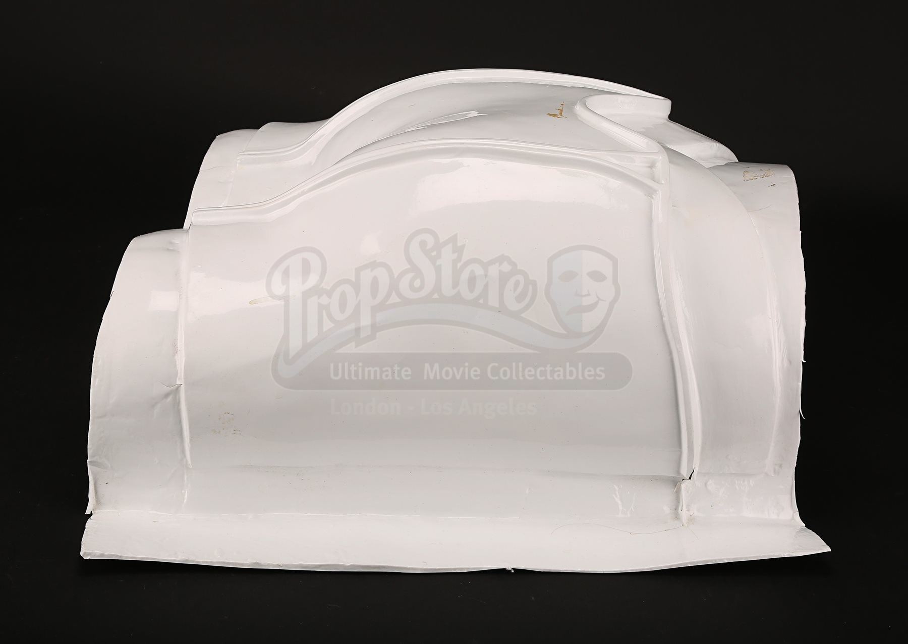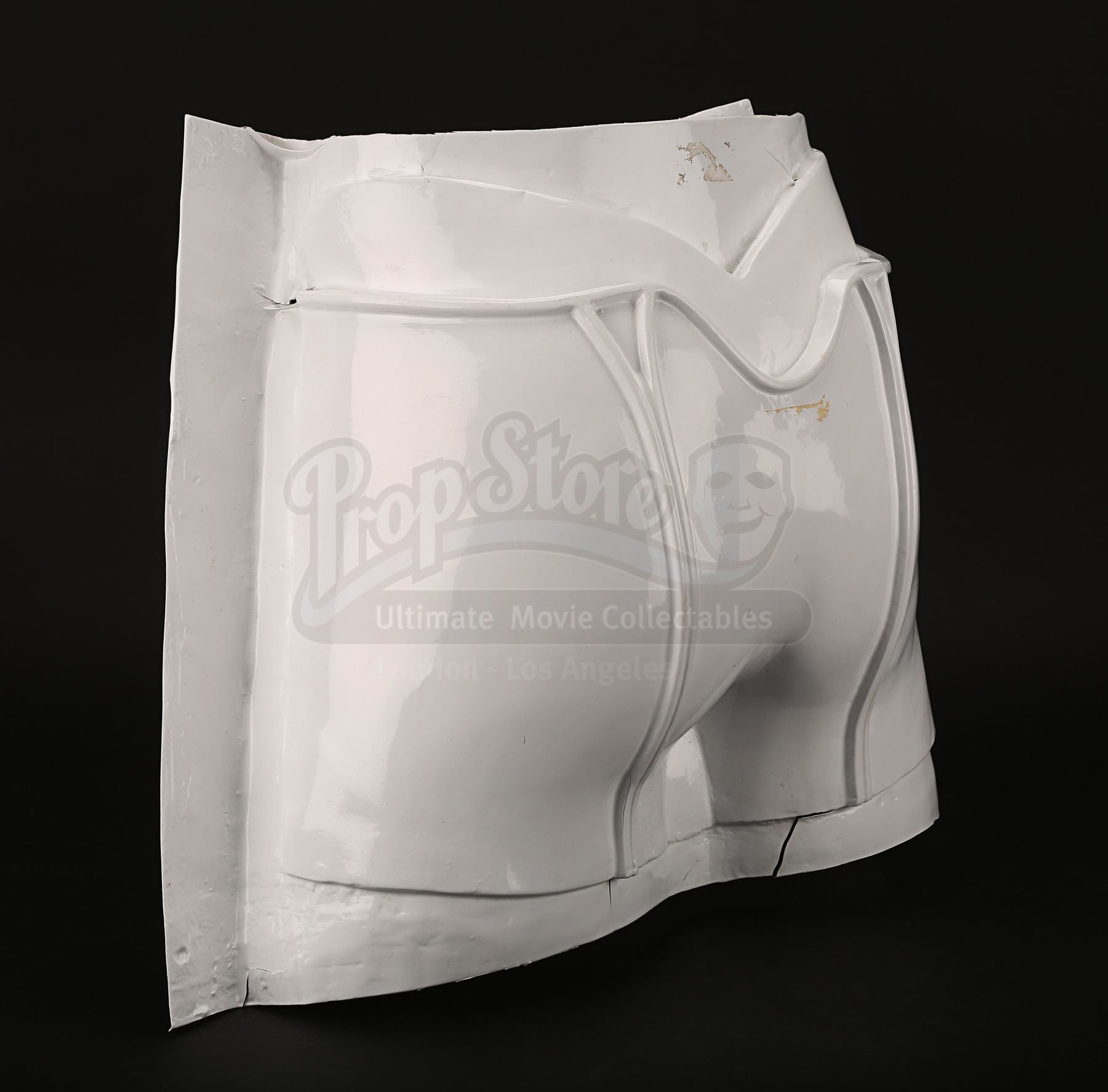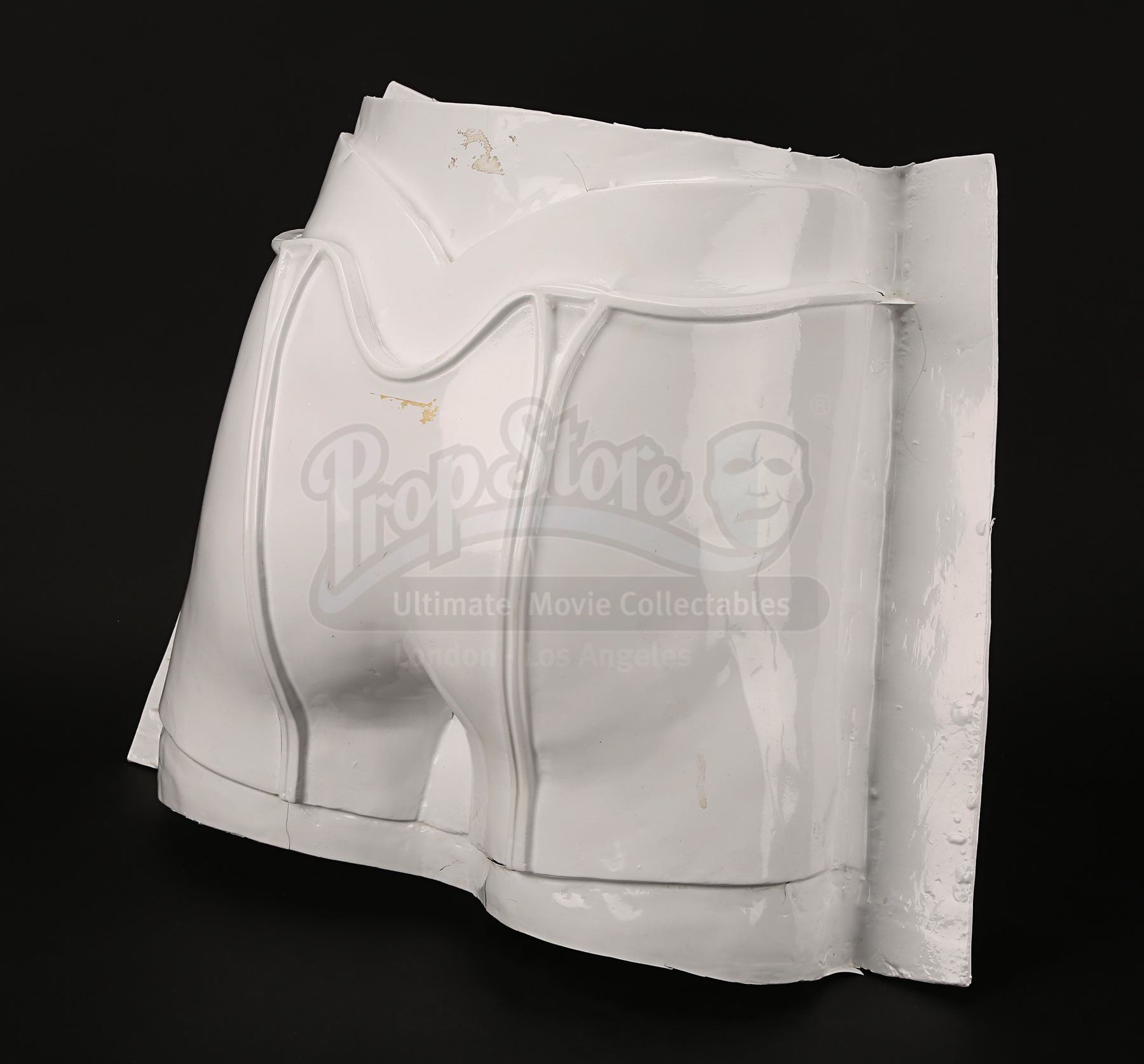 A C-3PO rear section cast from George Lucas’ Star Wars: A New Hope. Originally conceptualised by Ralph McQuarrie, the C-3PO costume was constructed in sections by the prop department to allow actor Anthony Daniels to move as freely as possible while wearing it. A plaster body cast was taken of Daniels, which was sculpted over in clay, to create the robot details. A behind-the-scenes photograph depicts the sculptor Brian Muir overseeing this process. Body plates were ultimately created with vacuum-formed plastic and adhered to the actor’s undersuit.