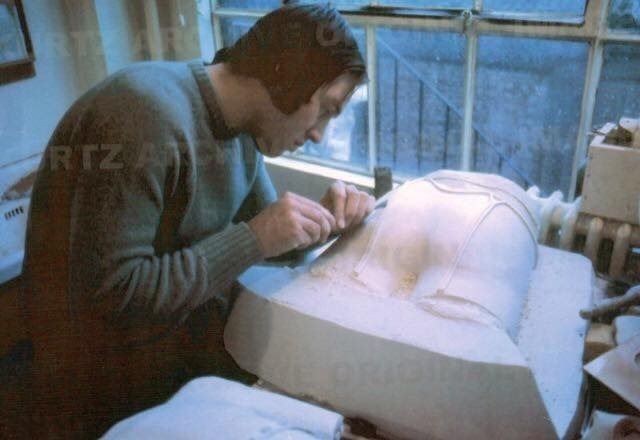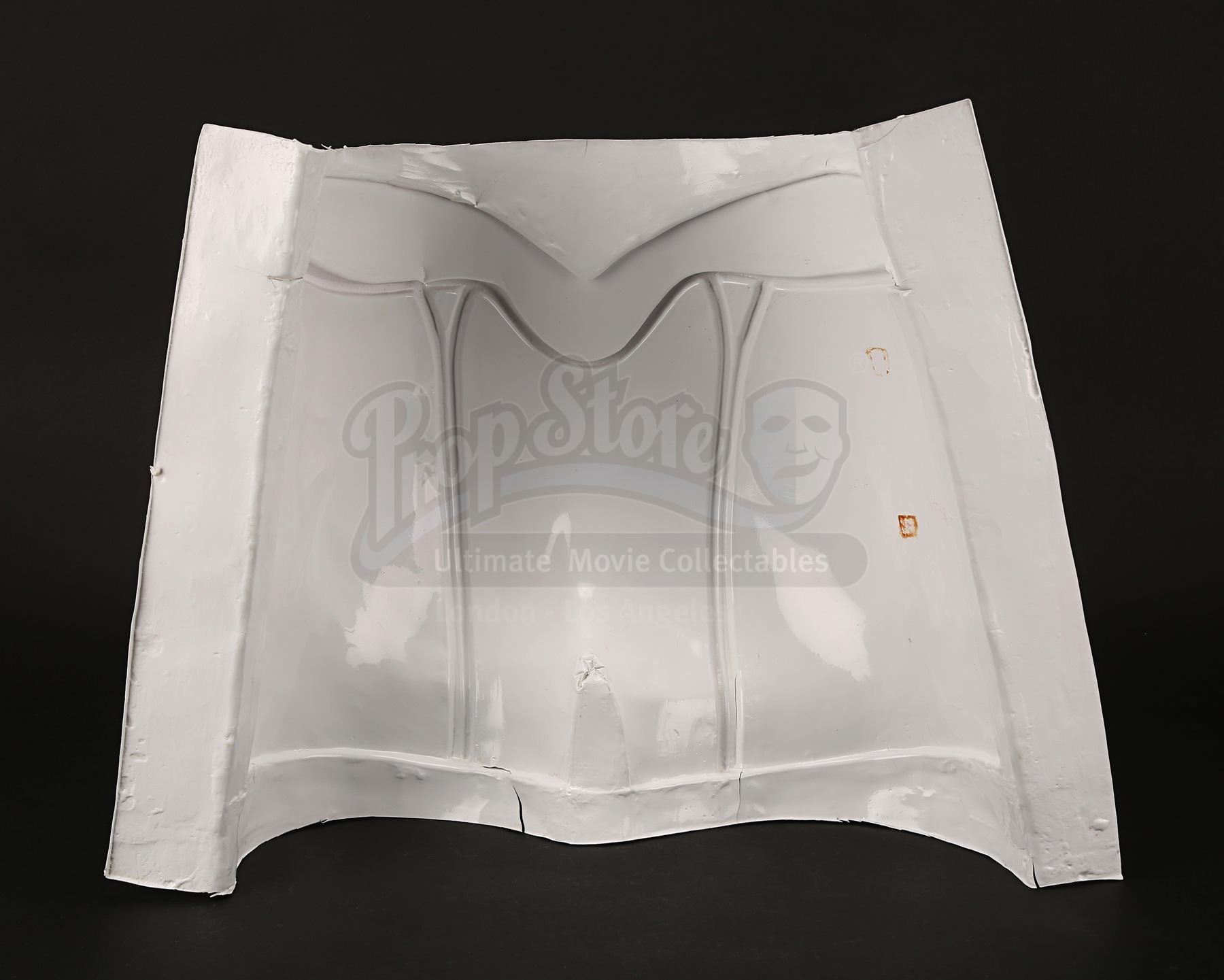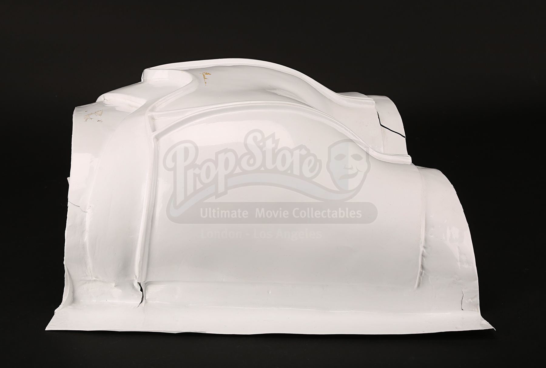 A C-3PO rear section cast from George Lucas’ Star Wars: A New Hope. Originally conceptualised by Ralph McQuarrie, the C-3PO costume was constructed in sections by the prop department to allow actor Anthony Daniels to move as freely as possible while wearing it. A plaster body cast was taken of Daniels, which was sculpted over in clay, to create the robot details. A behind-the-scenes photograph depicts the sculptor Brian Muir overseeing this process. Body plates were ultimately created with vacuum-formed plastic and adhered to the actor’s undersuit.