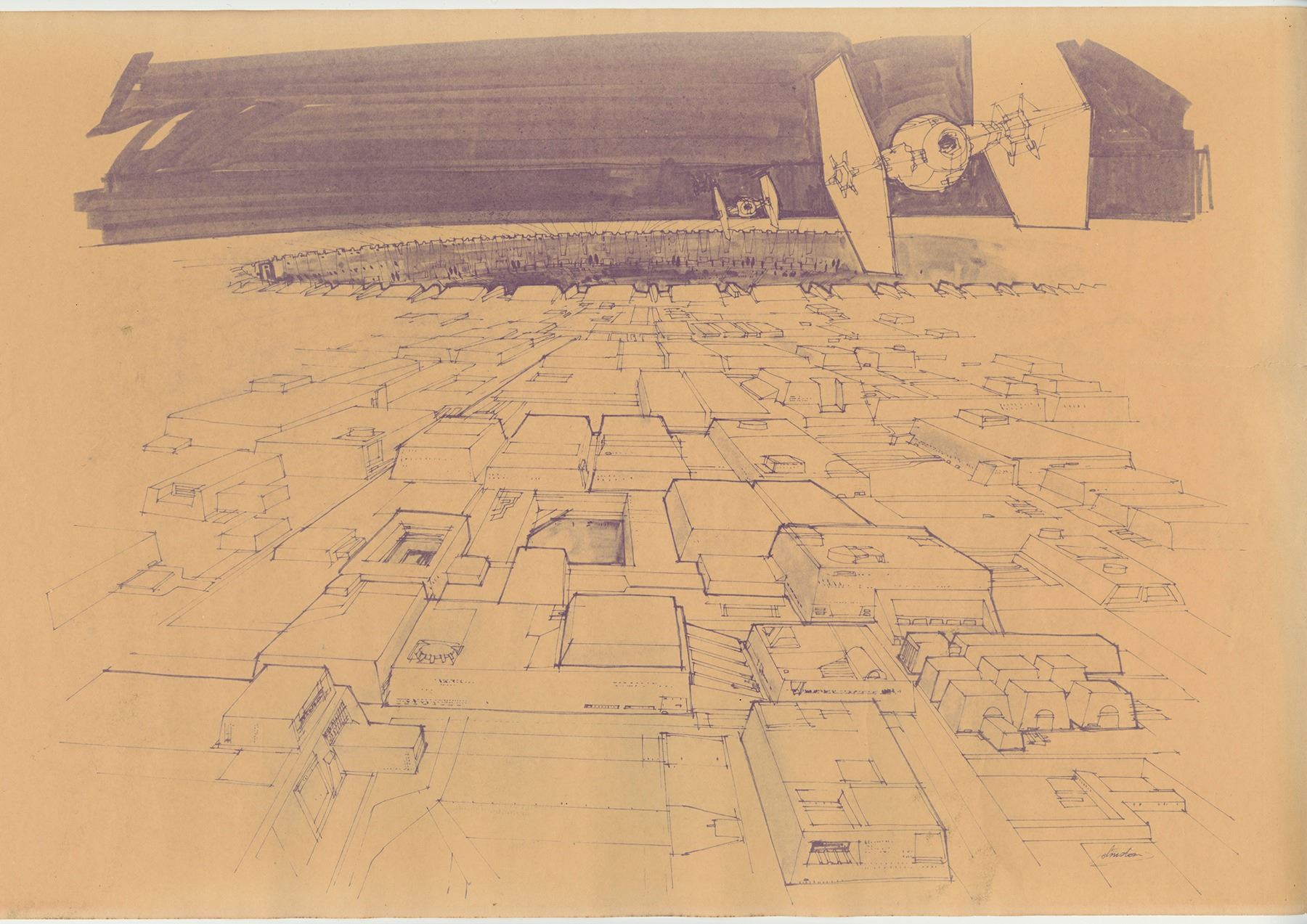 A dyeline of Imperial TIE fighters flying over the Death Star from George Lucas’ Star Wars: A New Hope. Originally drawn by Joe Johnston, this production copy was created using a dyeline printer before being issued to the Industrial Light & Magic model miniature department.