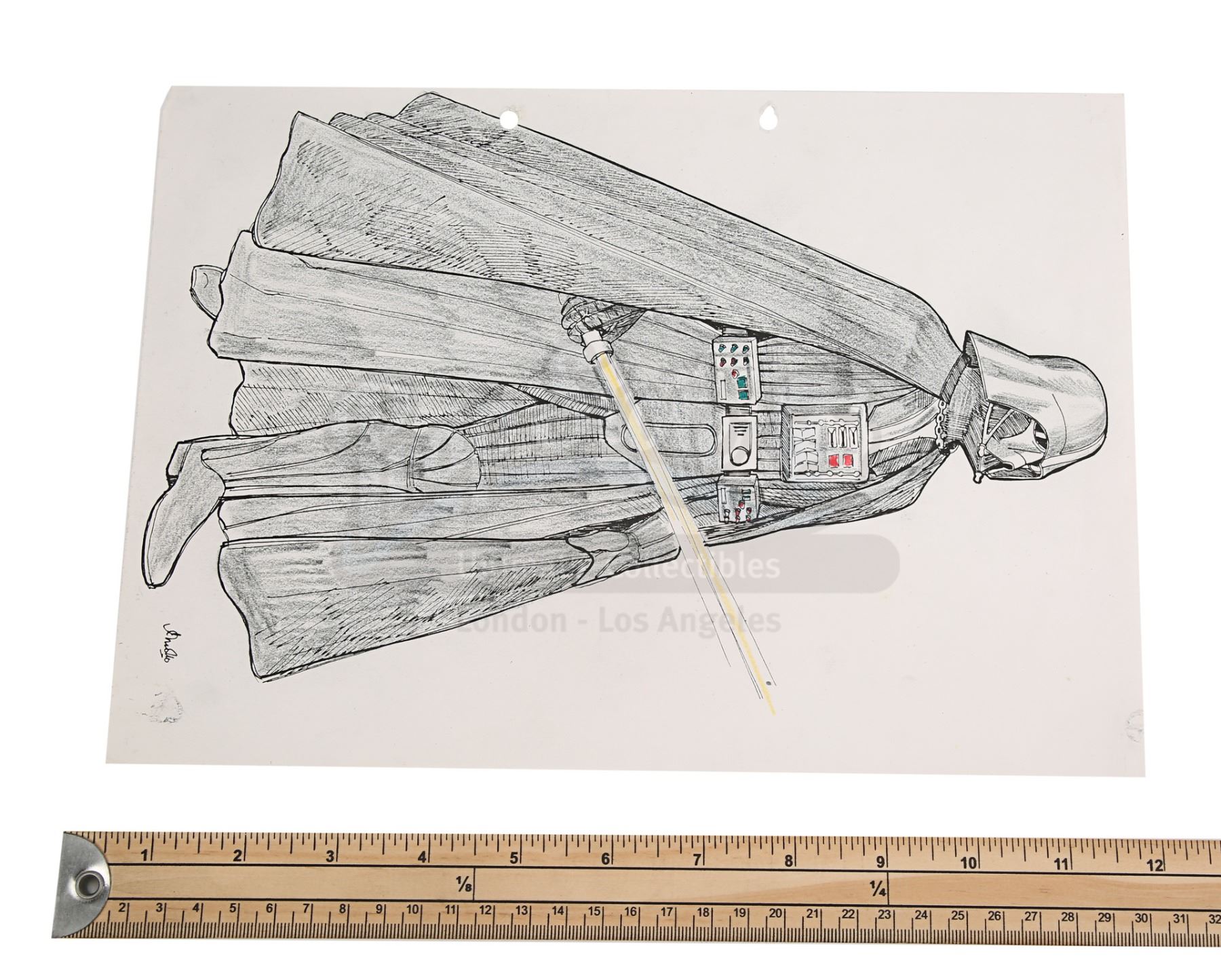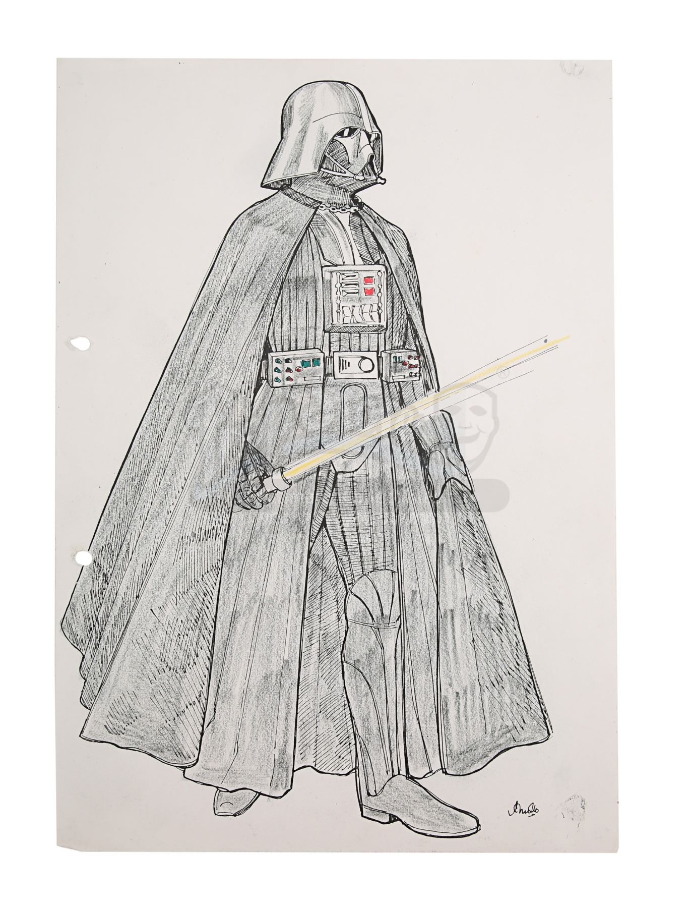 The design is a printed copy that was hand-coloured by Mollo, and exactly matches an illustration seen in issue 23 of Starburst magazine published in August 1980. In his interview with Starburst, Mollo explained that "the first Darth Vader was wearing a motorcycle suit, and a sort of opera cloak, and a Nazi steel helmet, and a gas mask, and a medieval breastplate, all from different departments, all brought in together and put on, and it seemed to work". The sketch, coloured with pencil, features Vader in an imposing stance. It has two holes punched on the left edge, sticky tack marks on the front and back corners, and there is a small tear on the top-right corner. Dimensions: 29.5 cm x 21 cm (11 1/2" x 8 1/4")