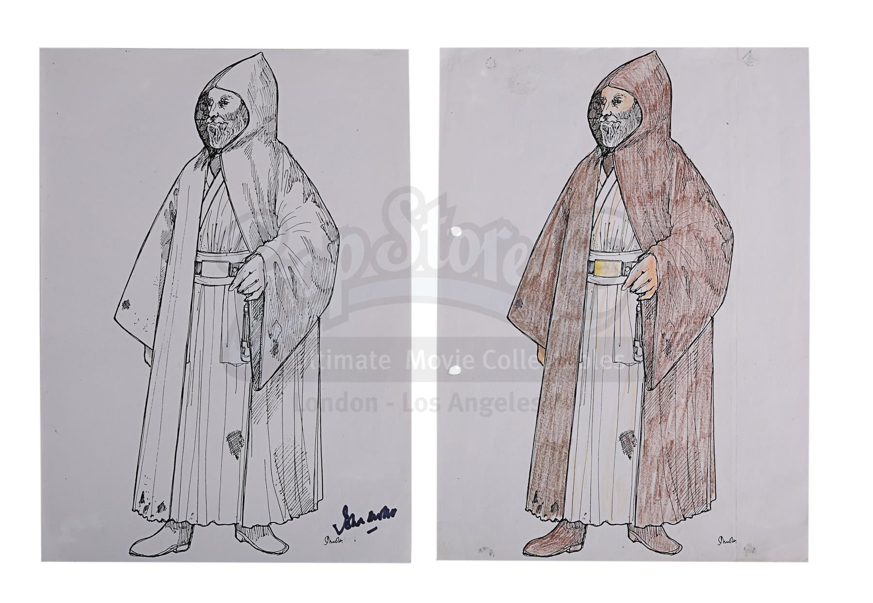 A pair of Obi-Wan (Alec Guinness) costume designs by Oscar-winning costume designer John Mollo, from George Lucas' Star Wars: A New Hope. One page is a printed copy that was hand-coloured by Mollo, and matches exactly to an illustration seen in issue 23 of Starburst magazine. The other page is a printed copy of the same illustration, without additional work by hand, though it is signed by Mollo in blue ink. In his interview with the Starburst, Mollo explained, "George [Lucas] wanted Obi-Wan Kenobi to look like a cross between a monk and a samurai knight."