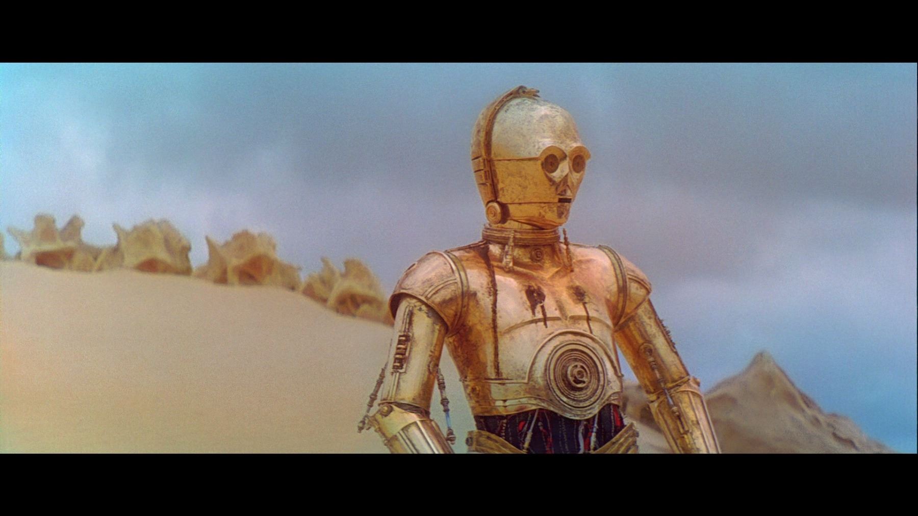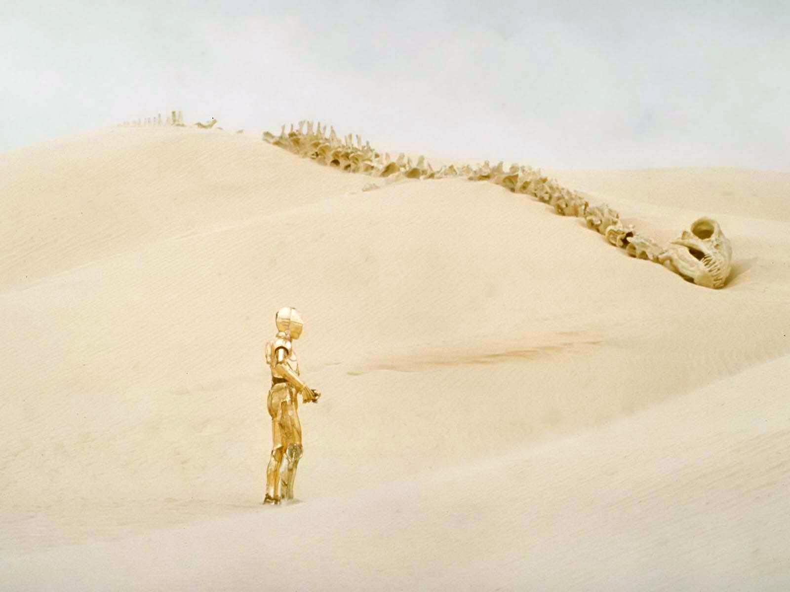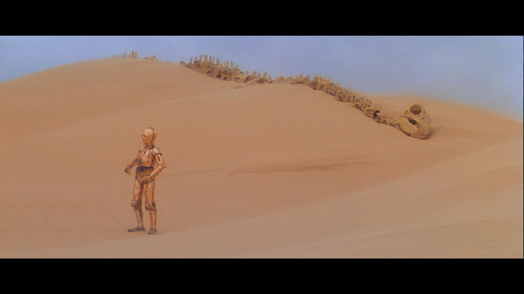 A large krayt dragon vertebrae from George Lucas' Star Wars: A New Hope. C-3PO (Anthony Daniels) walked past the skeletal remains of a krayt dragon while traversing the desert planet of Tatooine. Bone fragments were recovered from the sand dunes of the Tunisian filming location during the summer of 1999.