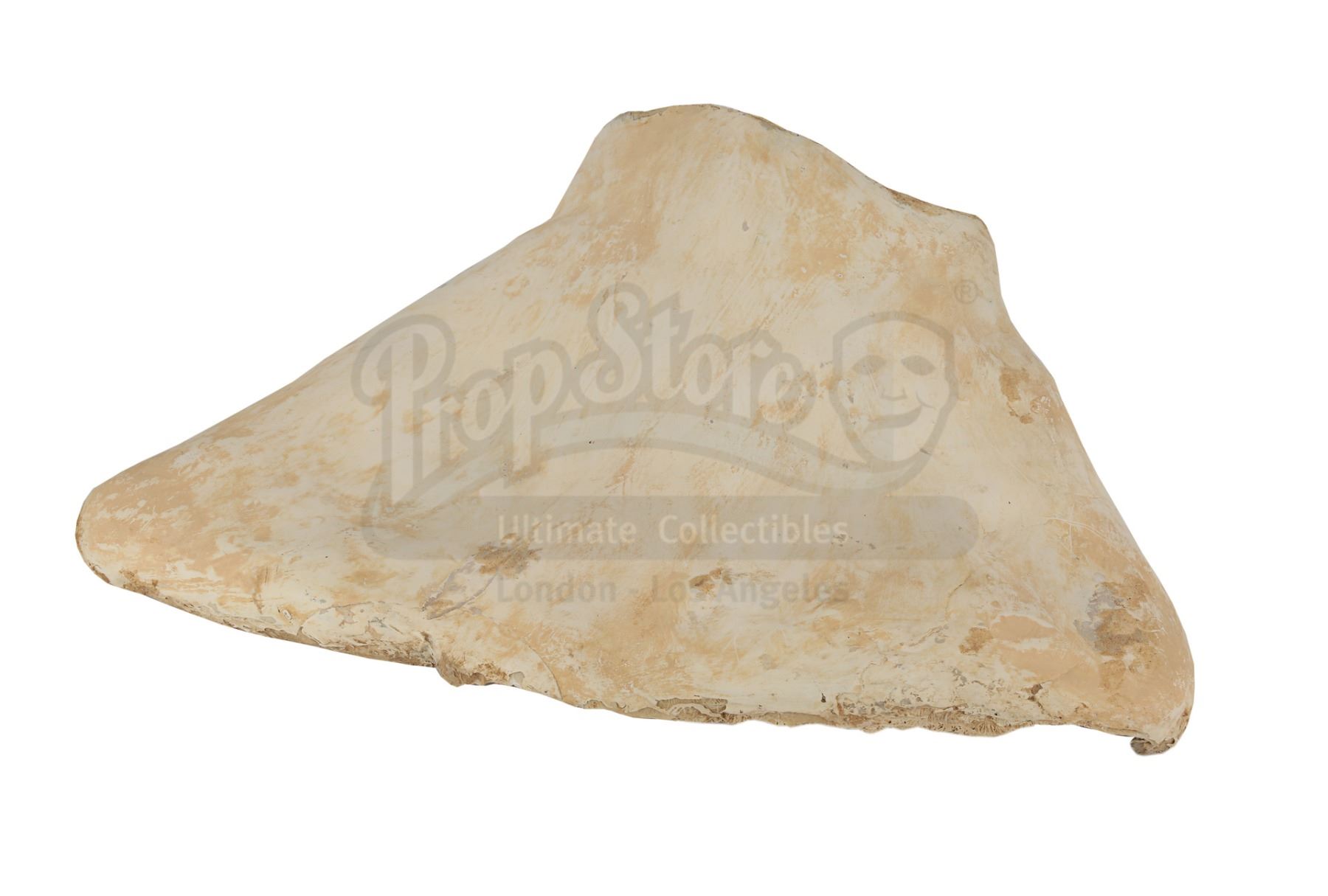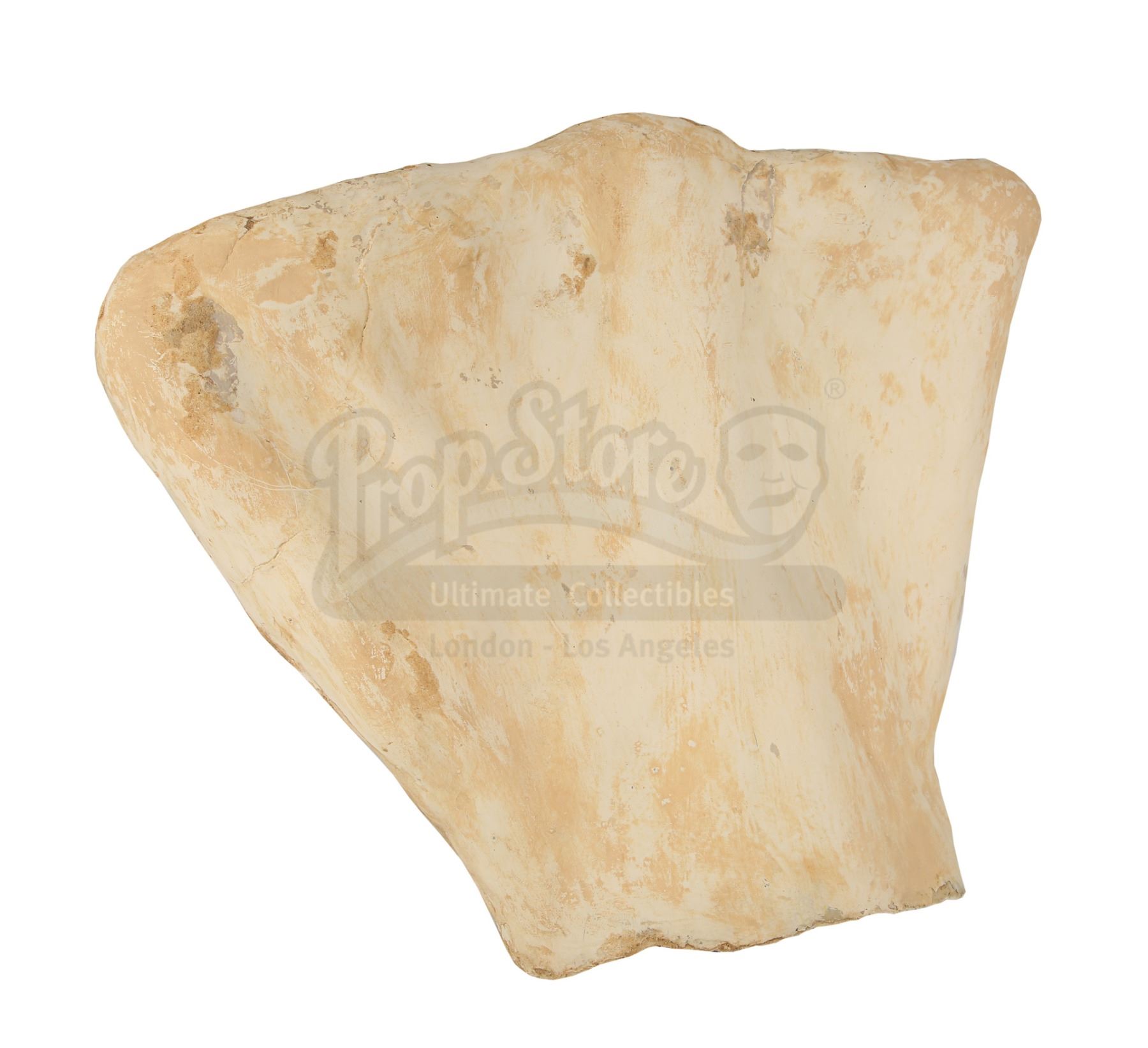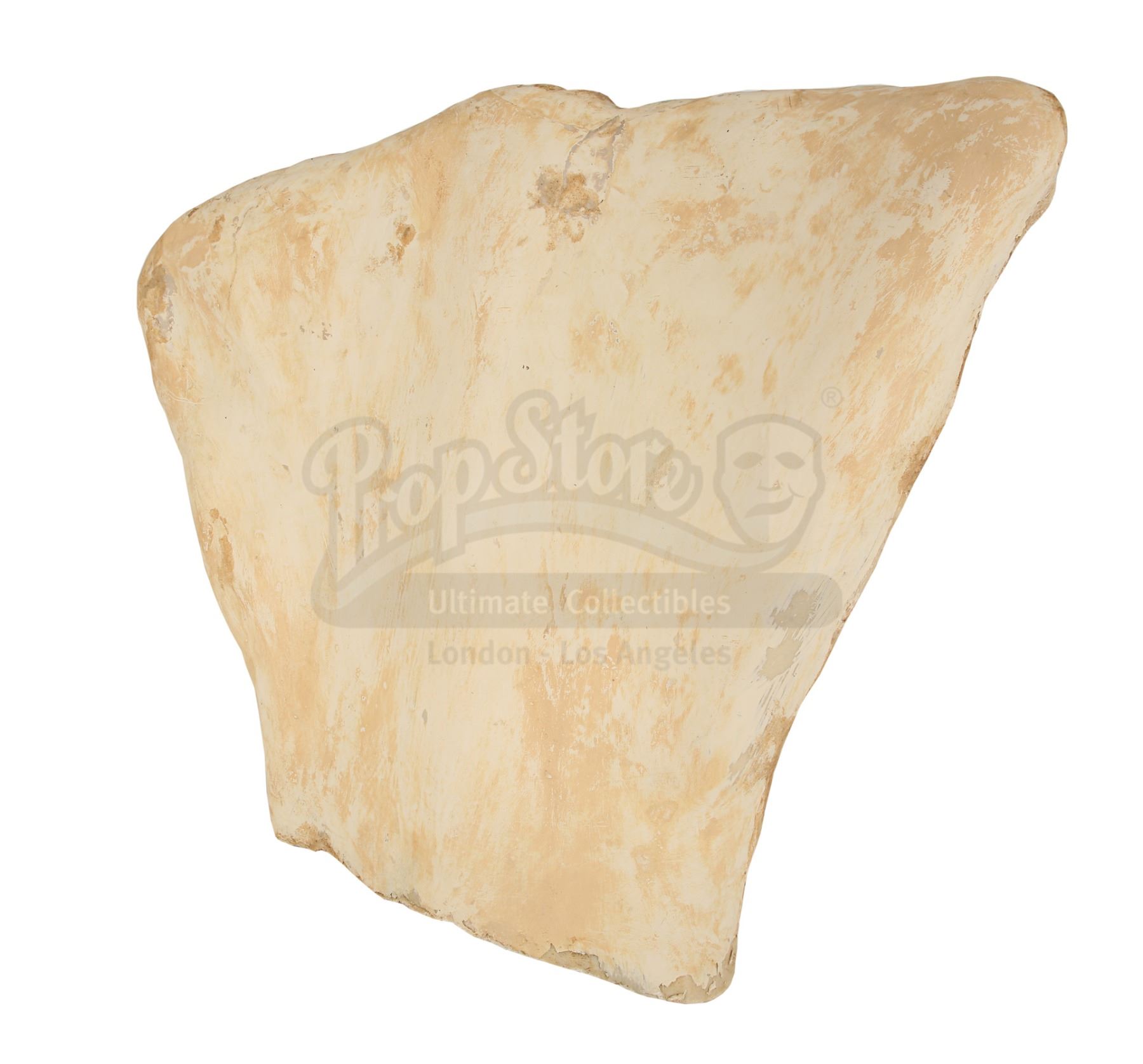 This large section of bone is made of fibreglass and displays a mottled off-white bone-coloured paint finish. There are several signs of wear, including paint wear and cracks, and remnants of sand are present, notably on the back, from its many years in the Sahara desert. Dimensions: 46 cm x 58 cm x 12 cm (18" x 22 3/4" x 4 3/4")
