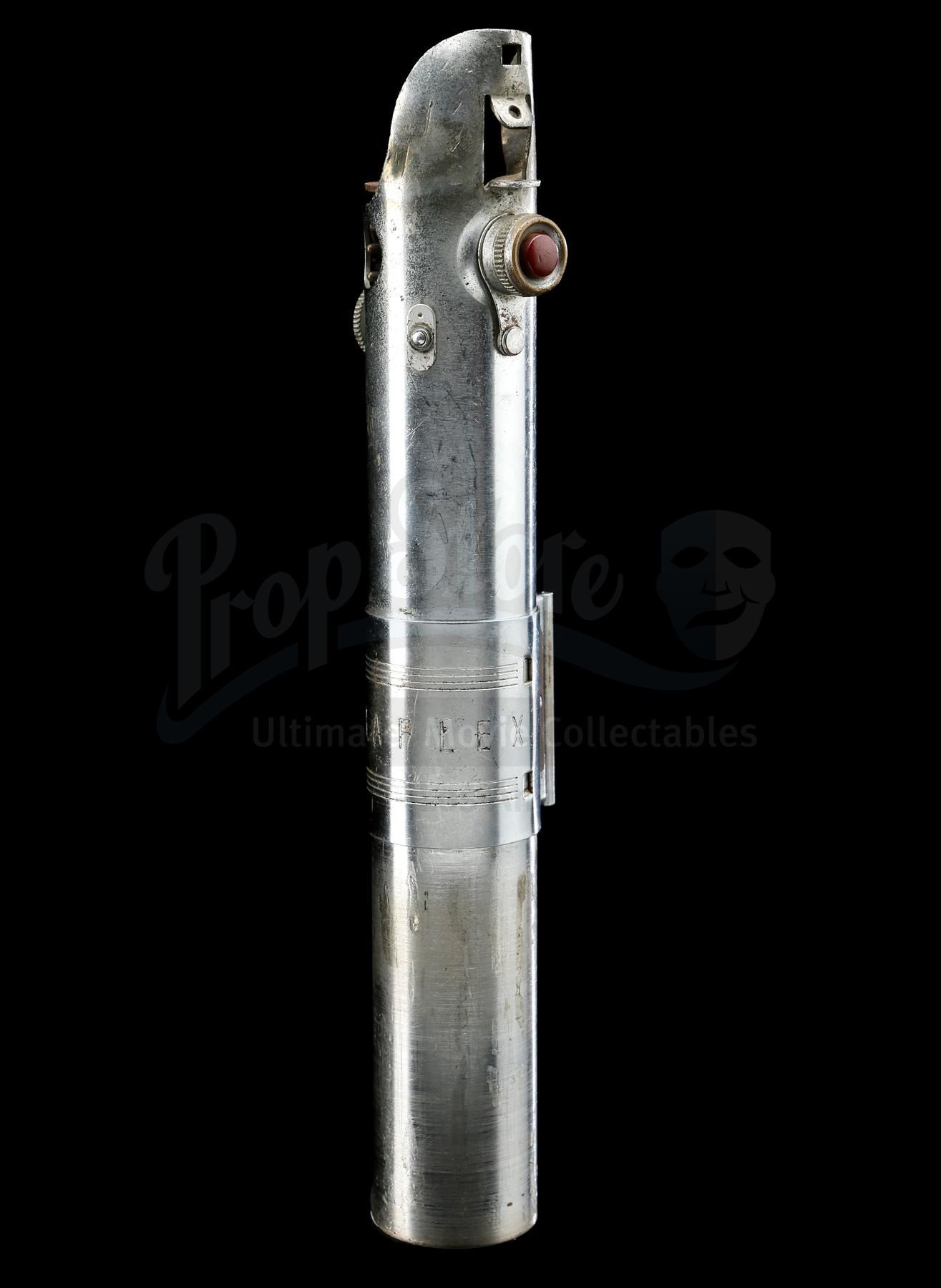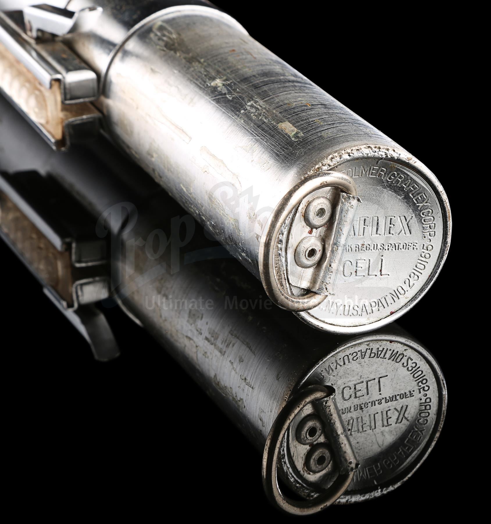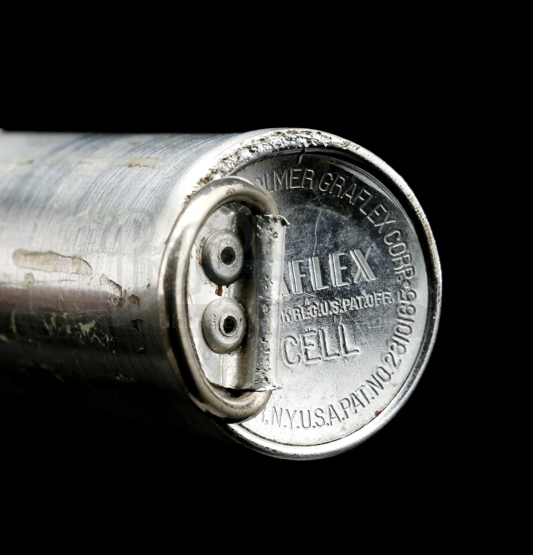 The Graflex is a "Folmer" version of the flash handle, which is the same version of Graflex used to create the hero piece seen in production photographs. This flash unit was fully converted into a prop lightsaber: a D-ring is affixed to the bottom of the handle with two pop rivets, a bubble lens strip fitted in the center clamp (with 7 bubbles, matching the hero prop), and glue residue exists on the lower half where the T-shaped grips were once attached. The red button at the top of the flash is a version with a thin band of knurling€â€different to the documented hero Graflex, but the same style of button seen on the document effects "spinning blade" prop.