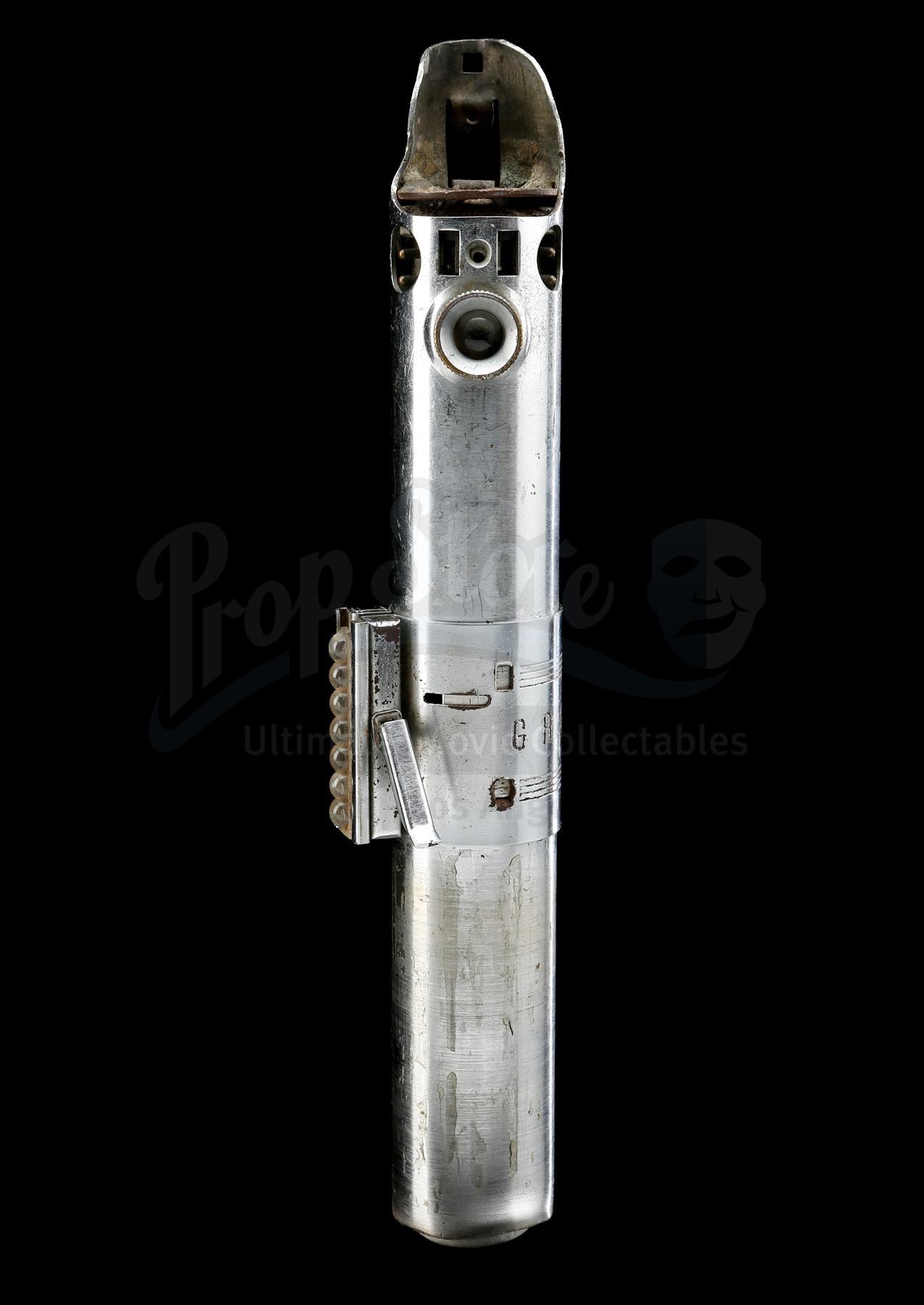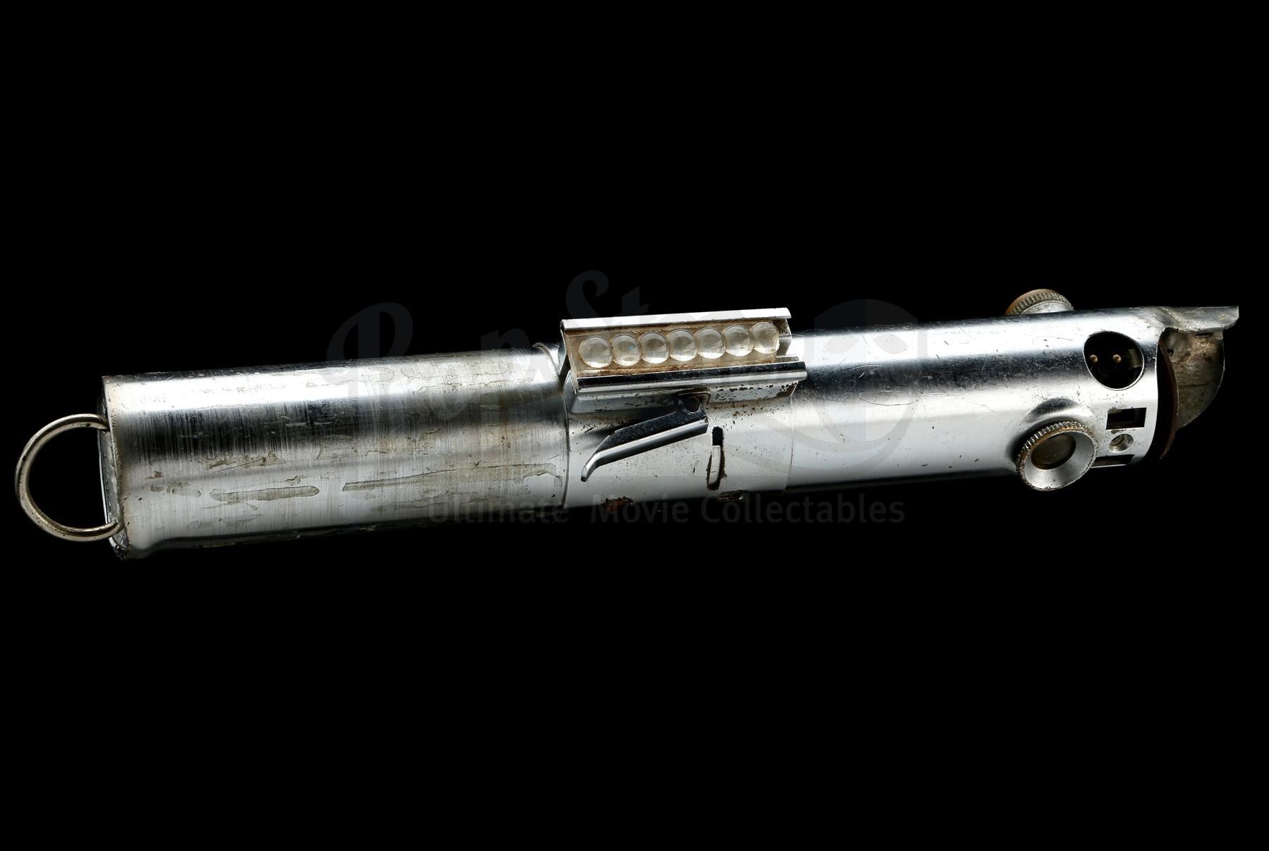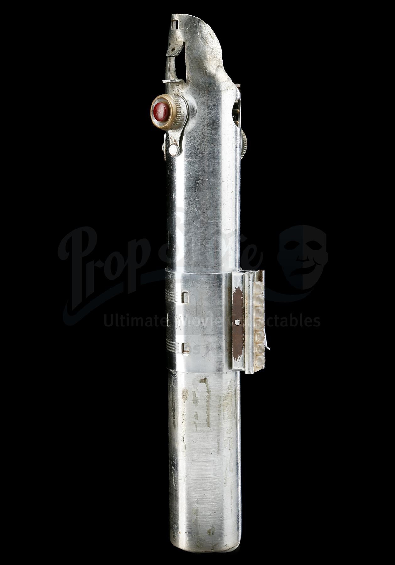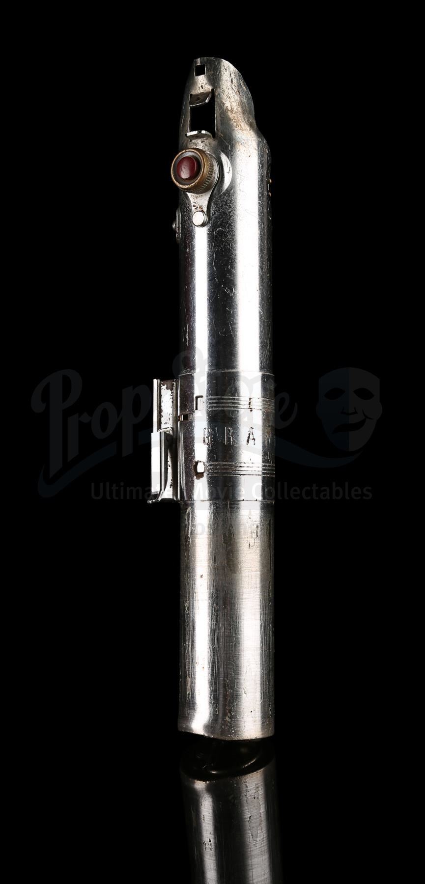 The Graflex is a "Folmer" version of the flash handle, which is the same version of Graflex used to create the hero piece seen in production photographs. This flash unit was fully converted into a prop lightsaber: a D-ring is affixed to the bottom of the handle with two pop rivets, a bubble lens strip fitted in the center clamp (with 7 bubbles, matching the hero prop), and glue residue exists on the lower half where the T-shaped grips were once attached. The red button at the top of the flash is a version with a thin band of knurling€â€different to the documented hero Graflex, but the same style of button seen on the document effects "spinning blade" prop.