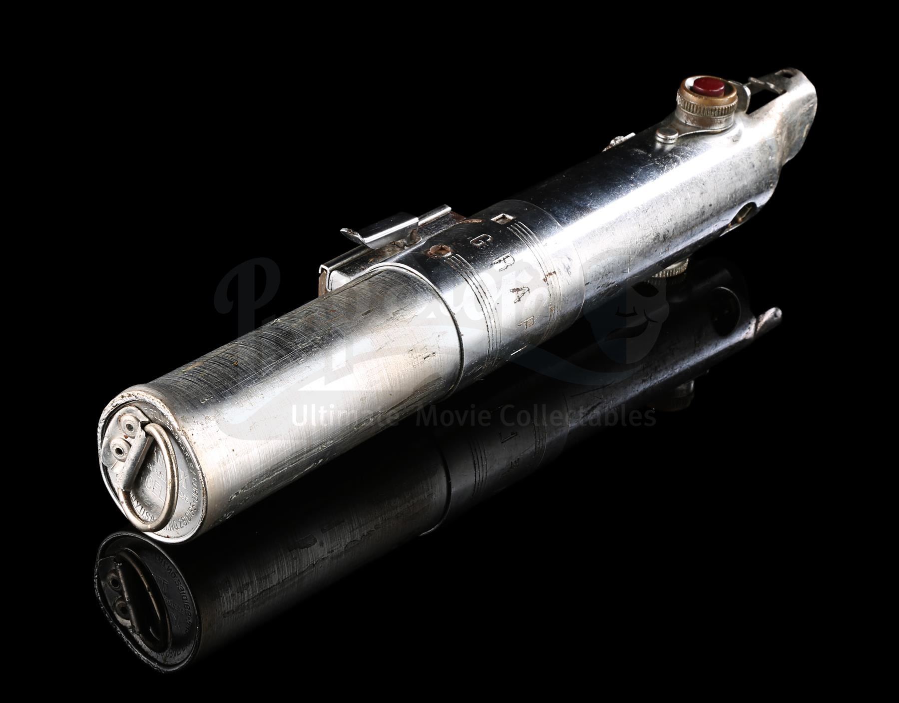 Luke Skywalker's (Mark Hamill) production-made lightsaber from the production of Star Wars: A New Hope (1977) Lightsabers are one of the most memorable props in the history of cinema, and it is well-known amongst enthusiasts that Luke's original lightsaber was built from a Graflex 3-Cell Camera Flash Attachment unit. The modifications used to turn the flash handle into the lightsaber prop were relatively straightforward: a set of black T-shaped grips were attached to the lower half of the flash, a D-ring was attached to the bottom of the unit to allow it to hang from a belt hook, and a set of plastic magnification "bubbles" from a vintage calculator display were fitted to the flashes center clamp.