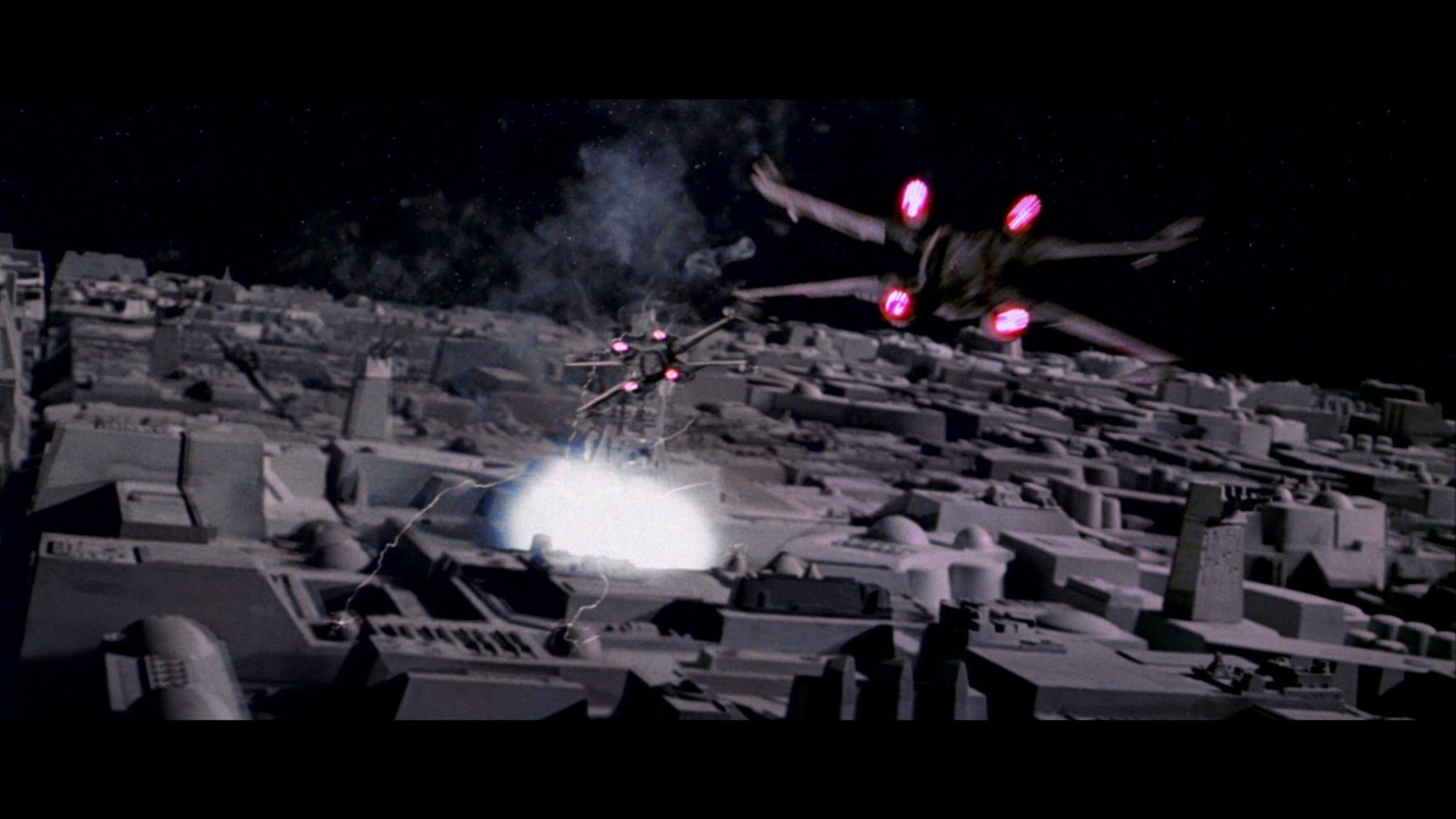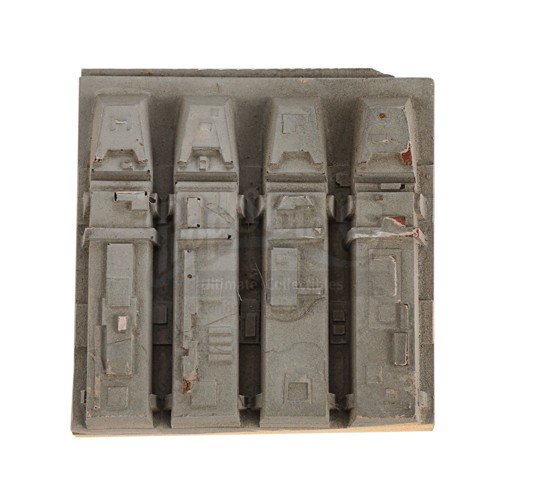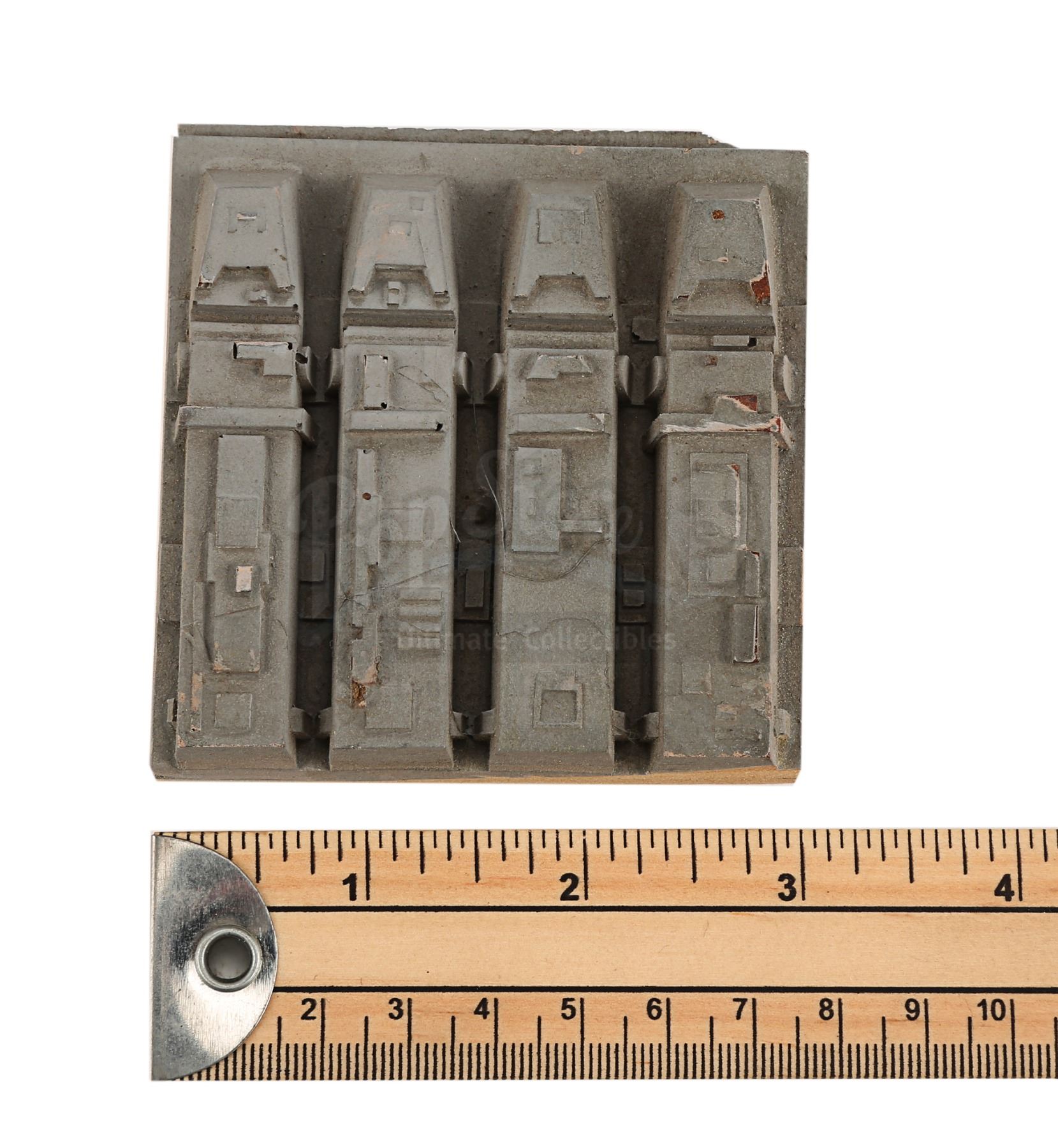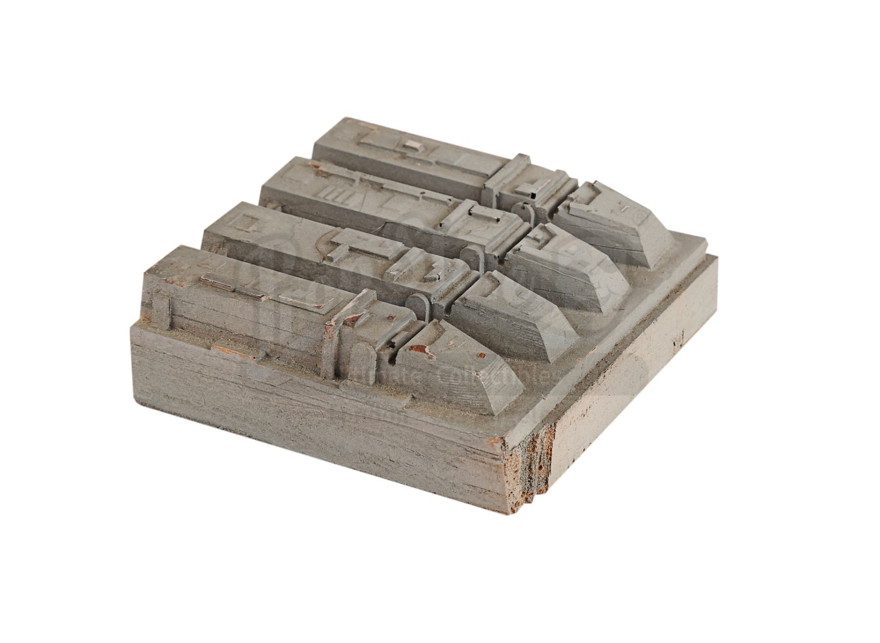 A miniature model Death Star surface section from George Lucas' Star Wars: A New Hope. This piece was part of a large-scale miniature set of the Death Star's immense surface, and was used for medium altitude shots, in which fighters flew over the Imperial station during the Rebel assault.