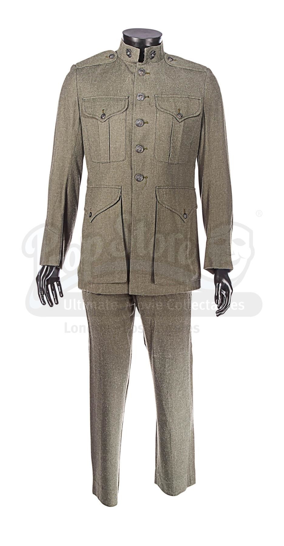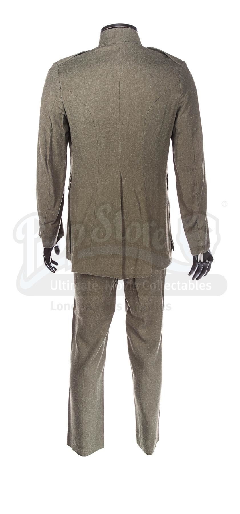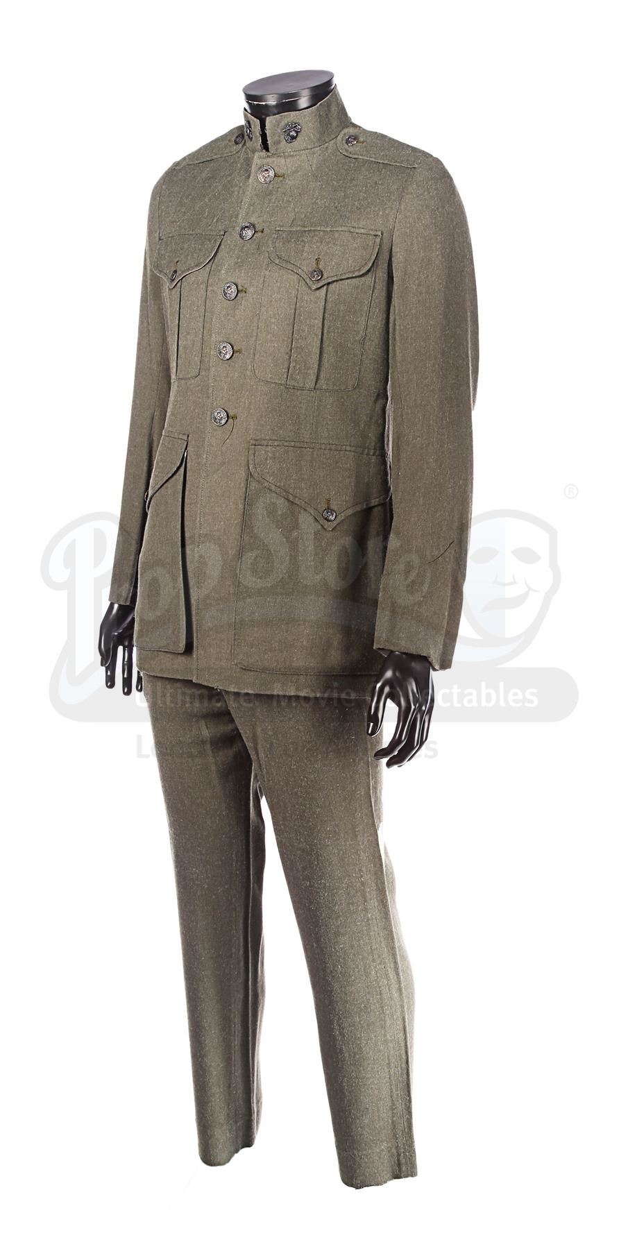 Based on vintage United States Marines dress "greens", the uniform consists of a green cotton jacket with metal buttons (a deviation from Lucas' vision of a universe without visible fasteners) and collar insignia emblazoned with the US Marine emblem; a pair of green cotton trousers with plastic buttons for suspenders; and a green canvas belt with a metal buckle and size adjusters. The uniform shows signs of wear: the belt is worn with frayed edges, the jacket buttons are slightly discoloured, and there is a thin sun stain on the inside.