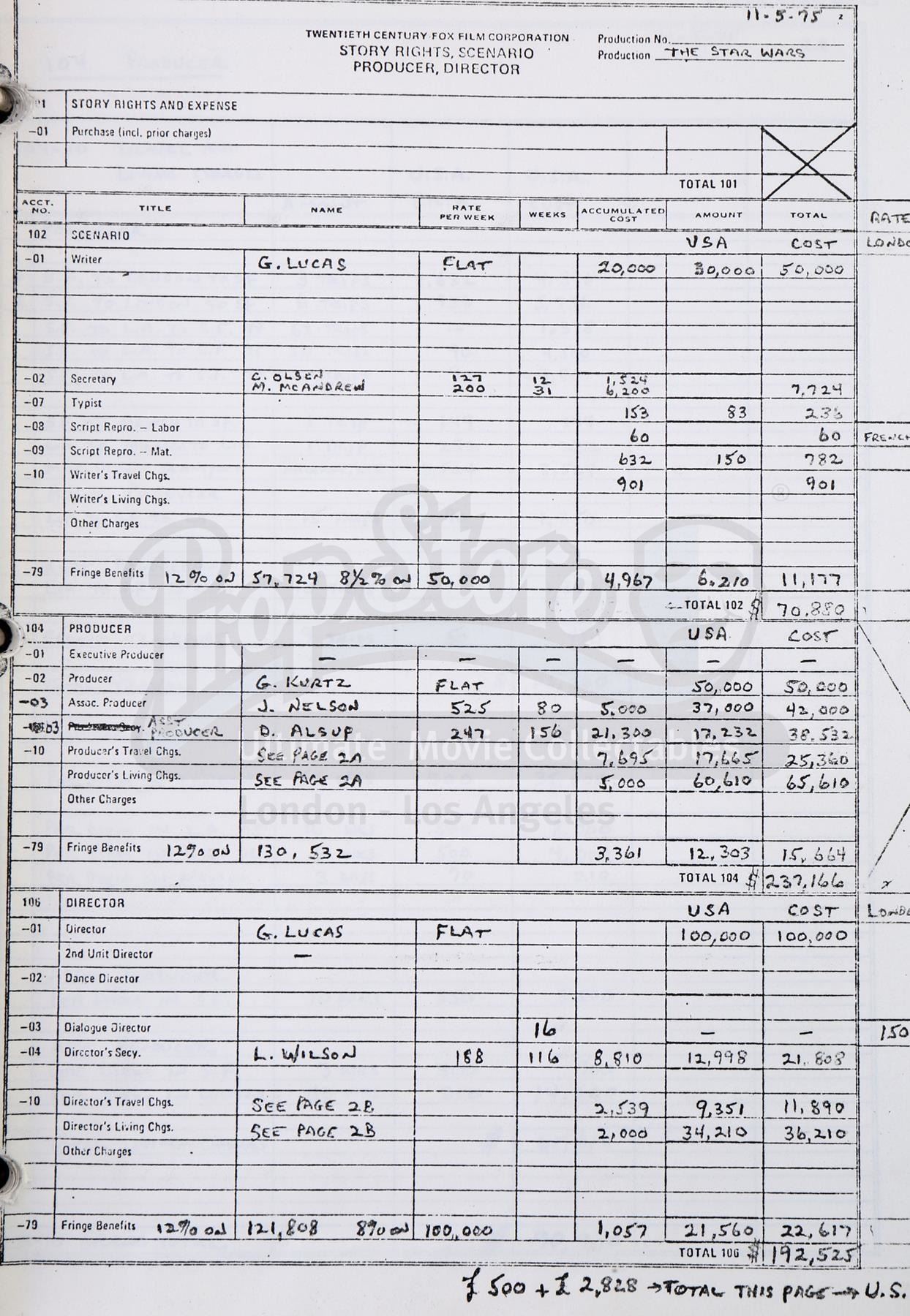The blue paper folder contains an 80-page original, typewritten total production budget of $8,228,228 for A New Hope, which was compiled 15 March 1976 with additional pages dated 1 February 1976. Based on a 20th Century Fox template, this budget features cost information for key cast and crew, a cost breakdown for all locations and studio sets, ILM's "miniatures" budget, a set decoration budget, a props budget (noting 20 laser swords coated with "3M reflective material[21]", among other things), a wardrobe budget, and more. Dimensions (each): 30 cm x 28 cm x 12.75 cm (11 3/4" x 11" x 5")