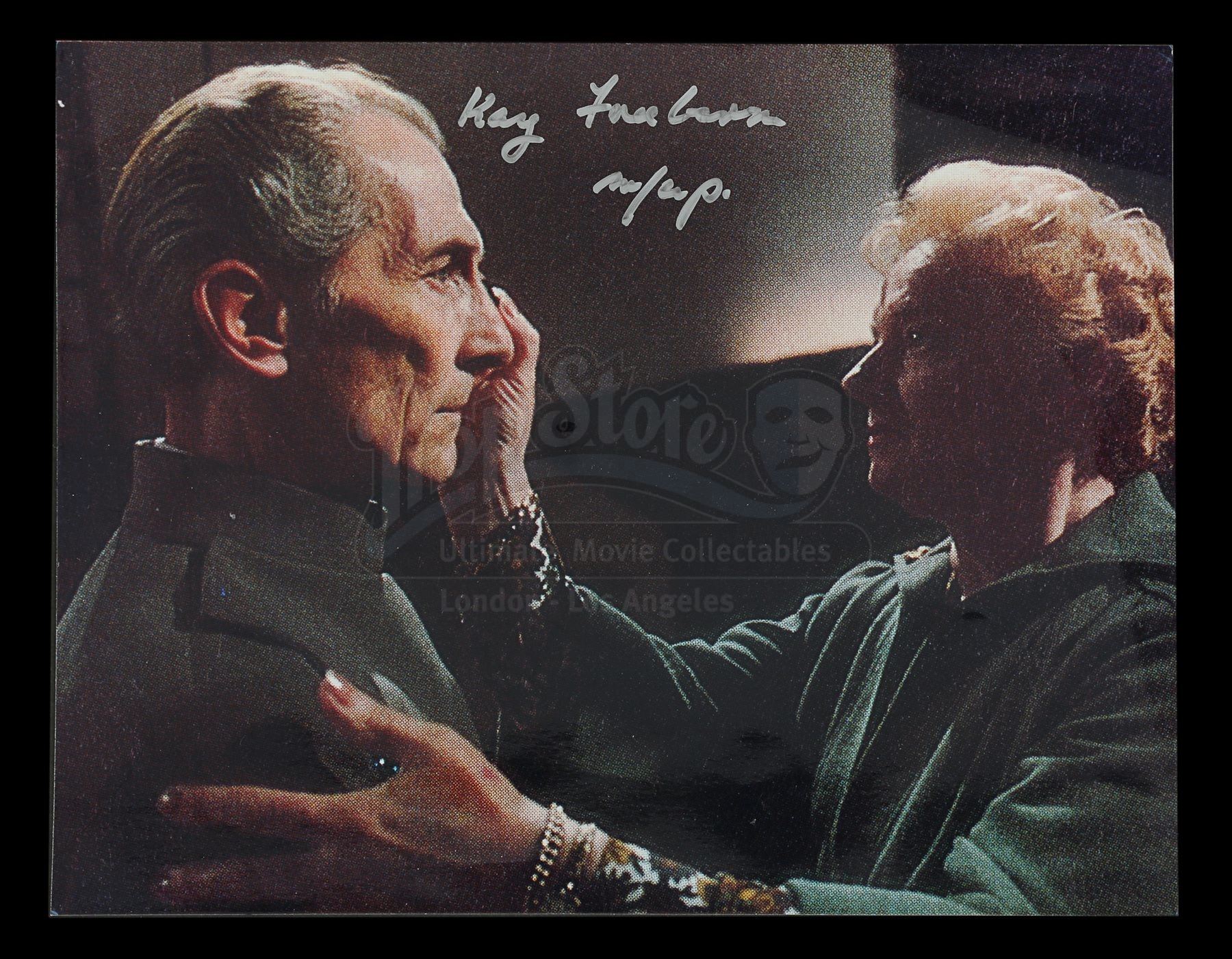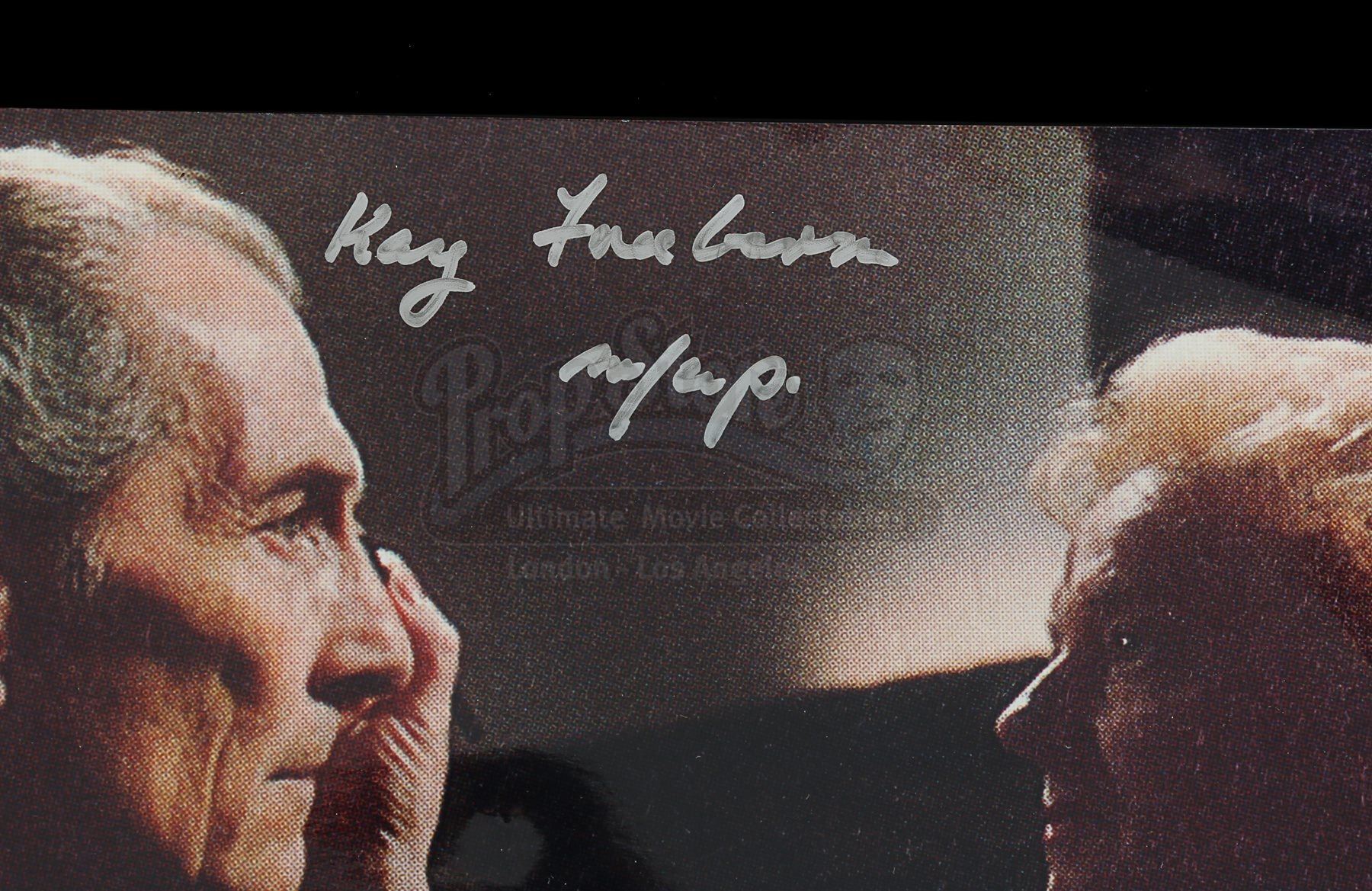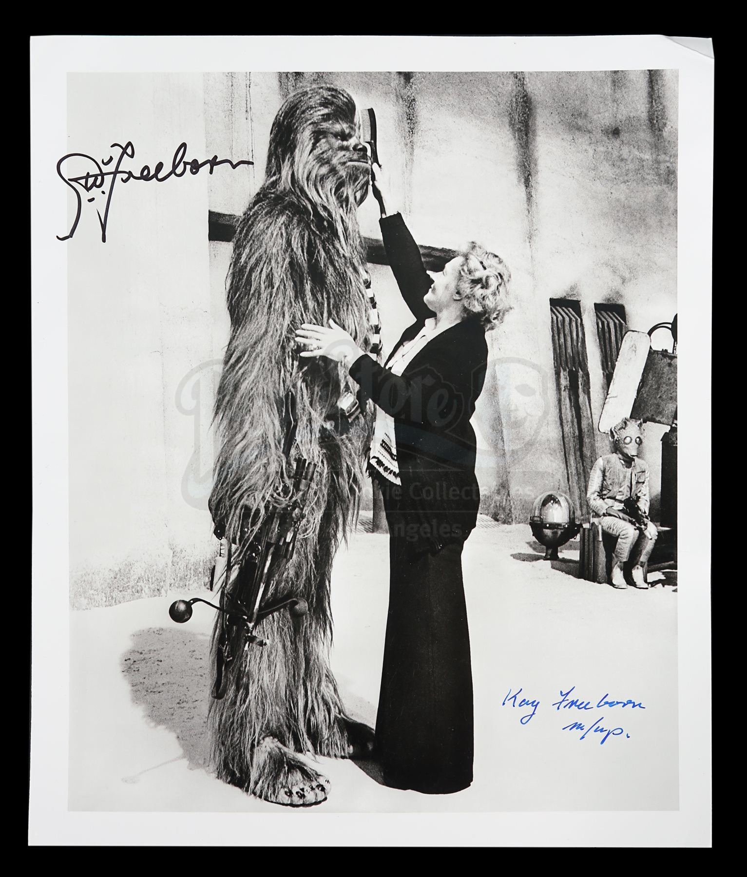 A set of four autographed photos from George Lucas’ Star Wars: A New Hope. Printed on photographic paper, each image shows various characters — including Chewbacca (Peter Mayhew), Grand Moff Tarkin (Peter Cushing) and a group of Mos Eisley aliens — having prosthetics and make-up applied on set. The photos are all autographed by make-up artist Kay Freeborn and renowned make-up supervisor Stuart Freeborn in black, blue and silver-coloured marker pen. The set displays very minor surface scratches and a minor crease line, while one of the photos displays a light glue residue mark. Dimensions (larger photos): 28 cm x 23 cm (11" x 9")