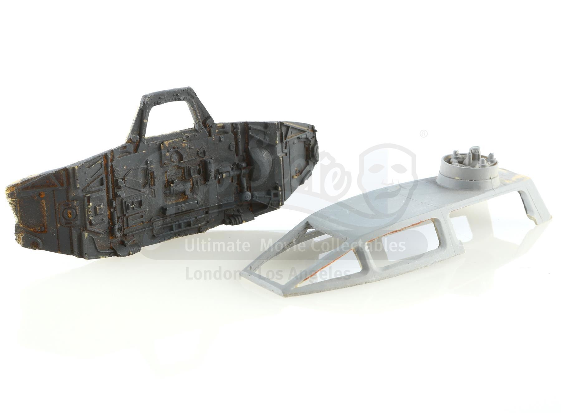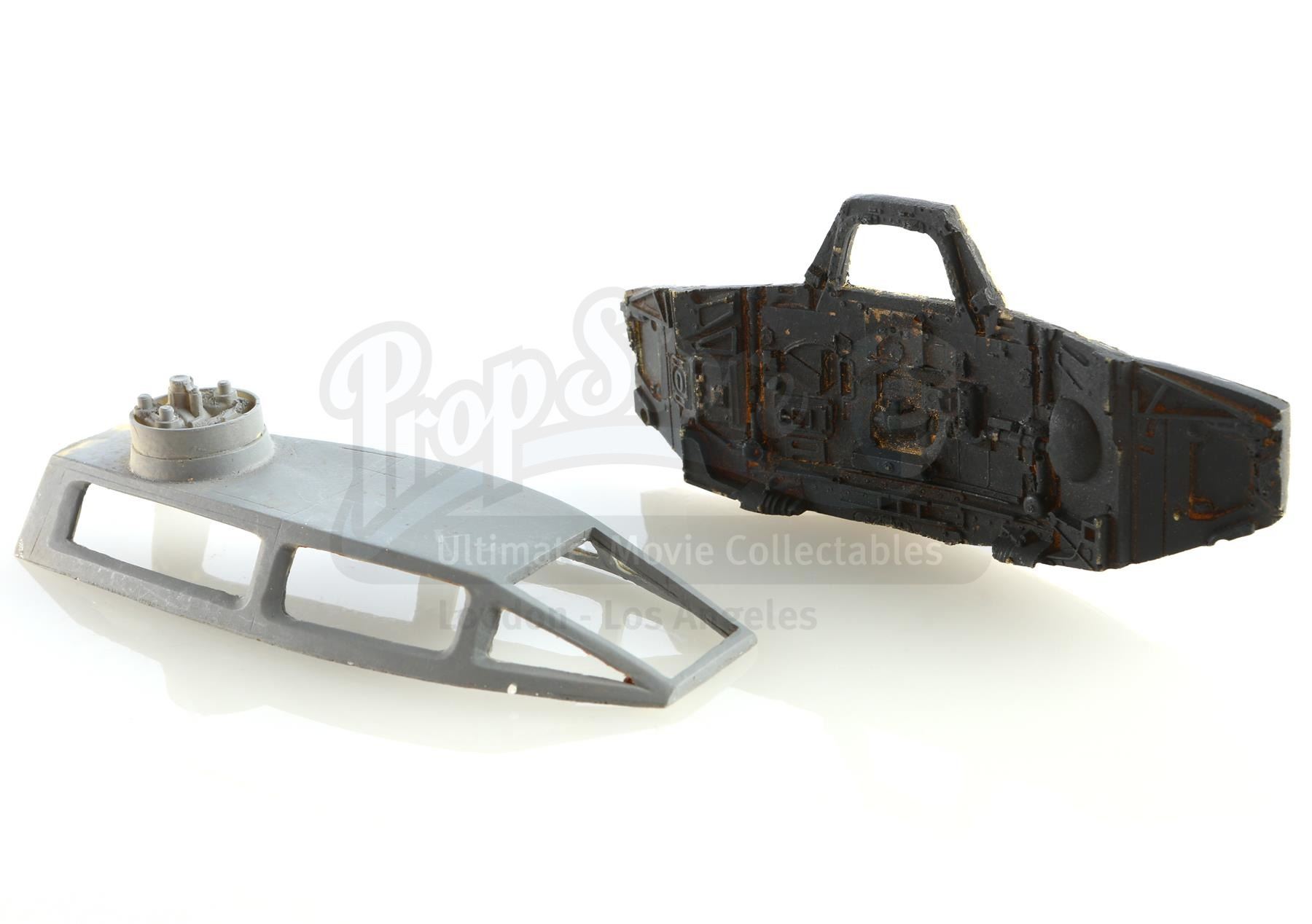The components include a cast foam rear cockpit piece, which is painted black on the front and unpainted on the reverse, and a grey styrene cockpit canopy master pattern mould model. This master pattern was moulded to create the cast parts used on final models manufactured at ILM. Each exhibits signs of use, including residual traces of red moulding silicone rubber on the cockpit canopy. Dimensions (cockpit canopy): 13.5 cm x 6.5 cm x 2 cm (5 1/4" x 2 1/2" x 3/4"); (rear cockpit): 13.5 cm x 4 cm x 4 cm (5 1/4" x 2" x 1 1/2")