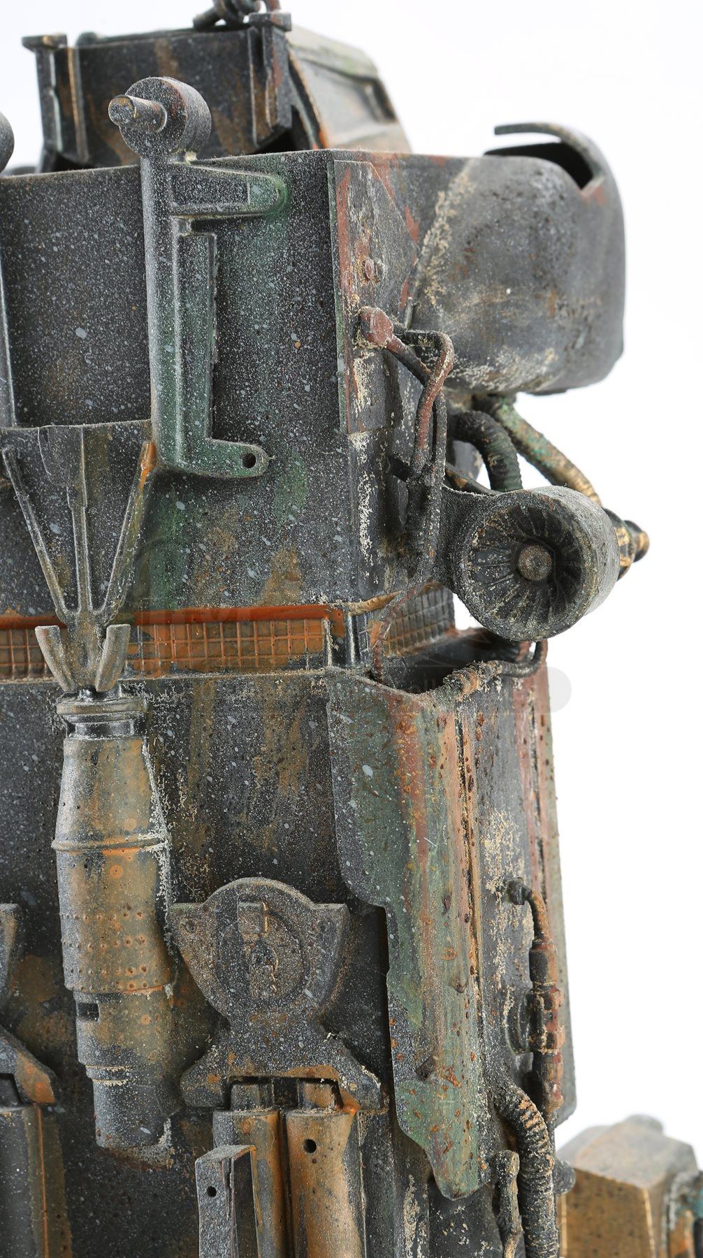 This makeshift throne maquette was made by Industrial Light & Magic and is constructed from multiple resin and plastic components. Notably, this piece is kit-bashed from components recognisable as belonging to a 74-Z speeder bike. It is painted to resemble rusting metal. The piece is presented on a custom-made acrylic base which has a note attached to the bottom. This note is addressed to Tom Smith, a producer of the film, and features a hand-drawn sketch of an Ewok by model maker Bill George, along with a thank you. The piece shows minimal wear and is in very fine overall condition. Dimensions (on base): 20.5 cm x 16.5 cm x 28 cm (8” x 6 ½” x 11”)