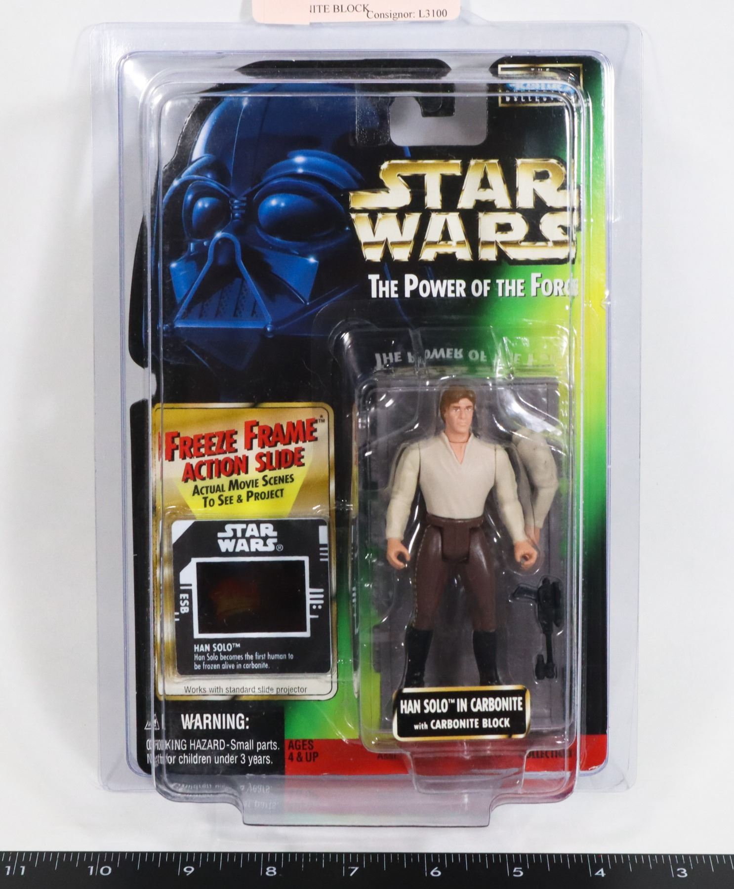 BLOCK FIGURE IN PROTECTIVE STAR CASE. THE POWER OF THE FORCE1997. WITH FREEZE FRAME ACTION CARD. SPECIAL NOTE: RARE CARD ERROR- CARD CONTAINS EXTRA HAN SOLO ARM.