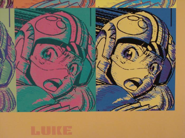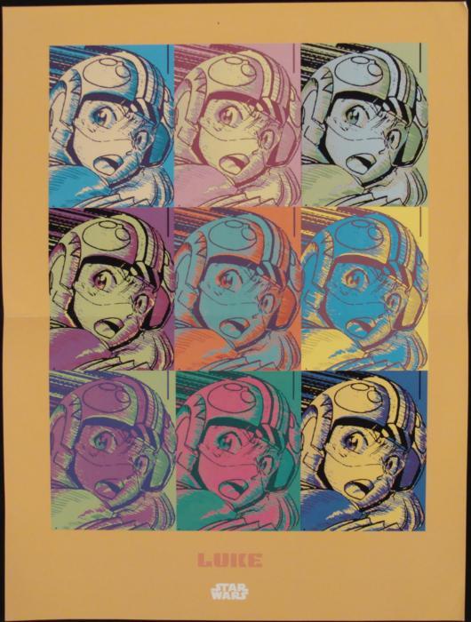 This is a rare prototype mockup version of a Star Wars fine art print, complete with printer's marks in the margins. At first glance this poster may look like Speed Racer, but a closer look at the helmet reveals that this is Luke Skywalker in an anime version.Medium: Full color print on paperSize: 13 x 19 inchesDate: 1/27/05Condition: Good, with center fold, and corner creasing in the marginsWe are not sure if this version of the poster was printed, or if it ever was produced at all. We are sure that this mockup is very rare, and probably the only such proof in existence for this design. This poster presents an unsual anime version of Luke, as well as a fine piece of Andy Warhol style Pop Art.